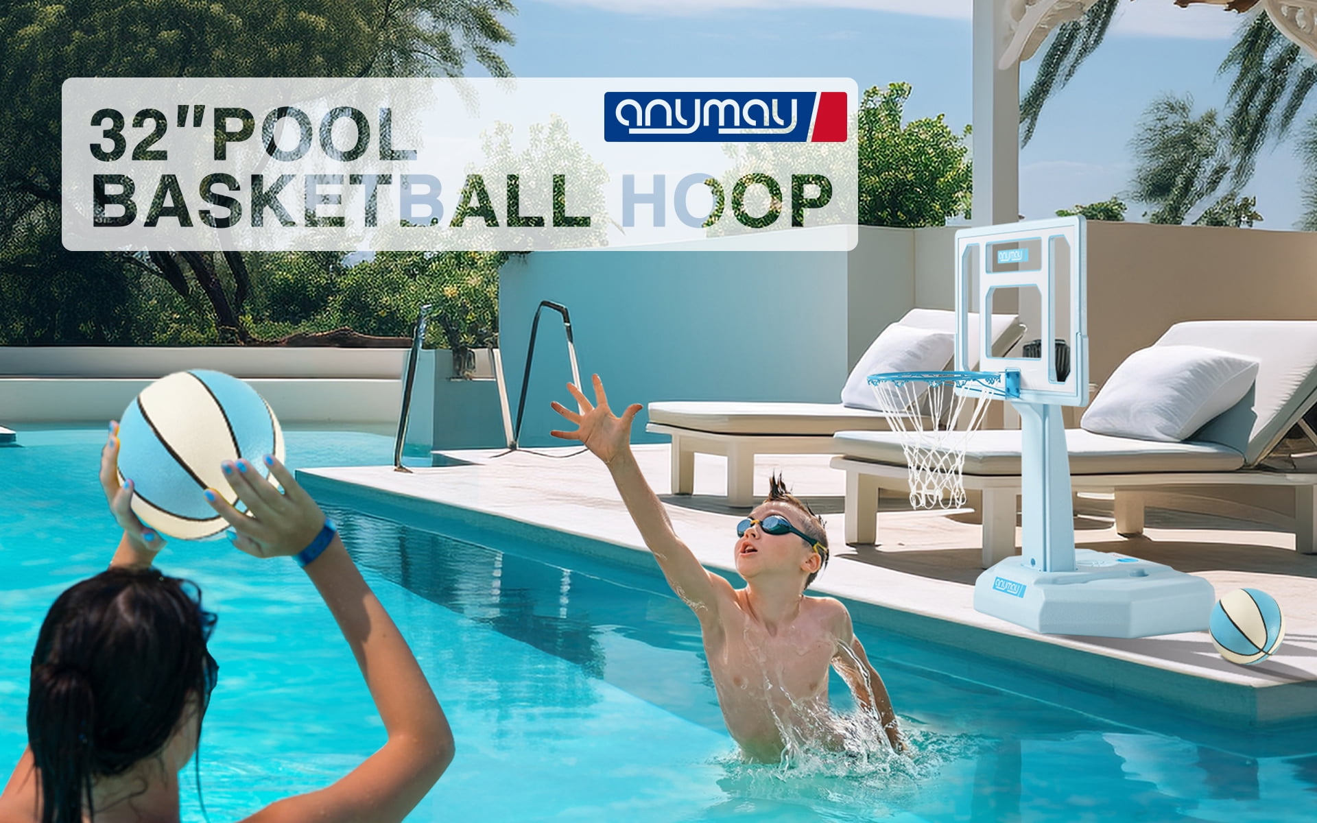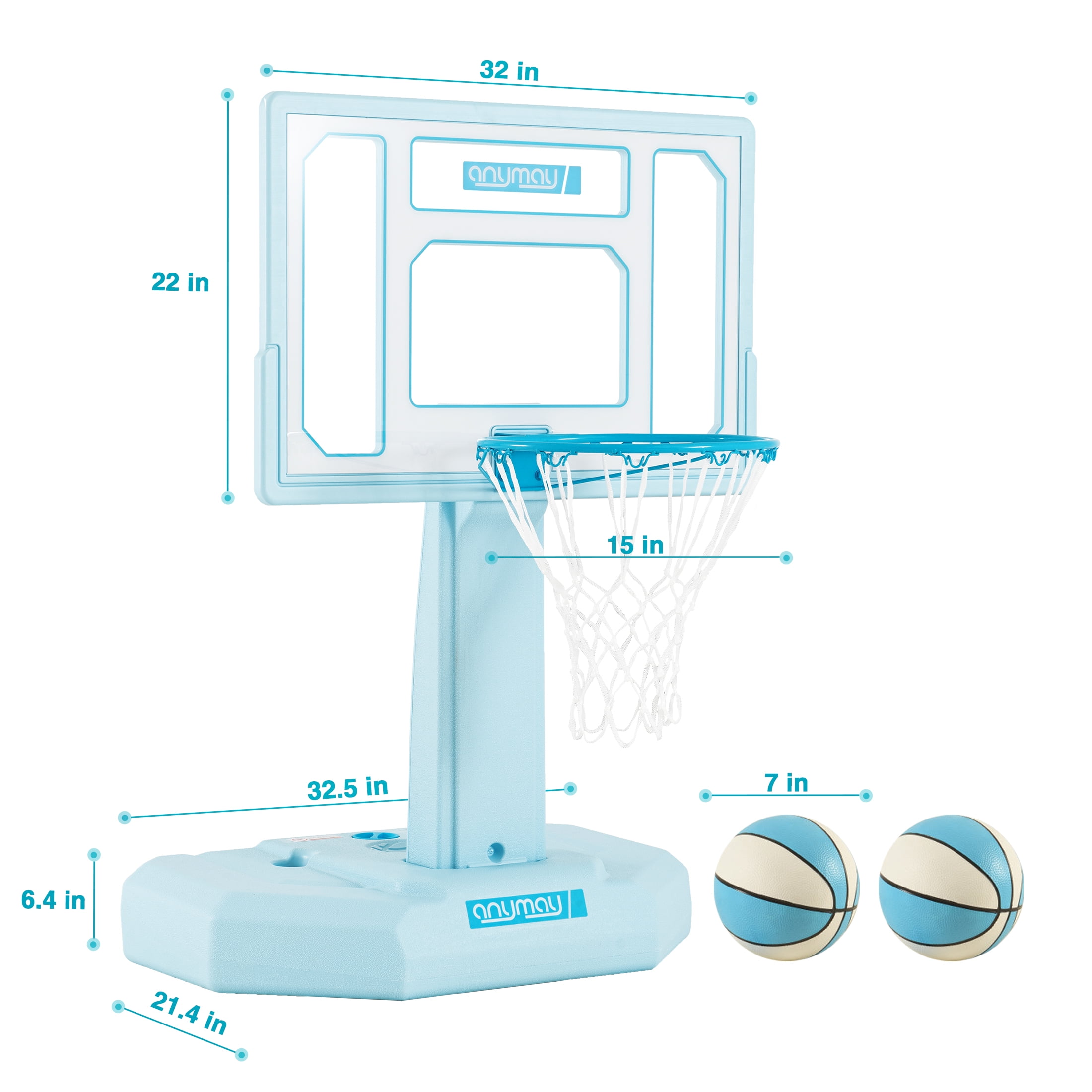Enhance your poolside basketball experience with ANYMAY’s exclusive design, featuring a range of improvements from color options to structural integrity. Unlike fragile inflatable hoops, ANYMAY offers a super durable and heavy-duty portable basketball hoop. Features: – Portability: Easily move and set up the portable basketball hoop wherever you want. – Durability: ANYMAY’s hoop is made with high-quality materials for long-lasting use. – Regulation-Size waterproof basketball: Experience an authentic basketball game with a regulation-size waterproof basketball included in the package. – Rust-Resistant: The hoop and screws are made of 304 stainless steel to prevent rust, even near water. – Easy Assembly: Setting up the ANYMAY basketball hoop is quick and hassle-free. – Complete Package: Includes 1 Pool Basketball, 2 inflatable water basketballs, and a ball pump for a full game experience. Upgrade your poolside entertainment with ANYMAY’s portable pool basketball hoop, designed for durability and an authentic basketball experience. backboard_material:PE basketball_backboard_size :32inch age_group:All age