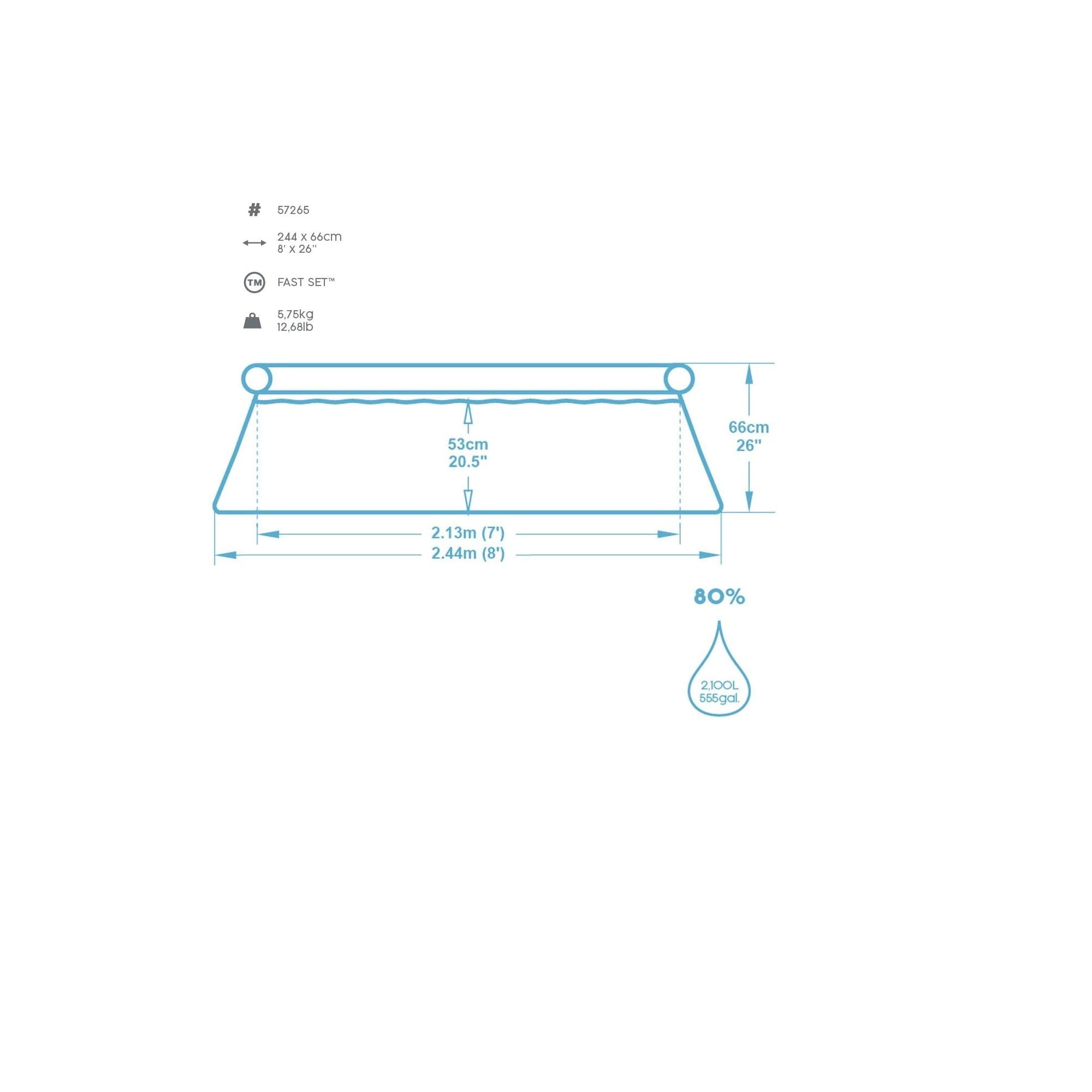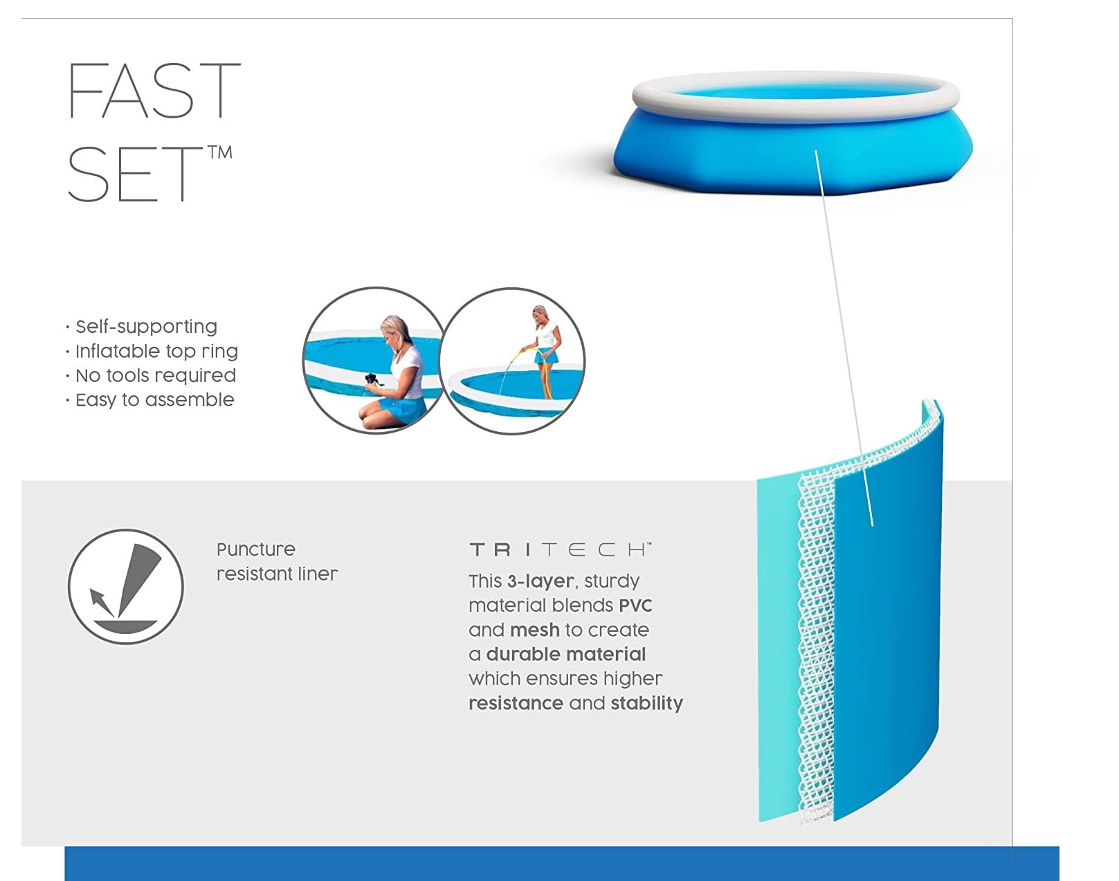 8 foot round inflatable easy set swimming pool Tri-Tech sidewalls made with 3 layers of PVC and mesh for higher resistance and stability Convenient and easy assembly within 10 minutes; No tools required Drain plug connects to garden hose so water can be drained away Includes a pool filter pump; ladder and pool cover not included