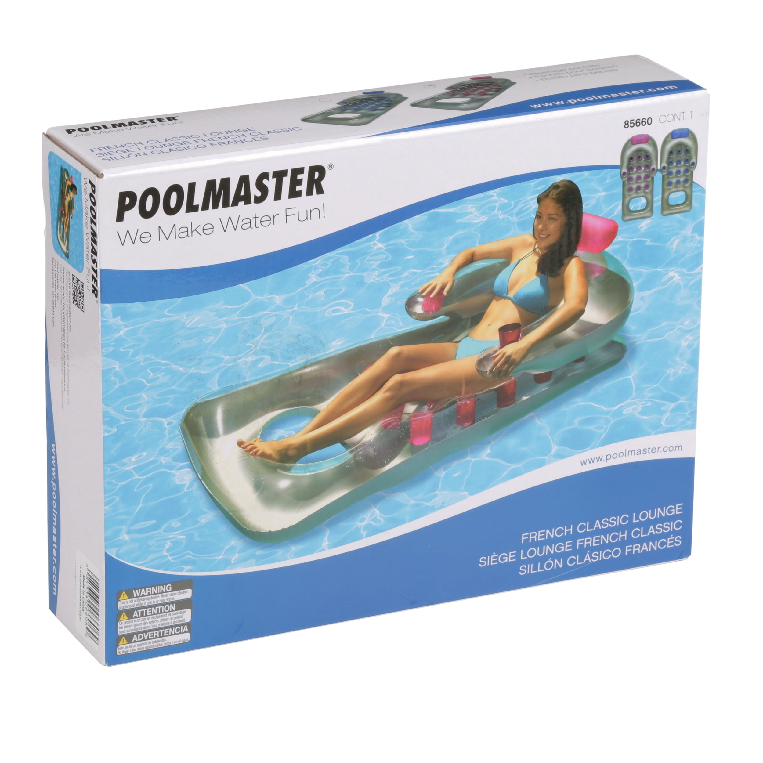 Poolmaster French Classic Lounger: Dual beverage holders Water-hole cooling leg rest 15 contrasting color French pockets Available in two colors: Pink or Blue Size: 66″ Long x 31″ Wide, deflated Gauge: 11g (0.275mm) Recommended for adults