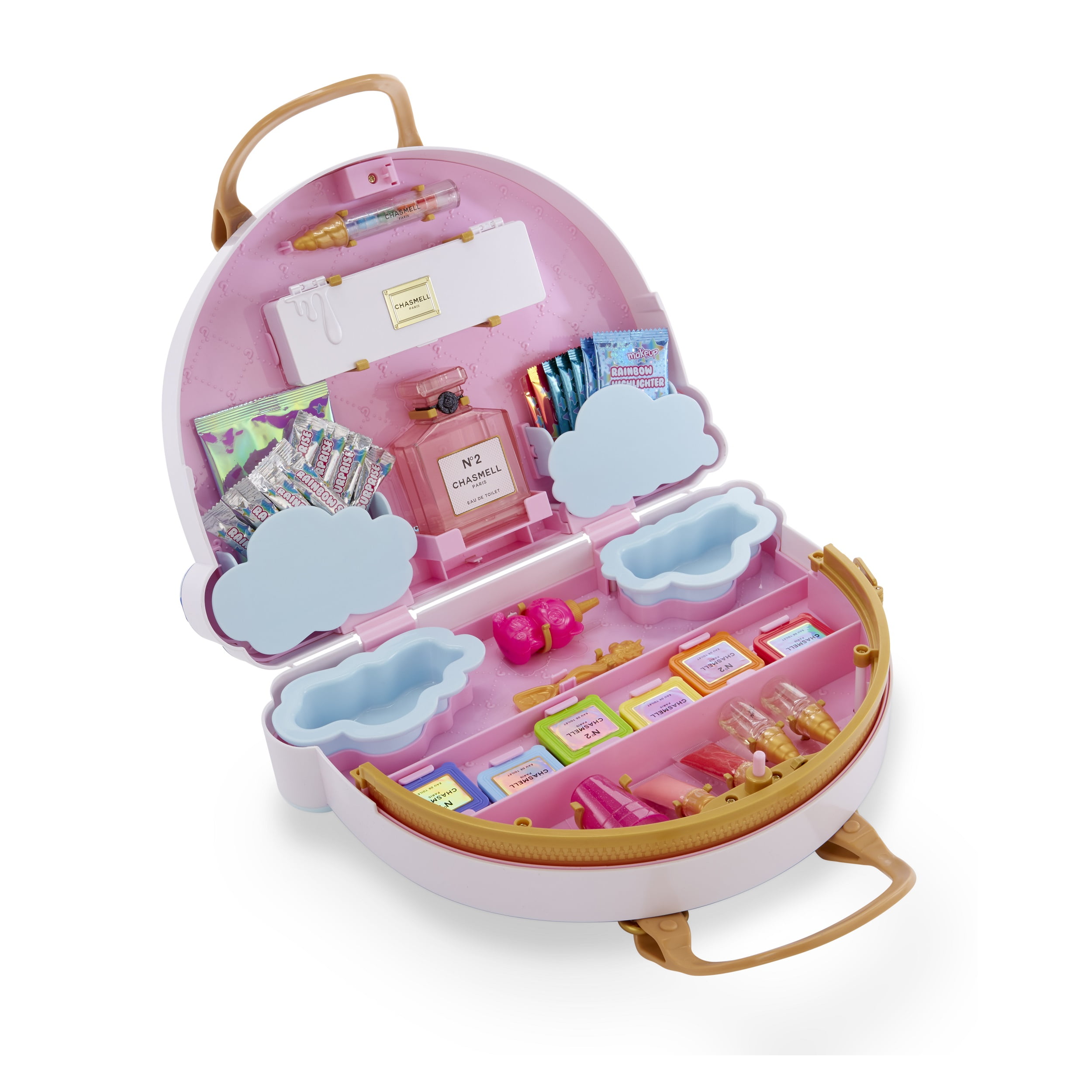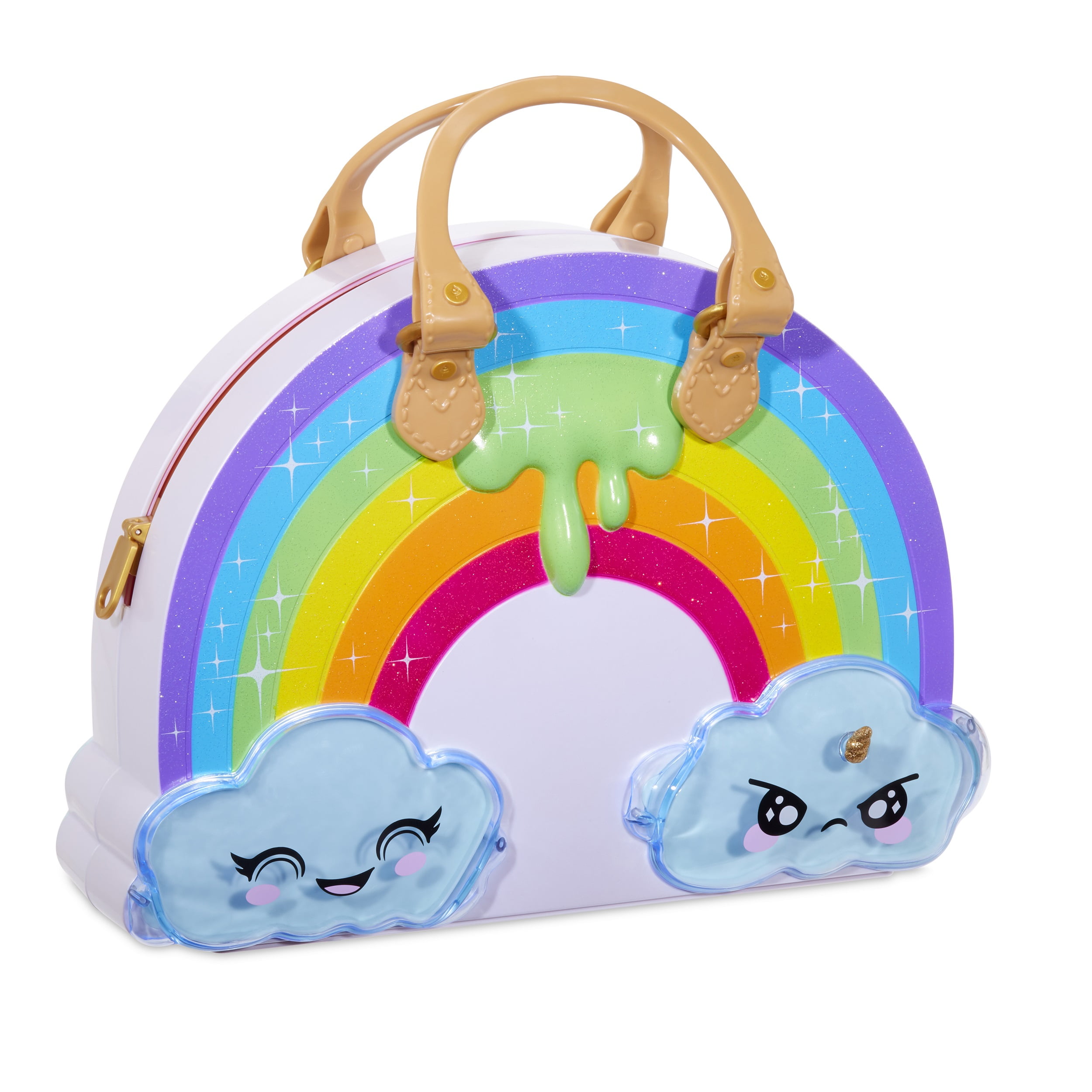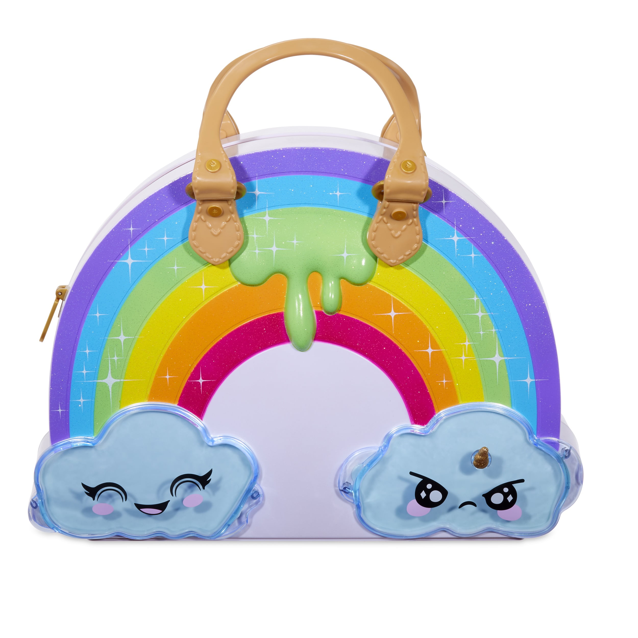 Give slime a rainbow makeover with Poopsie Chasmell Rainbow Slime Kit. Now, D.I.Y. slime can be customized in a whole new way by mixing in makeup to create a beautiful rainbow of slimes. The Chasmell Rainbow Slime Kit features 35+ surprises, including colorless D.I.Y. slime, along with a rainbow of lipsticks, lip glosses, and eye shadows to mix into slime to change the color. The beautiful rainbow of makeup can also be used on you, so both you and your slime get a makeover! Transform slime again by mixing in Rainbow Magic, Rainbow Sparkle, or Rainbow Crunch. Then, store slime in the included airtight storage case or in the adorable cloud compartments on the outside of the bag. The kit also includes 2 surprise scents, so the slime smells as amazing as it looks. Each Chasmell Rainbow Slime Kit includes 9 D.I.Y. slime powders, 6 lipstick colors, 6 eyeshadows, 2 lip glosses, 2 highlighter packets, 3 Rainbow Magic packets, 2 Rainbow Sparkle, 1 Rainbow Crunch, 2 surprise scents, spoon, airtight container, measuring cup, and exclusive bottle.