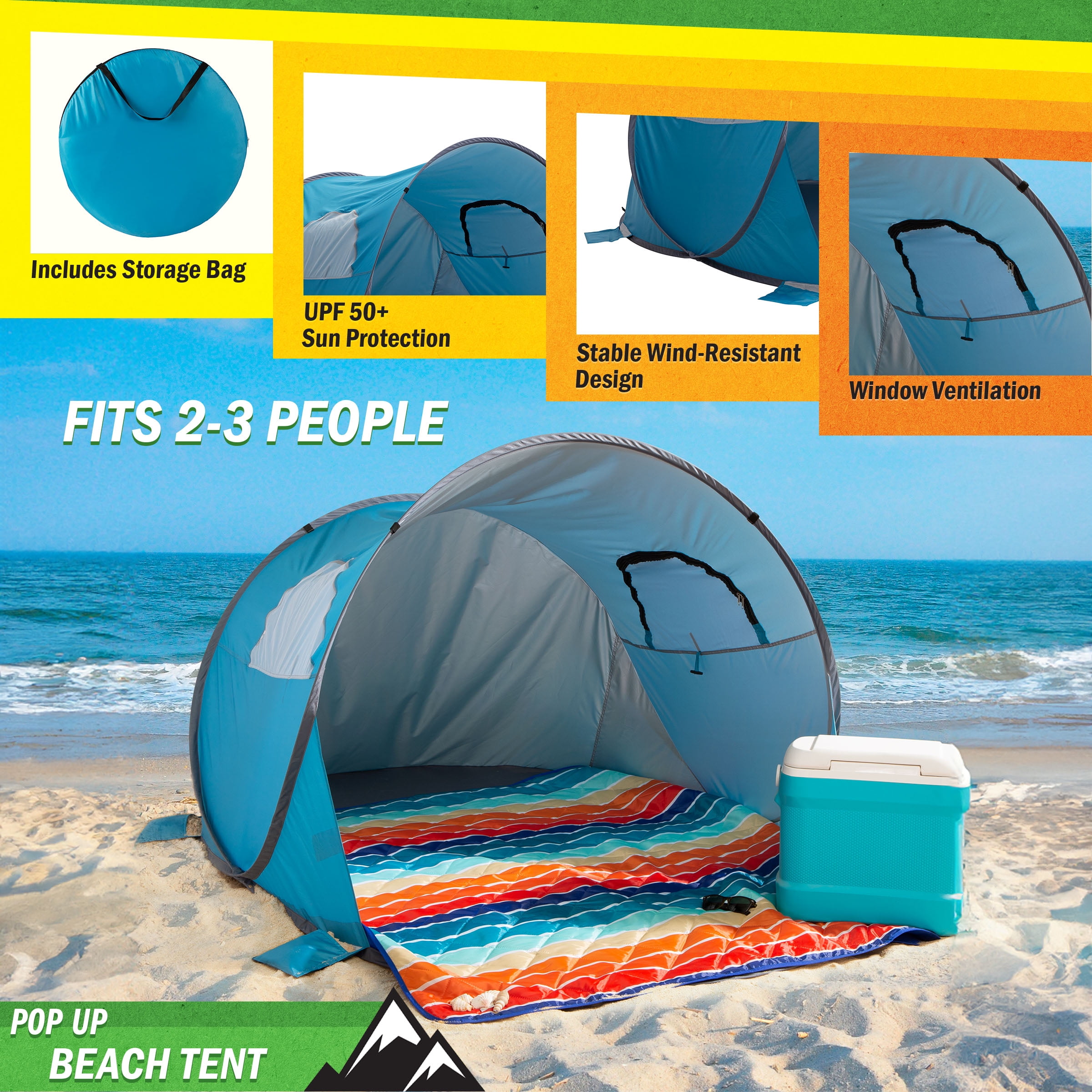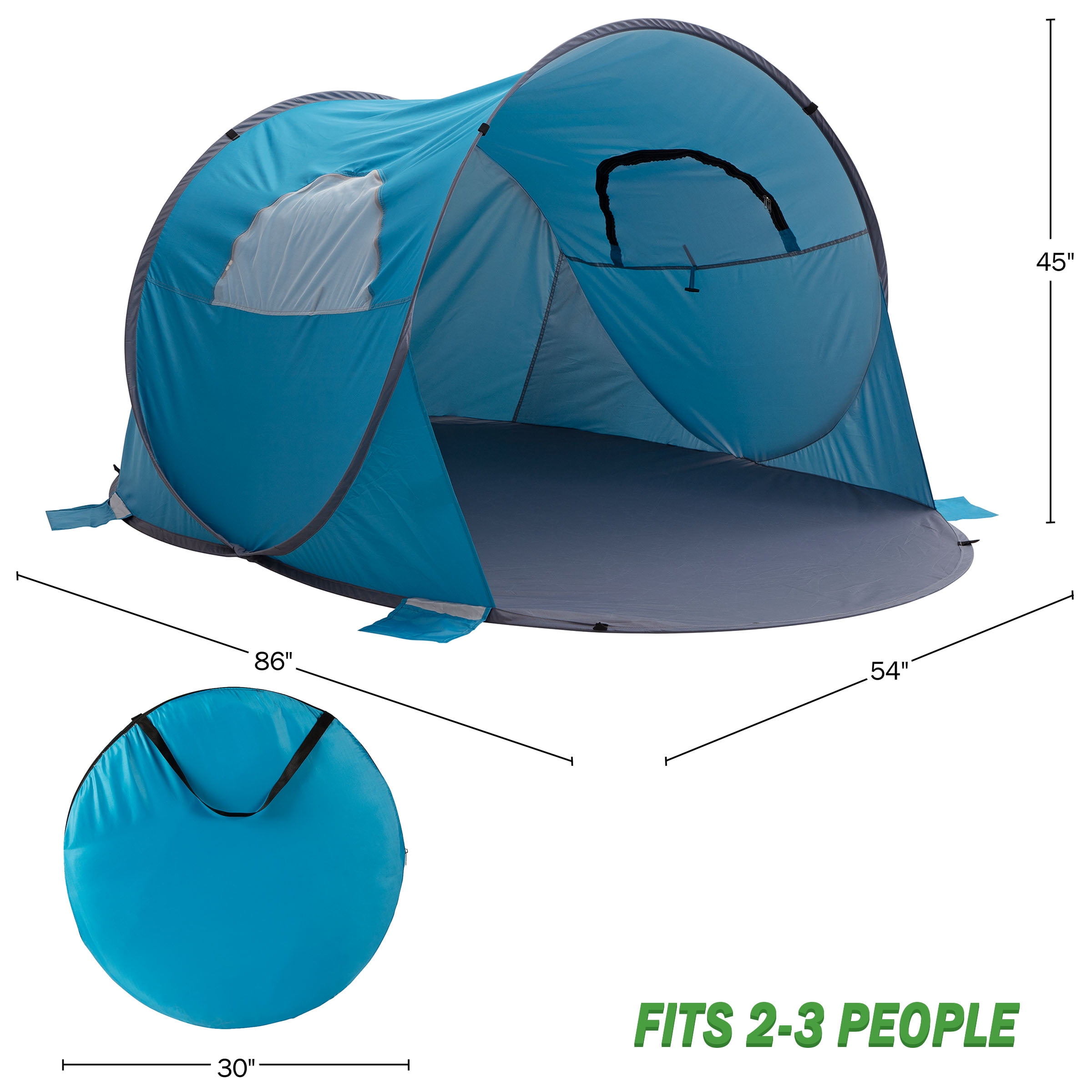 PROTECTIVE BEACH SHADE – The shade tent has a UPF 50+ UV rating to protect you and your family from harmful sun rays while at the beach or outside. It is also water-resistant to ensure water won’t leak into the pop-up shade for a fun and dry trip. SETS UP IN SECONDS – The instant setup removes the hassle of tent-pitching – just pull on the cords and it sets up in seconds. When you are finished, simply place the beach tent sun shelter into the included carrying bag to easily transport or store. CONVENIENT FEATURES – The steel poles, metal stakes, and pre-attached sandbag pockets stabilize the beach sun shade against the wind while the mesh windows provide optimal ventilation and bug protection for a comfortable outdoors experience. MULTIUSE TENT – More than a beach tent, this lightweight pop-up shelter is ideal to provide shade and protection for outdoor sporting events, fishing, camping, a day at the park, and more. It even doubles as a perfect play tent for kids in the backyard. PRODUCT DETAILS – Materials: 190T Polyester, PU 800mm Coat, Mesh, Fiberglass, and Metal Stakes. Dimensions: (L) 86” x (W) 54” x (H) 45”; Carry Bag: (L) 30” x (W) 2.4”. UV Rating: UPF 50+. Includes: 8 Stakes, 4 Guy Lines and Carry Bag. Color: Blue and Gray.
