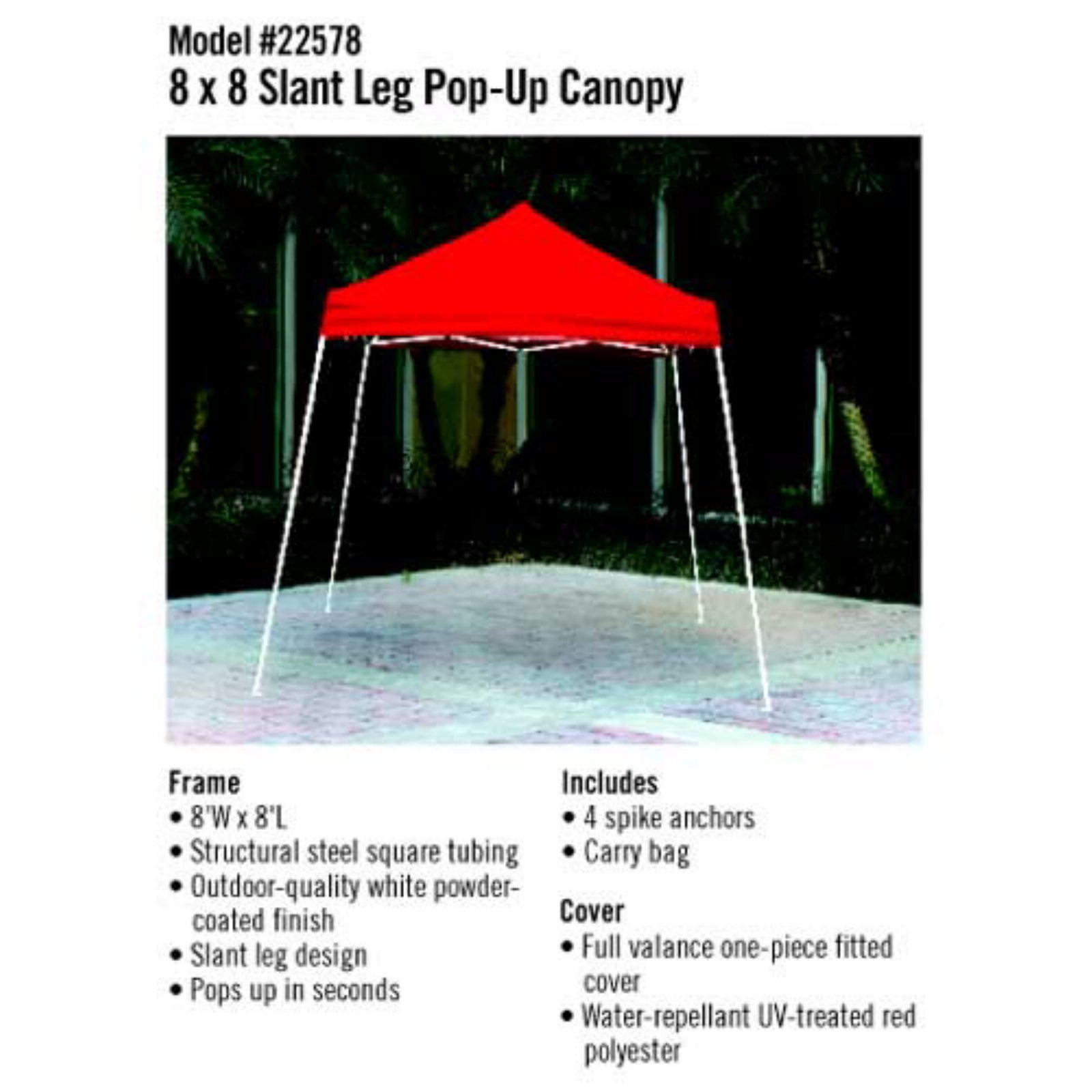 Pop-Up Canopy HD – Slant Leg 8 x 8 ft. Red Fully-assembled – sets up in less than fifteen minutes with two people Constructed of sturdy steel and high performance joint components Thermoset baked-on powder coating to resist chipping, peeling, rust, and corrosion Four-position adjustable frame Water-resistant polyester cover with sealed seams 50+ UPF sun protection blocks 98% of harmful UV rays Wide-based feet for easy anchoring Temporary anchors included Includes storage bag – ASSEMBLED EXTERIOR DIMENSIONS DEPTH (IN): 106.5 – ASSEMBLED EXTERIOR DIMENSIONS HEIGHT (IN): 96 – ASSEMBLED EXTERIOR DIMENSIONS WIDTH (IN): 106.5 – ASSEMBLED INTERIOR DIMENSIONS DEPTH (IN): 104.5 – ASSEMBLED INTERIOR DIMENSIONS HEIGHT (IN): 95 – ASSEMBLED INTERIOR DIMENSIONS WIDTH (IN): 104.5 – GABLE HEIGHT (IN): 9.5 – Cover Color: RED – Frame Color: WHITE – FOLDABLE (Y/N): Yes – Frame Material: Steel – WATER-RESISTANT (Y/N): Yes