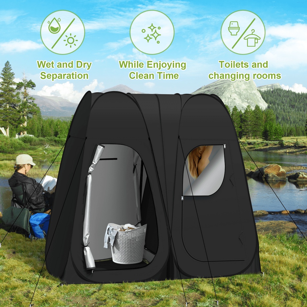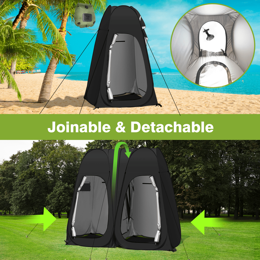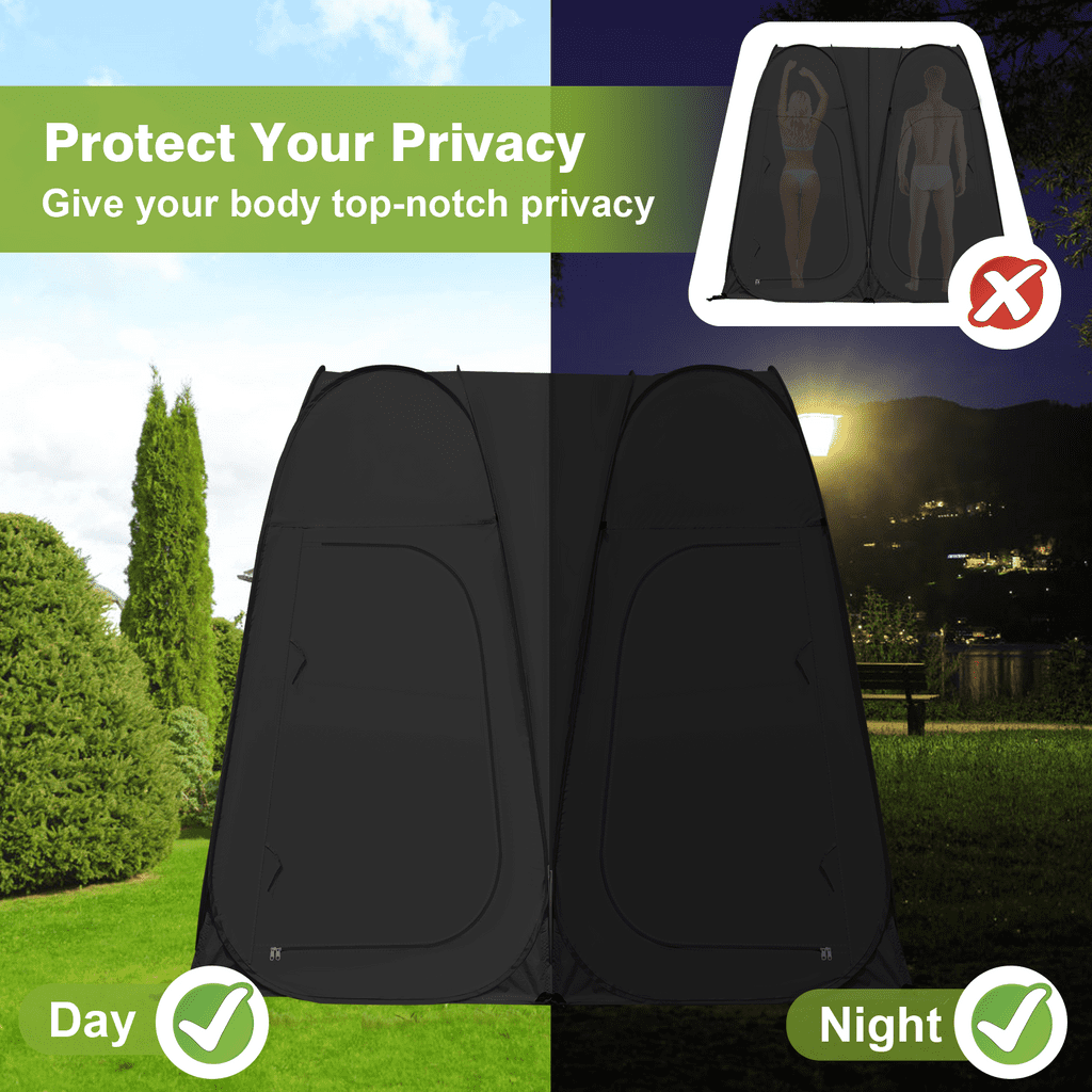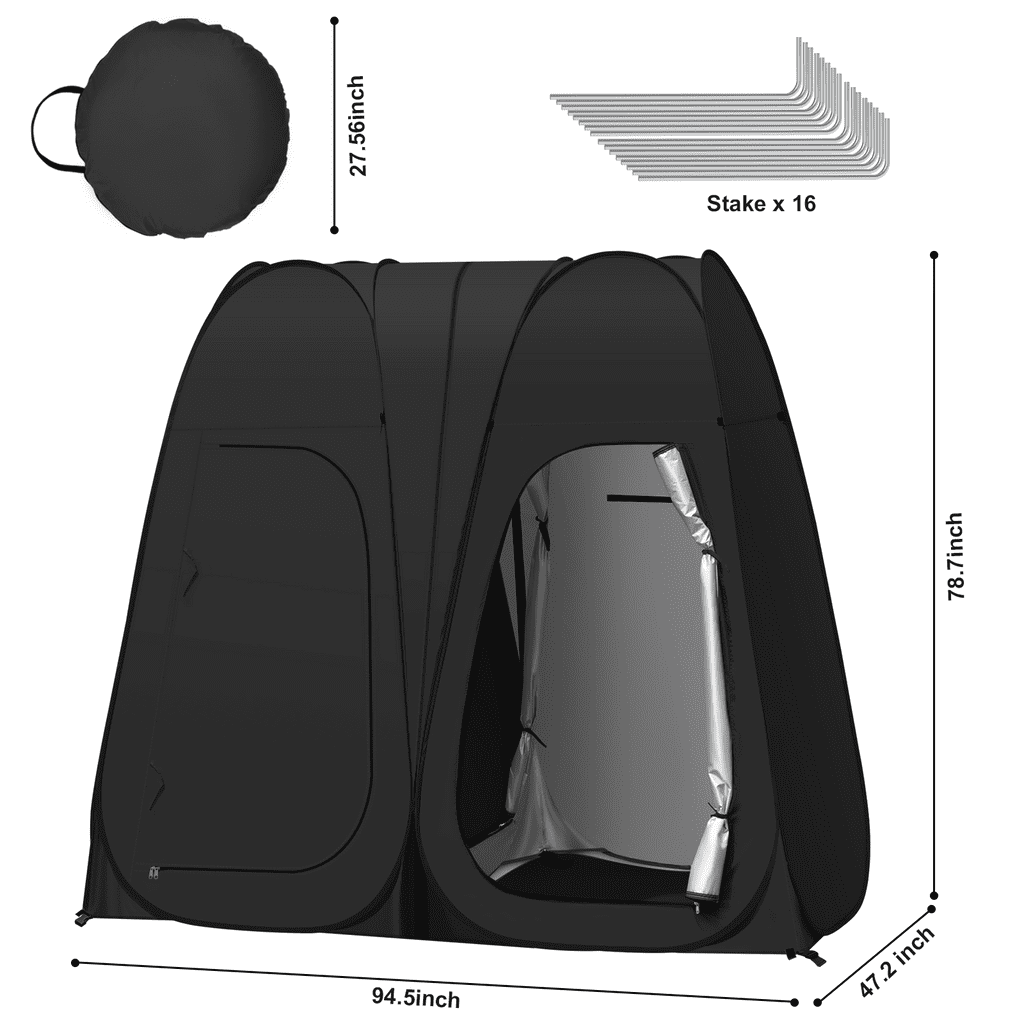 Vecukty Double Shower Tent offers two private spaces that can be connected and used independently for using the toilet and enjoying a quick shower the same time when you go camping outside. When two people use it, they can take a bath at the same time, and when one person uses it, the space can be separated from wet and dry, one takes a bath and the other changes clothes.It also provides a changing room for models when she/he need to change clothes when you shoot outdoors, or for your kid’s dancing competition, or for clothes vending stands. ????❤️【HIGH QUALITY & EASY TO SET】 Vecukty Double Changing Room Privacy Tent can folds down in seconds, no assembly required. Ultra-lightweight construction allows for easy transportation including a carrying bag. Pop up Privacy Tent made from high-quality polyester taffeta 170T water-resistant coating. Includes a flexible steel frame for premium durability. ????❤️【MULTI-FUNCTION & PORTBALE】 Removable roof with waterproof zippered skylight on top with can withstand the sun and rain. Mosquito nets with shower holes at the top ensure air circulation while maintaining privacy.There are two windows on the behind, which can also be opened for ventilation.Lightweight and easy to store, store it up and take it away at any time. ????❤️【ACCESSORIES】 With 1 side bag to store your phone, tablet, or other items, and 1 removable bottom mat, 1 hook for hanging emergency lights ,1 clothesline for hanging wet clothes or towels,8 plastic studsand 16 ground nail Improved stability. ????❤️【DIMENSIONS】 Measuring 78.7” high and 47.2” x 94.5” in length and width when open, the instant portable outdoor shower tent affords free standing and comfortable movement within. And it can be folded into a compact size of 27.5″ L x 27.2″W x 2.75″ H.