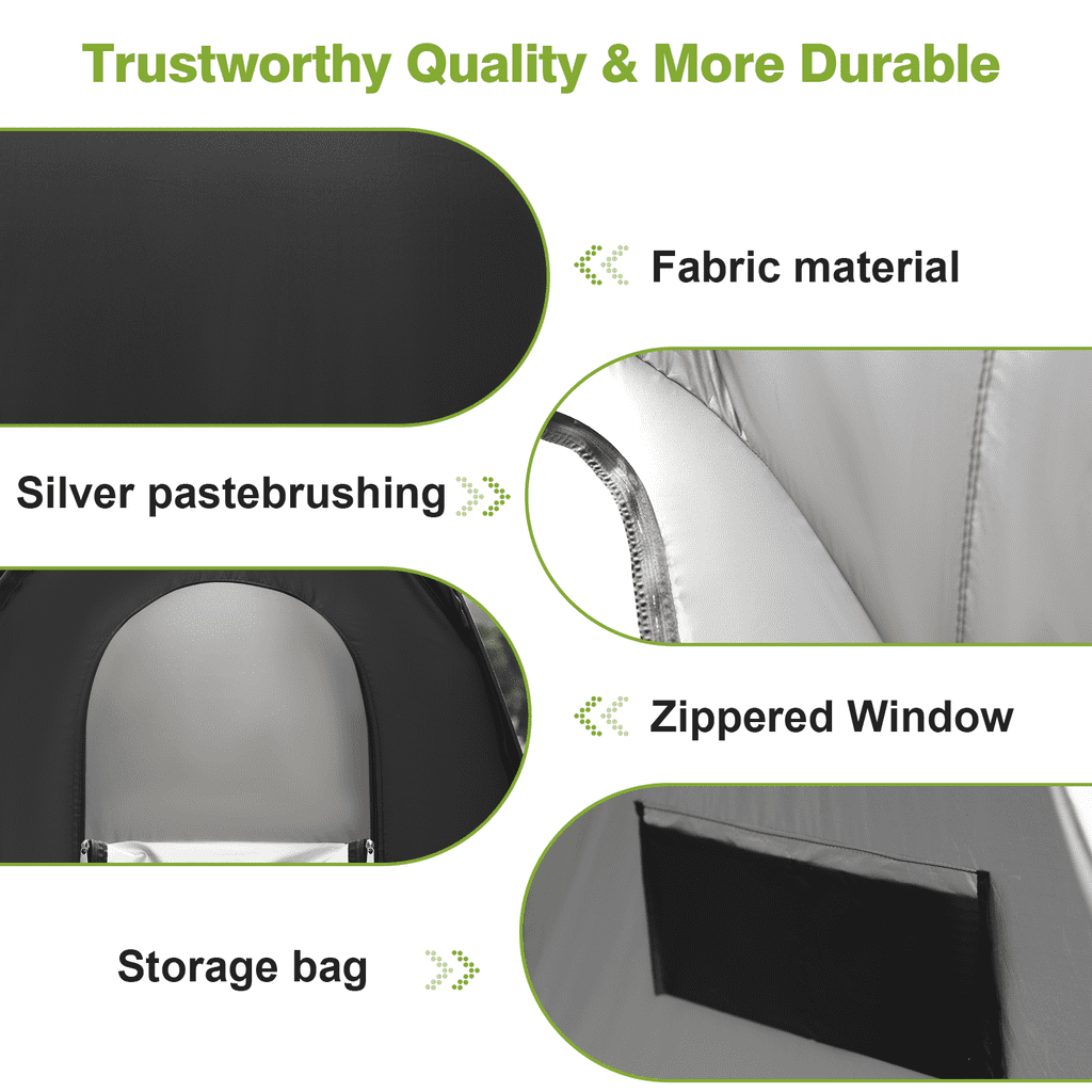 Multifunctional privacy account suitable for various outdoor activities Ideal for use as a beach tent, camping tent, or portable work tent Provides essential camping facilities, including camping toilets Serves as a portable house and weather pod for added convenience Lightweight and easy to transport with included carry bag Made from high quality polyester taffeta 170T with water resistant coating Features a flexible steel frame for enhanced durability Removable roof with waterproof zippered skylight for sun and rain protection Equipped with mosquito nets and shower holes for ventilation while maintaining privacy Includes two windows for additional airflow Comes with a side bag for storing personal items, a removable bottom mat, a hook for emergency lights, and a clothesline for wet items Improved stability with 8 plastic studs and 16 ground nails Spacious dimensions of 78 7” high and 47 2” x 94 5” when open, allowing for comfortable movement Folds into a compact size of 27 5″ L x 27 2″ W x 2 75″ H for easy storage