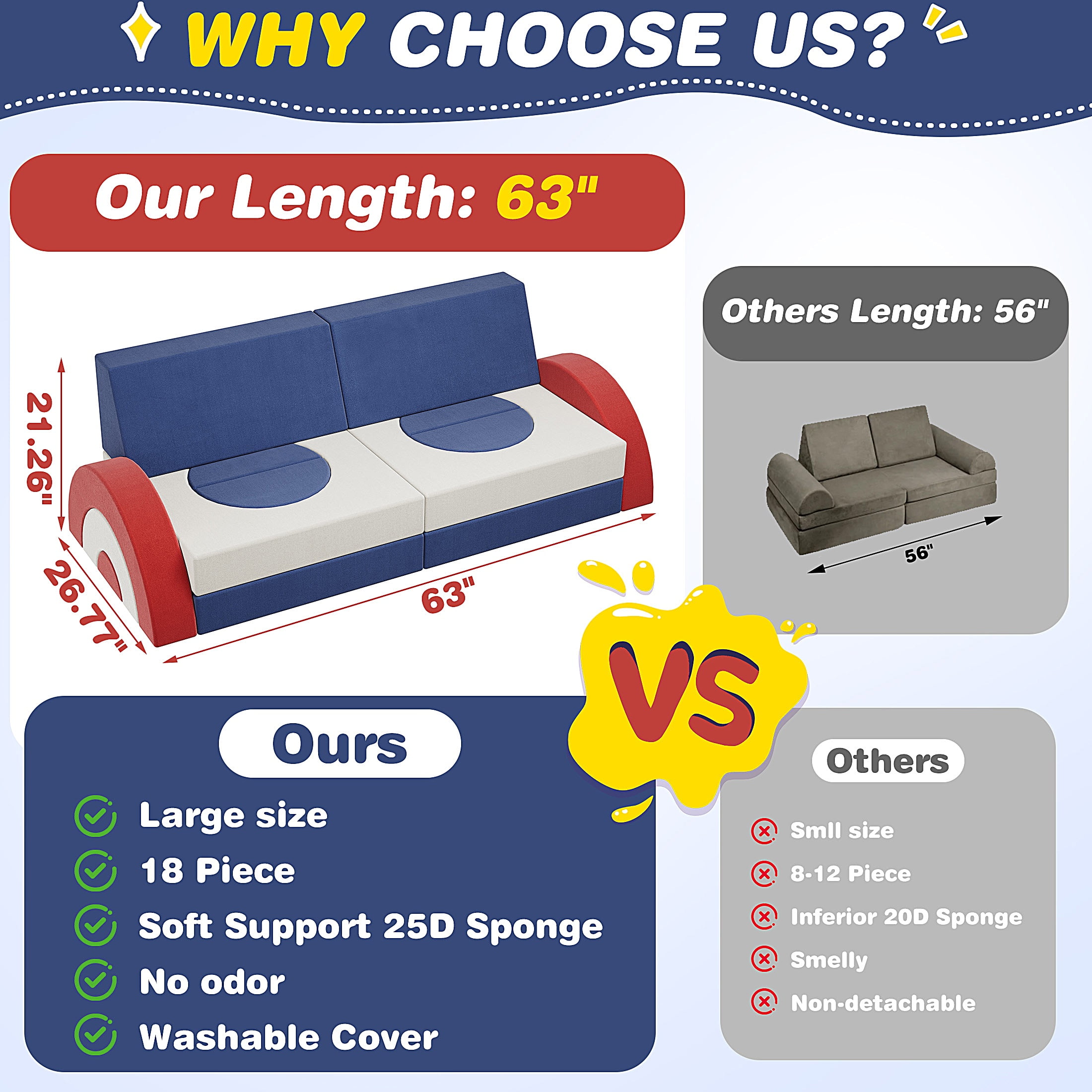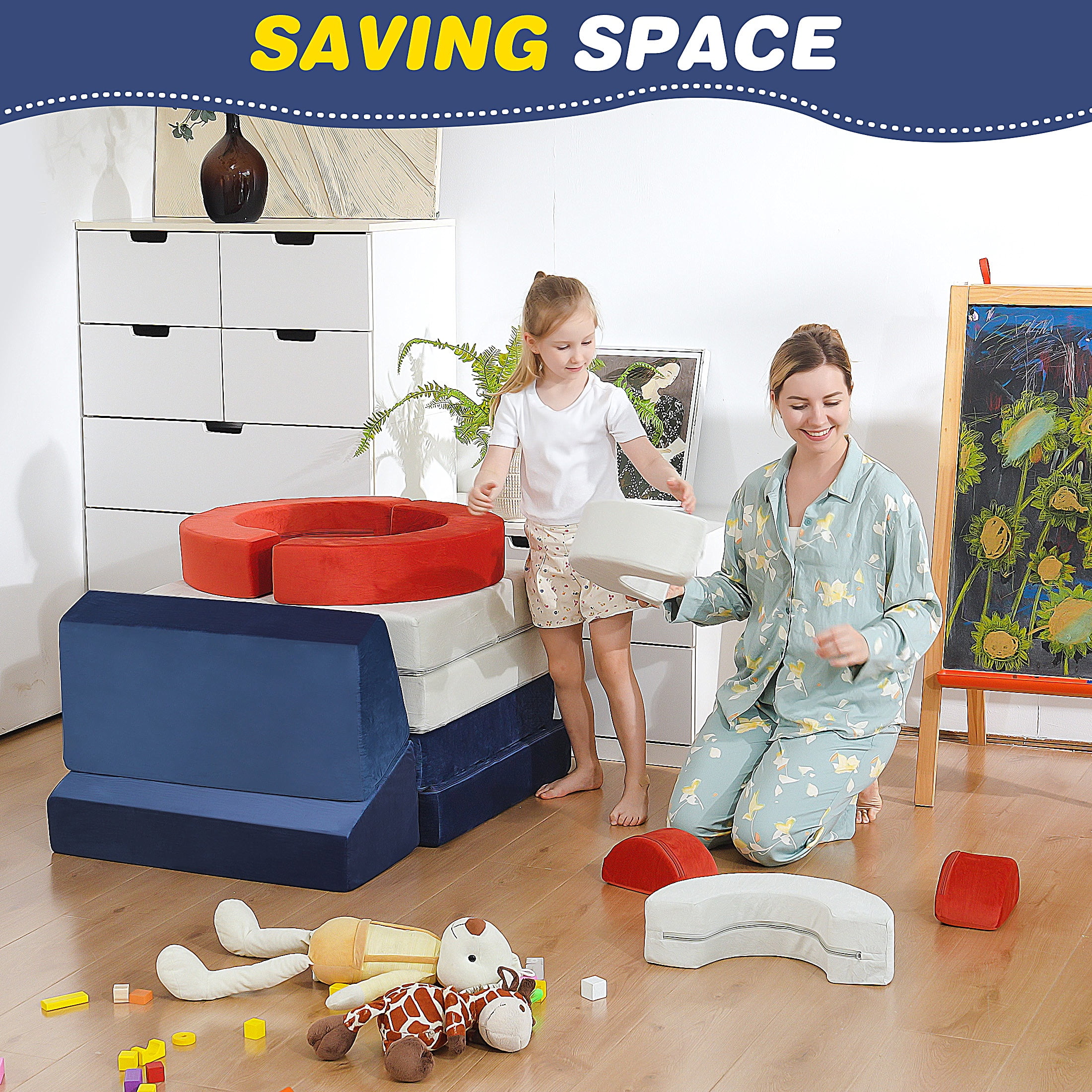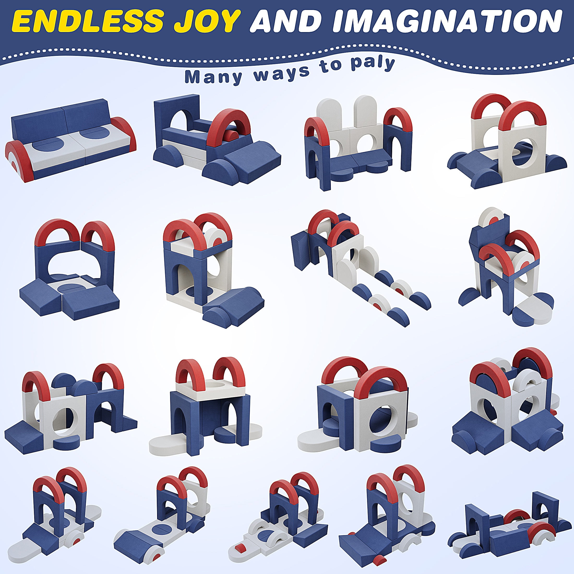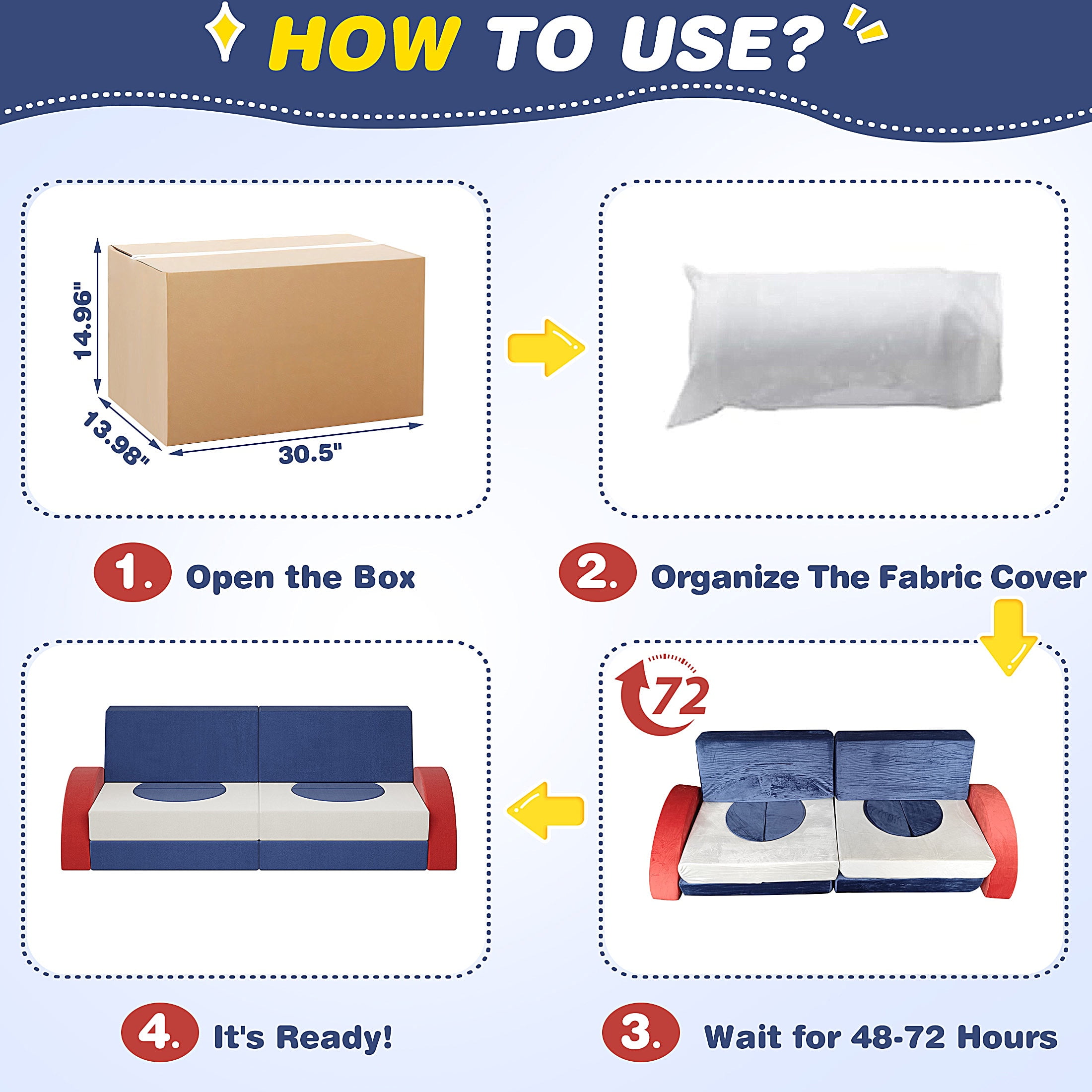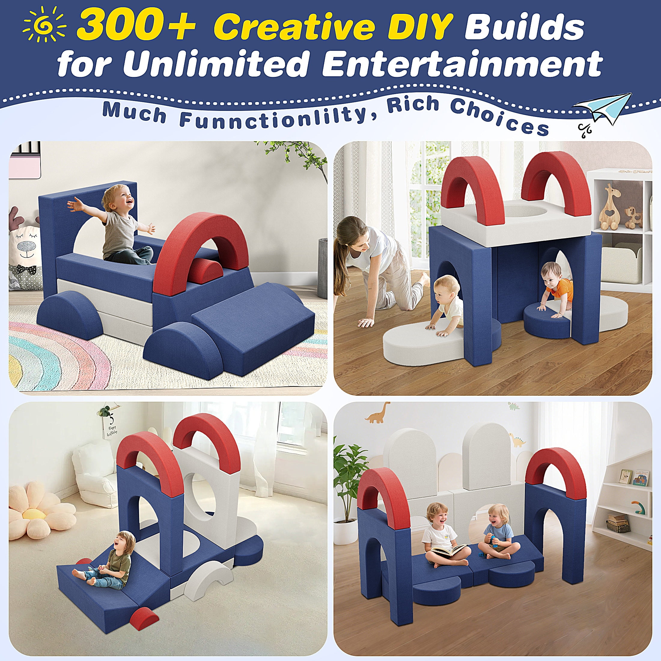 Endless Combinations for Creative Play – The modular couch play set can be transformed into over 1000+ DIY shapes like a sofa, car, castle, elephant, train, or ball pit. This flexibility stimulates children’s creativity and motor skills, making it a versatile addition to any playroom. Safe and Soft Play Environment – Our kids’ play couch features high resilience and soft foam, ensuring a safe climbing and crawling experience for your children. With soft corners and a non-slip bottom, this set minimizes the risk of injuries, creating a secure play environment. Ideal Gift for Kids – This modular kids sofa couch makes a perfect gift for birthdays, holidays, or baby showers. Suitable for kids aged 2-7, it’s a valuable tool for enhancing cognitive and physical development. And Encourage family bonding and endless fun. Space-Saving Versatility – You can easily stack and store the modular pieces once playtime ends. The toddler sofa also doubles as a regular sofa, fitting seamlessly into any room. Easy Maintenance – Designed for durability and safety, it comes with removable, covers and high-resilience foam that fully expands within 48-72 hours after unpacking. Trustworthy service – If there are any problems with our items, please contact us with photos or videos, we will provide a satisfactory solution within 24 hours.