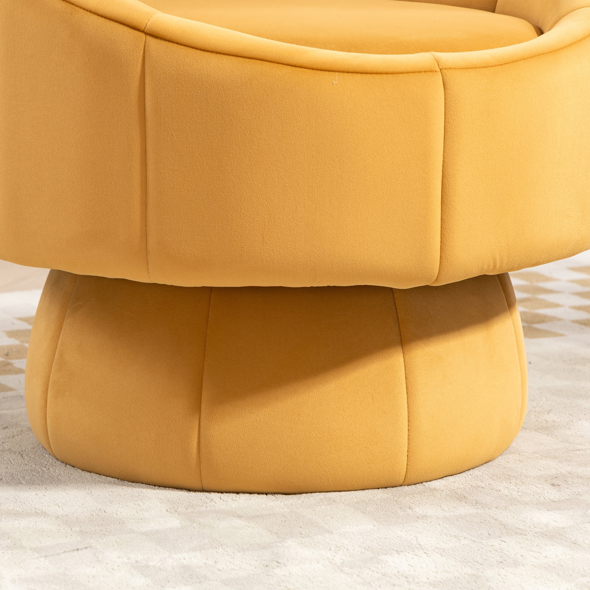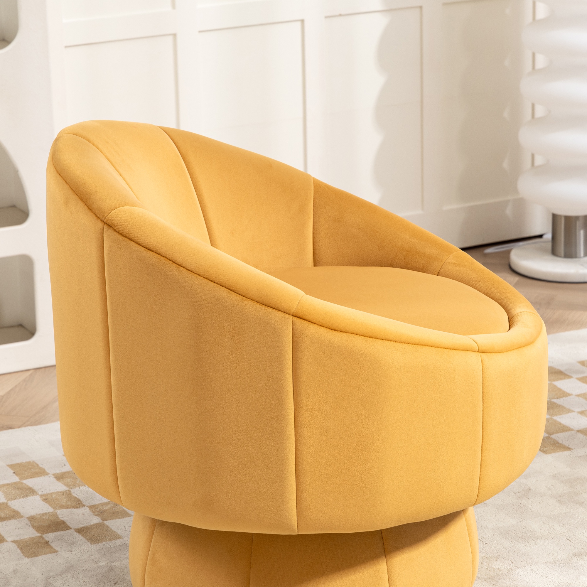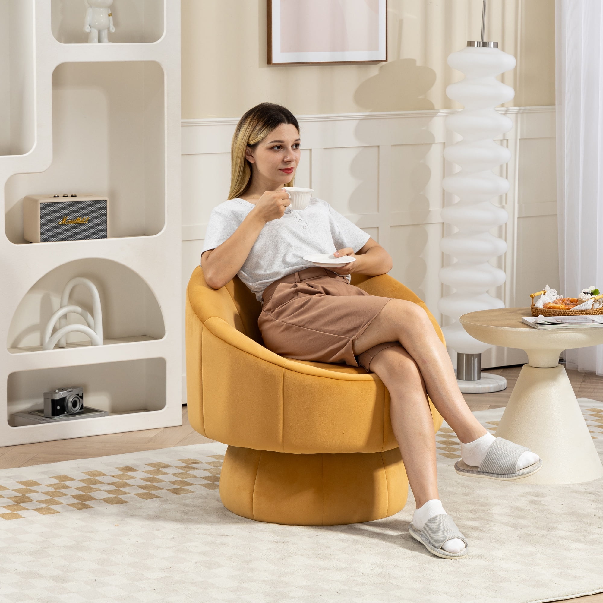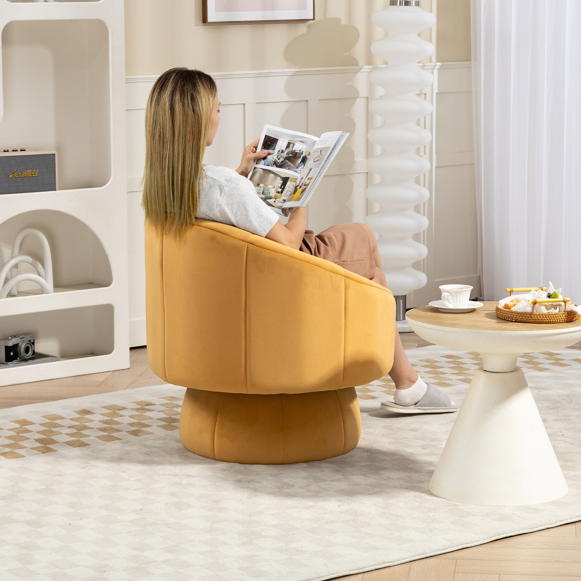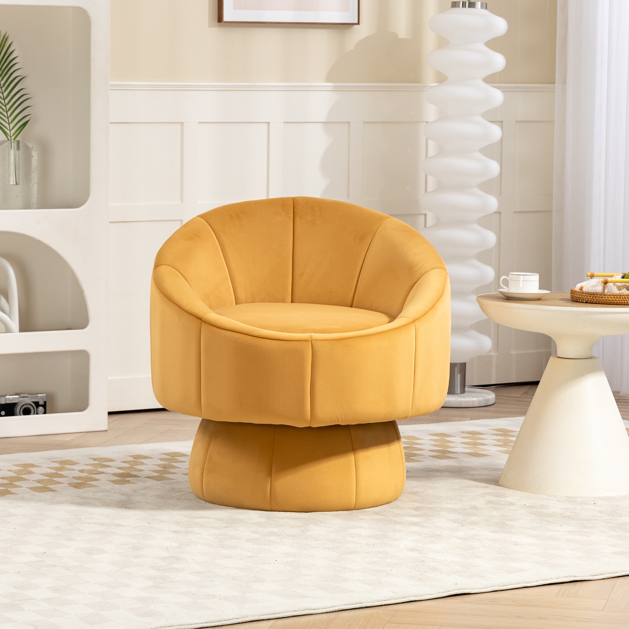 PORKISS 360° Swivel Chair, Modern Accent Chair Velvet Upholstered Reading Comfy Round Single Leisure Sofa Chair with Metal Swivel Ring for Living Room Bedroom Sunroom, Yellow. Add a touch of elegance and comfort to your home with our versatile Swivel Accent Chair. Crafted with a sleek, modern design and premium materials, this chair is perfect for any living room, bedroom, home office, or reading nook. Its smooth 360° swivel base and plush velvet upholstery make it a functional seating option and an eye-catching statement piece in any contemporary space. Specifications: Material: Metal Base, Velvet Upholstery, High Elasticity and High-density Sponge Filling, Solid Wood Frame Fabric: Velvet Color: Yellow Base Shape: Round Load Capacity: 250 lbs Applicable Age: 5-70 Ages Swivel: 360° Swivel Assembly Required: Yes Dimensions: (28.75 x 28.75 x 28.25)” (L x W x H) Weight: 34.39lbs / 15.60kg Package Includes: 1 x Swivel Accent Chair 1 x Installation Instruction Manual Kind Reminder: – Manual measurement has been used, there may be some reasonable error. – Actual samples take all the pictures, slight chromatic aberration may occur due to lighting or display.