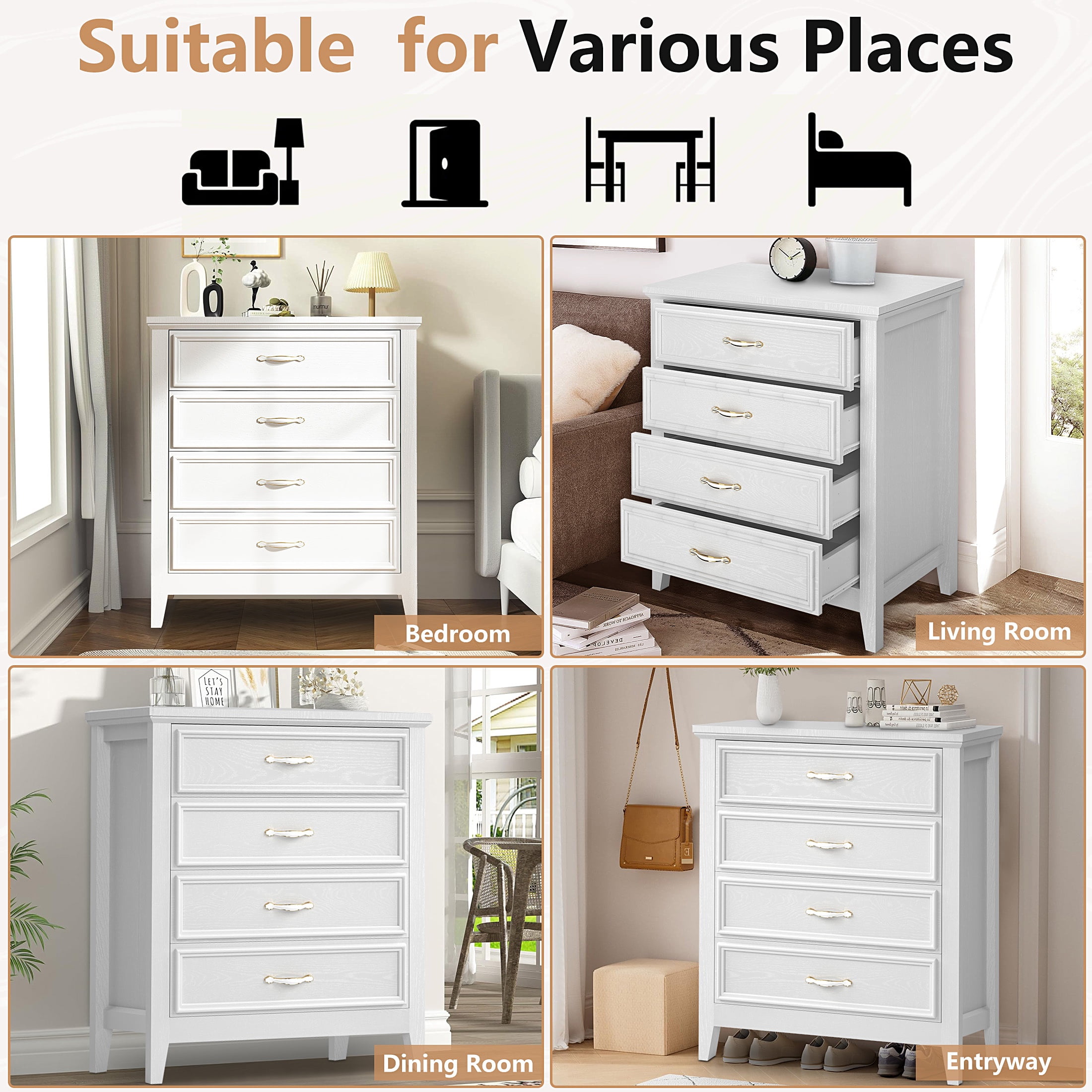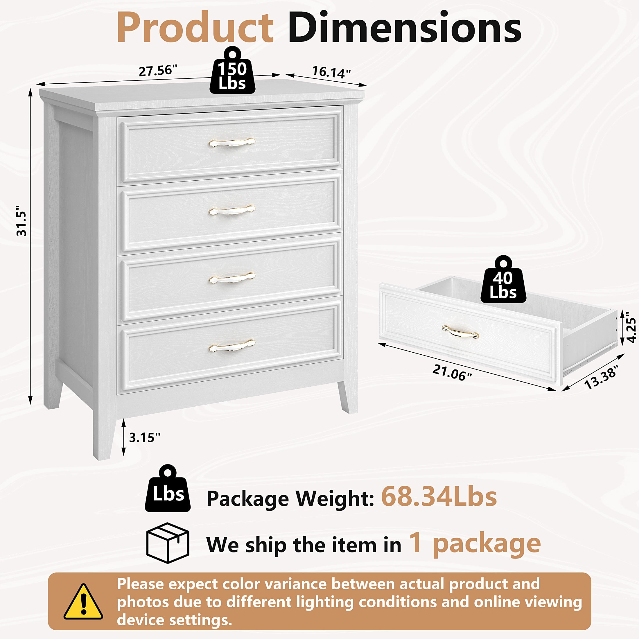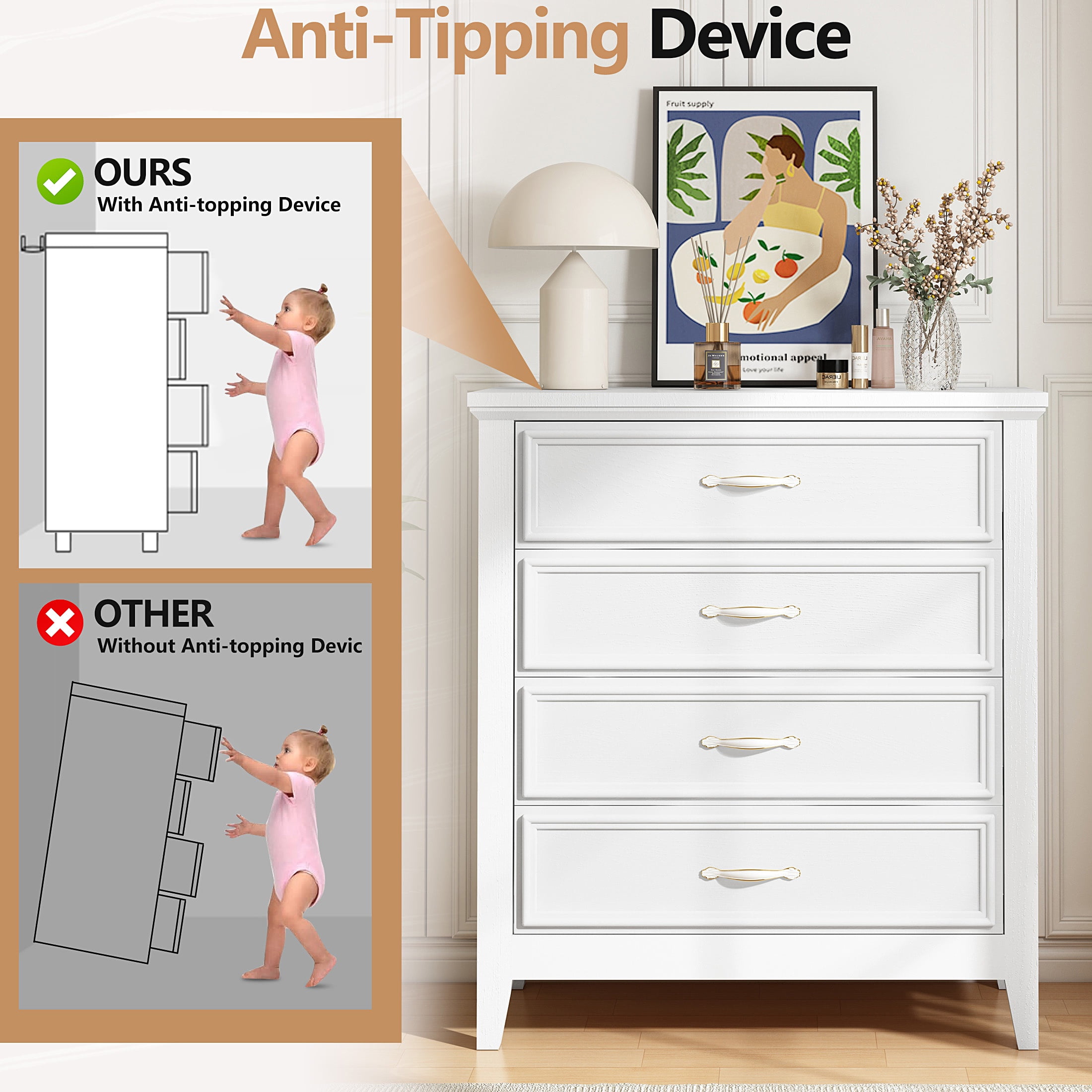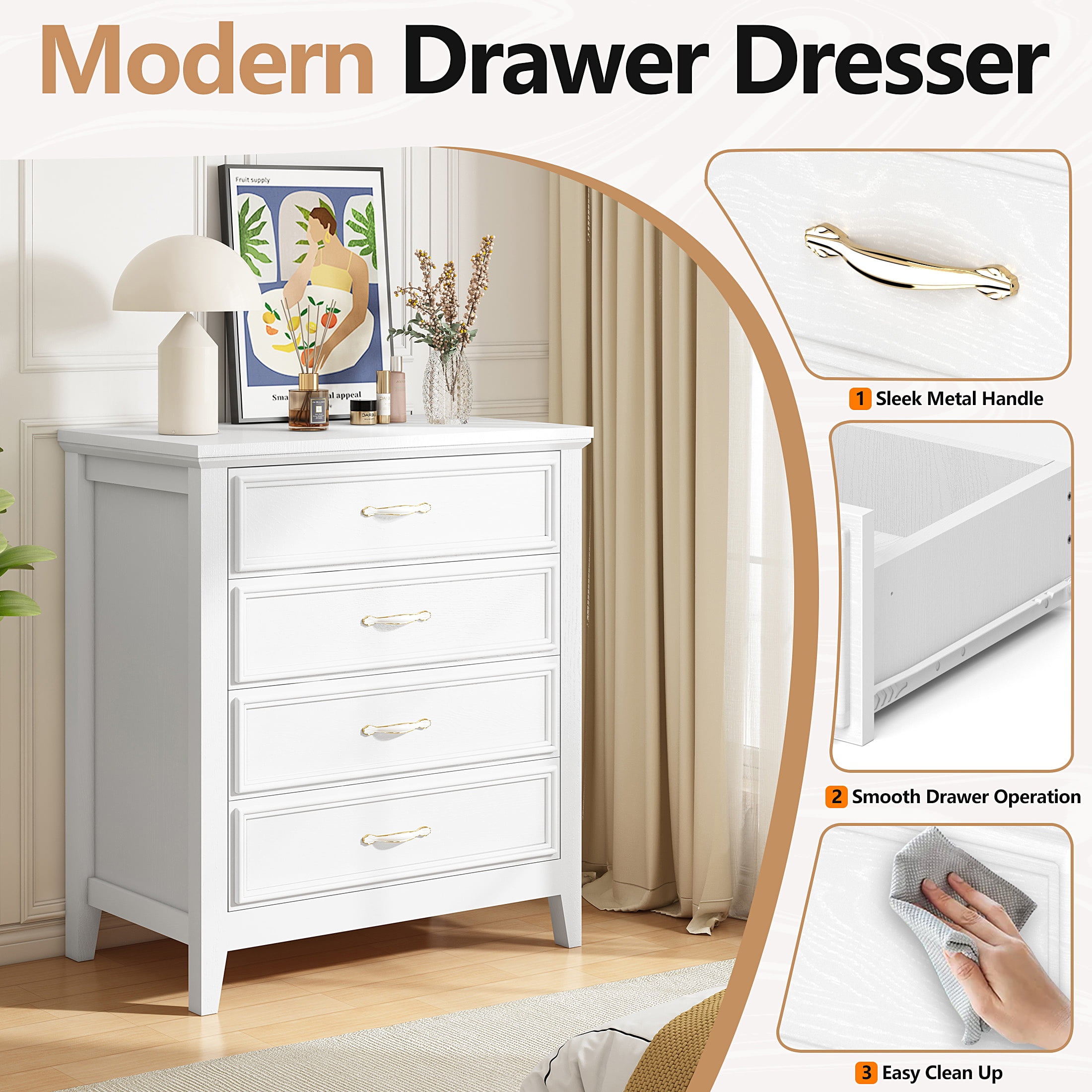 PORKISS 4 Drawer Dresser for Bedroom, Wood Chest of Drawers with Anti-Collision Device, Modern Storage Cabinet Dresser Organizer with Metal Handle for Closet, Living Room, Hallway, White