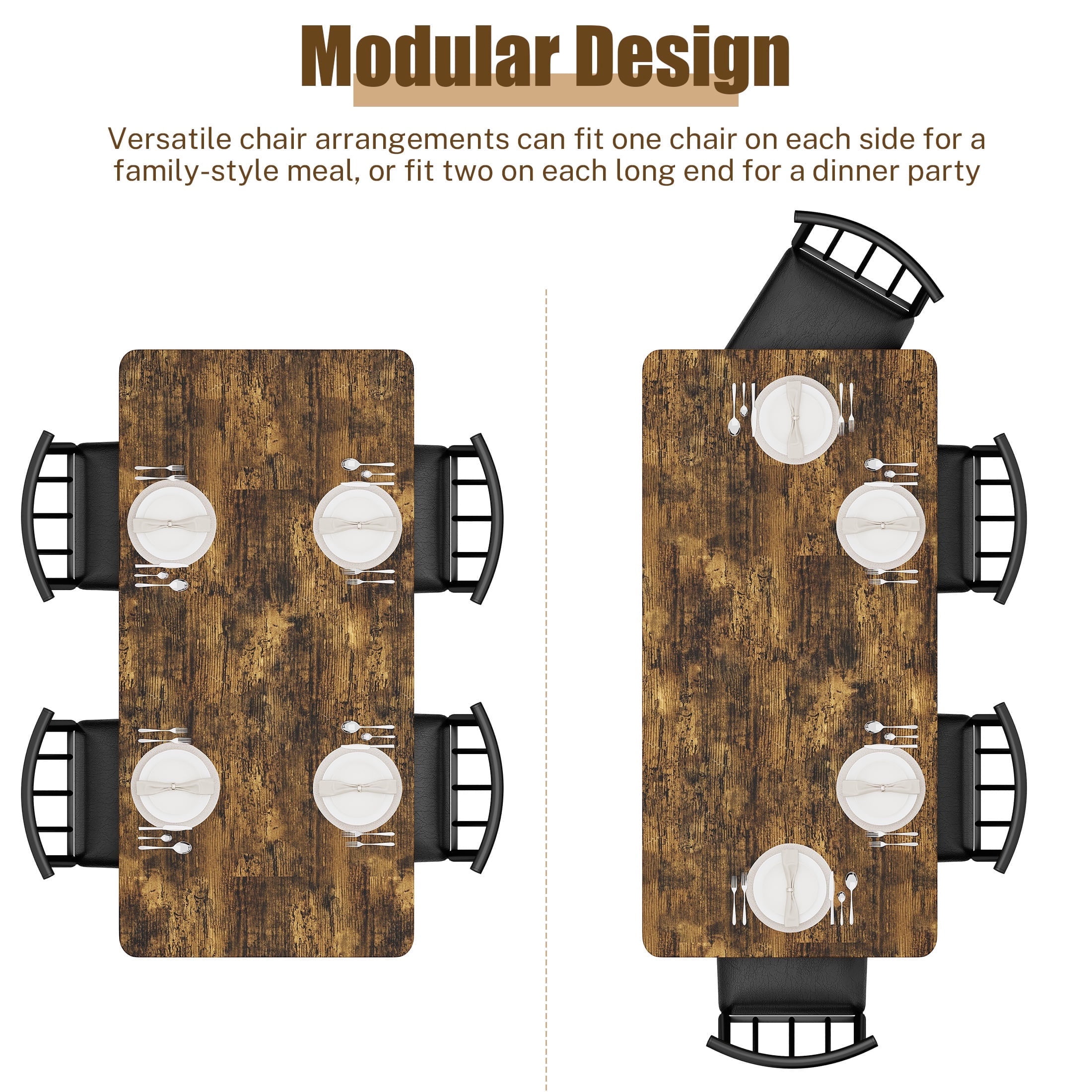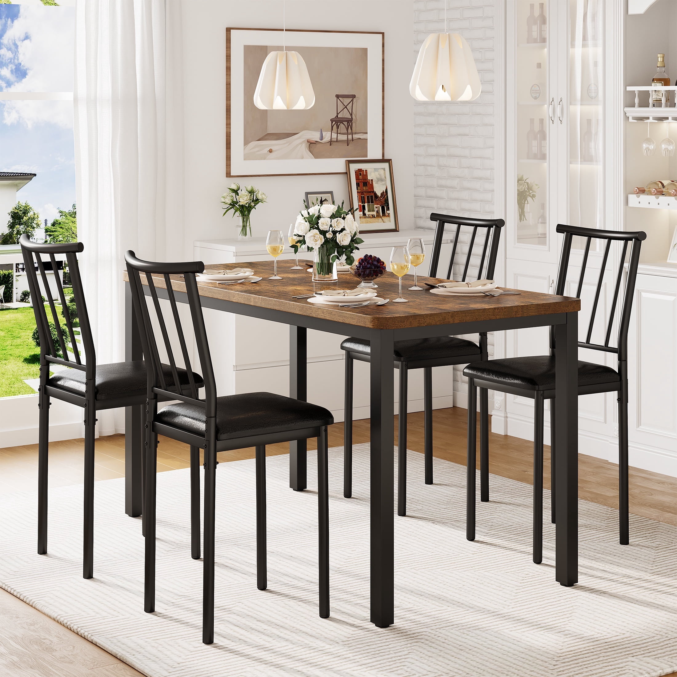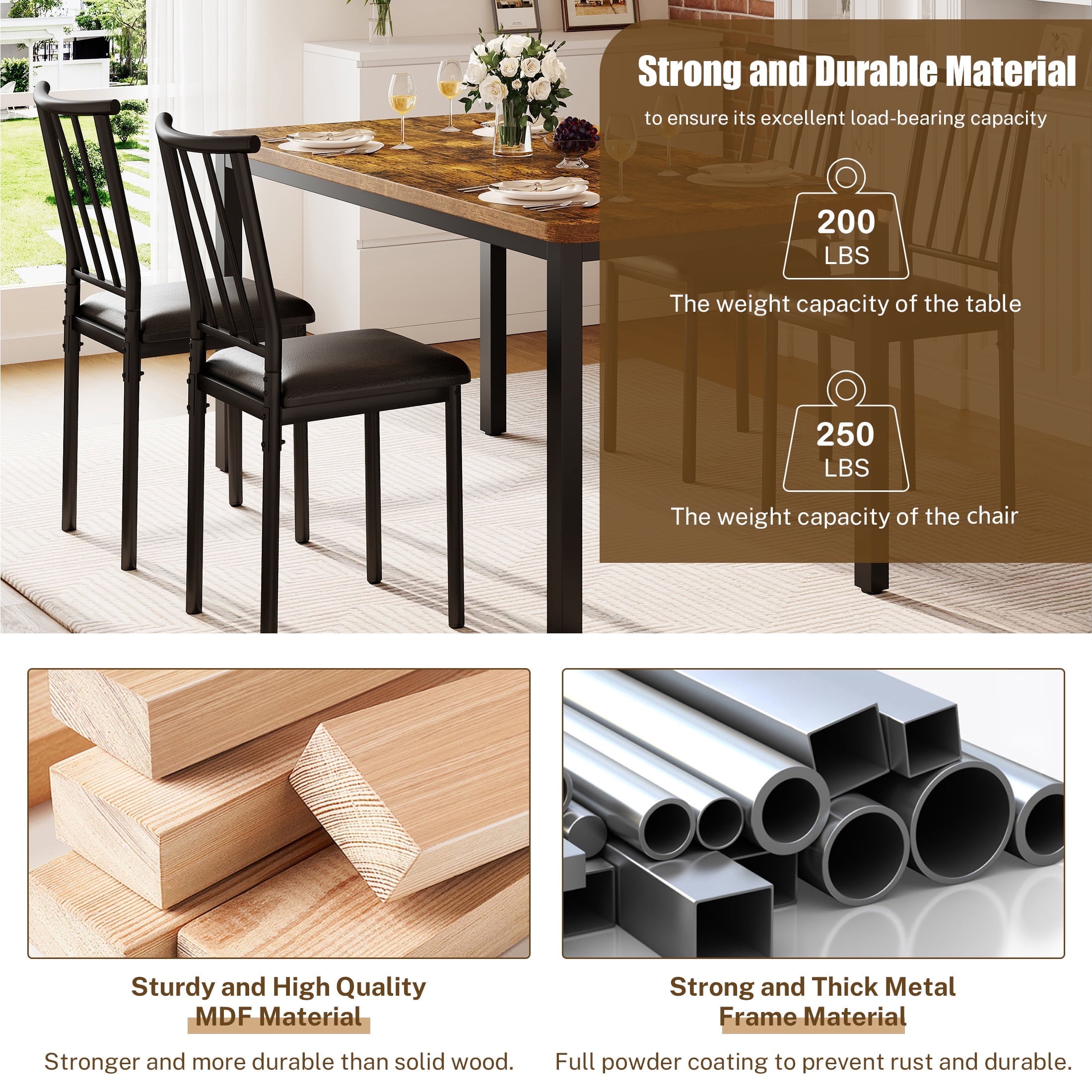 Scratch-resistant Tabletop – The tabletop is made of wood grain veneer, resistant to scratches, with rounded corners to prevent injuries from collisions. Wood Grain Dining Set—This dining set includes a table and 4 leather cushion chairs, perfect for enjoying meals with family and friends. It is made of MDF board and a bold iron frame, ensuring durability and solid support. Stylistic Elements – The classic and industrial faux wood dining table and chairs feature a contemporary design, adding function and flair to your room. The set is perfect for casual meals or drinks. Thickened Durable Structure: This kitchen table and chair set is made of MDF board with a reinforced metal structure, ensuring robust stability, which provides strong weight-bearing capacity(Table: 200lbs; Chair: 250lbs). With anti-slip foot pads, don’t scratch your floors when you move it. Easy to Assemble – The dining table set comes with an instruction manual and all necessary hardware, making assembly easy and convenient.
