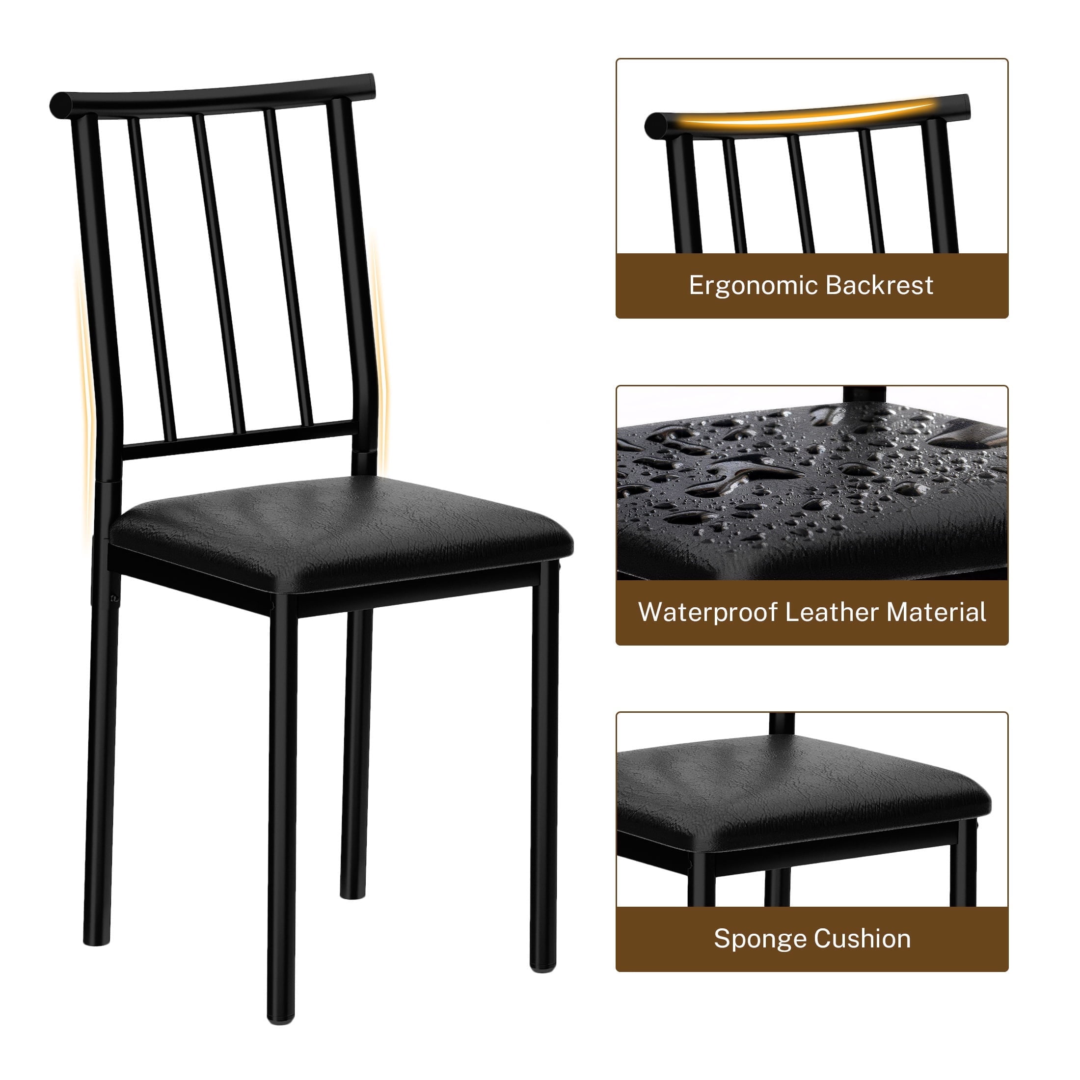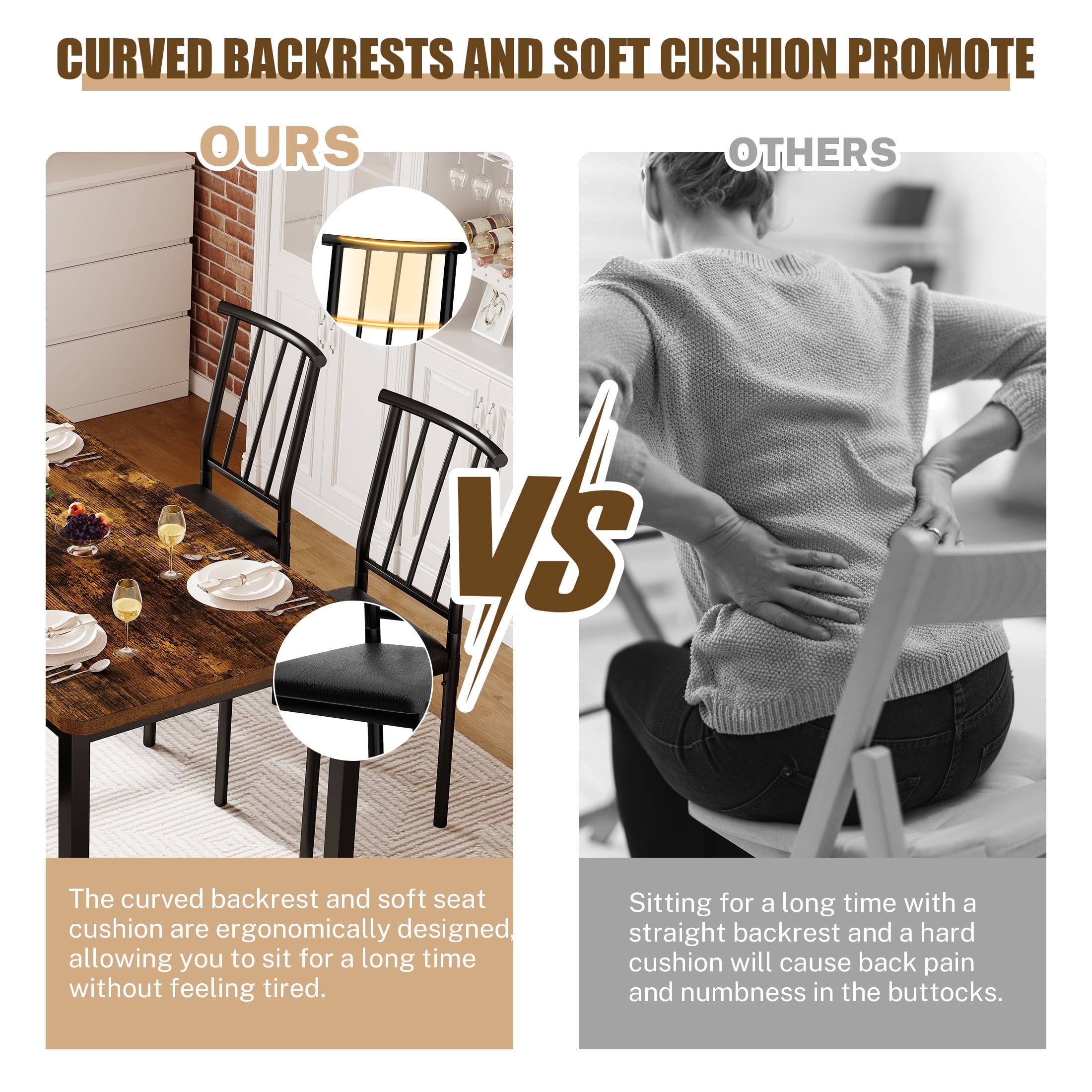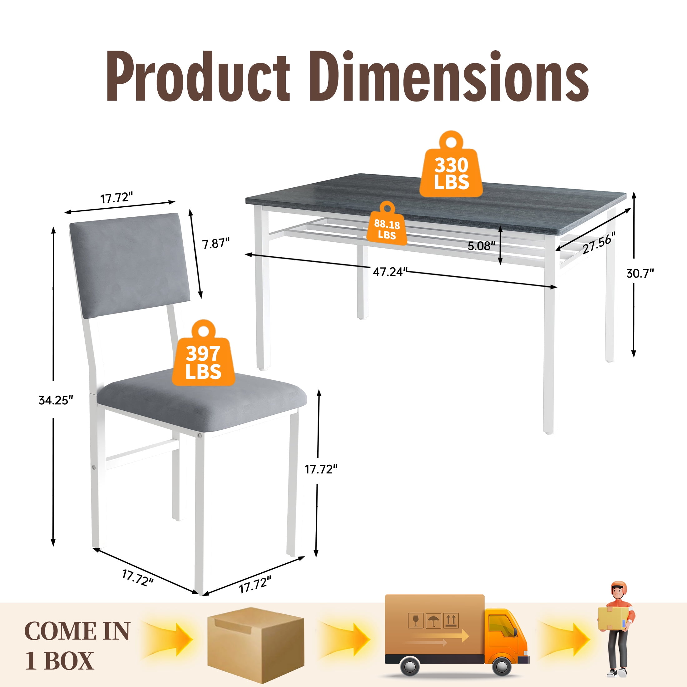 Scratch-resistant Tabletop – The tabletop is made of wood grain veneer, resistant to scratches, with rounded corners to prevent injuries from collisions. Wood Grain Dining Set—This dining set includes a table and 4 leather cushion chairs, perfect for enjoying meals with family and friends. It is made of MDF board and a bold iron frame, ensuring durability and solid support. Stylistic Elements – The classic and industrial faux wood dining table and chairs feature a contemporary design, adding function and flair to your room. The set is perfect for casual meals or drinks. Thickened Durable Structure: This kitchen table and chair set is made of MDF board with a reinforced metal structure, ensuring robust stability, which provides strong weight-bearing capacity(Table: 200lbs; Chair: 250lbs). With anti-slip foot pads, don’t scratch your floors when you move it. Easy to Assemble – The dining table set comes with an instruction manual and all necessary hardware, making assembly easy and convenient.