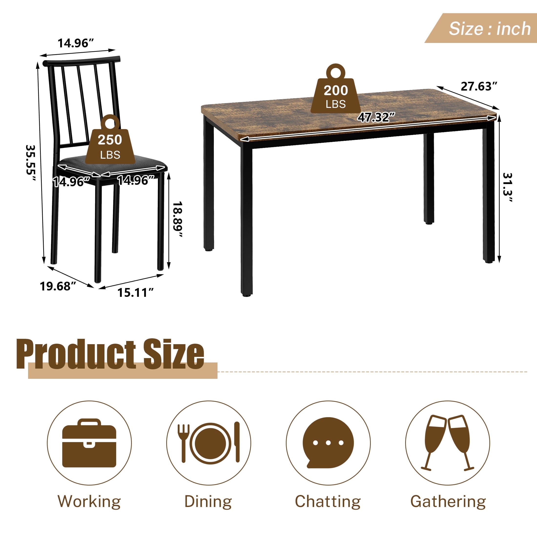 Elevate your dining space with the PORKISS Dining Set for 4, featuring a faux wood grain table and 4 chairs. With a table size of 47.2″L x 27.63″W x 31.3″H and chair measurements of 15.11″ x 19.68″ x 35.33″, this set is perfect for a family meal or gathering with friends. Crafted from wood and iron frame, the table and chairs boast durability and solid support. The wood grain veneer tabletop is scratch-resistant, while the rounded corners prevent accidental injuries. Showcasing a contemporary and industrial design, this dining set adds function and flair to your room. The PORKISS Dining Set is stylish durable and easy to assemble with an instruction manual and all necessary hardware. It’s more than just a dining set – a statement piece that brings a modern touch to your home. Product Information: Product Type: Dining table set 5PC Color: Rustic Brown & Black Material: High-quality MDF board and iron frame Table Dimensions: 47.2*27.63*31.3in Chair Dimensions: 15.11*19.68*35.33in Table Maximum Load-bearing: 200lbs Stool Maximum Load-bearing: 250lbs Ships in 1 package Package Includes: 1 x Table 4 x Chair 1 x Assembly Kit 1 x Instruction