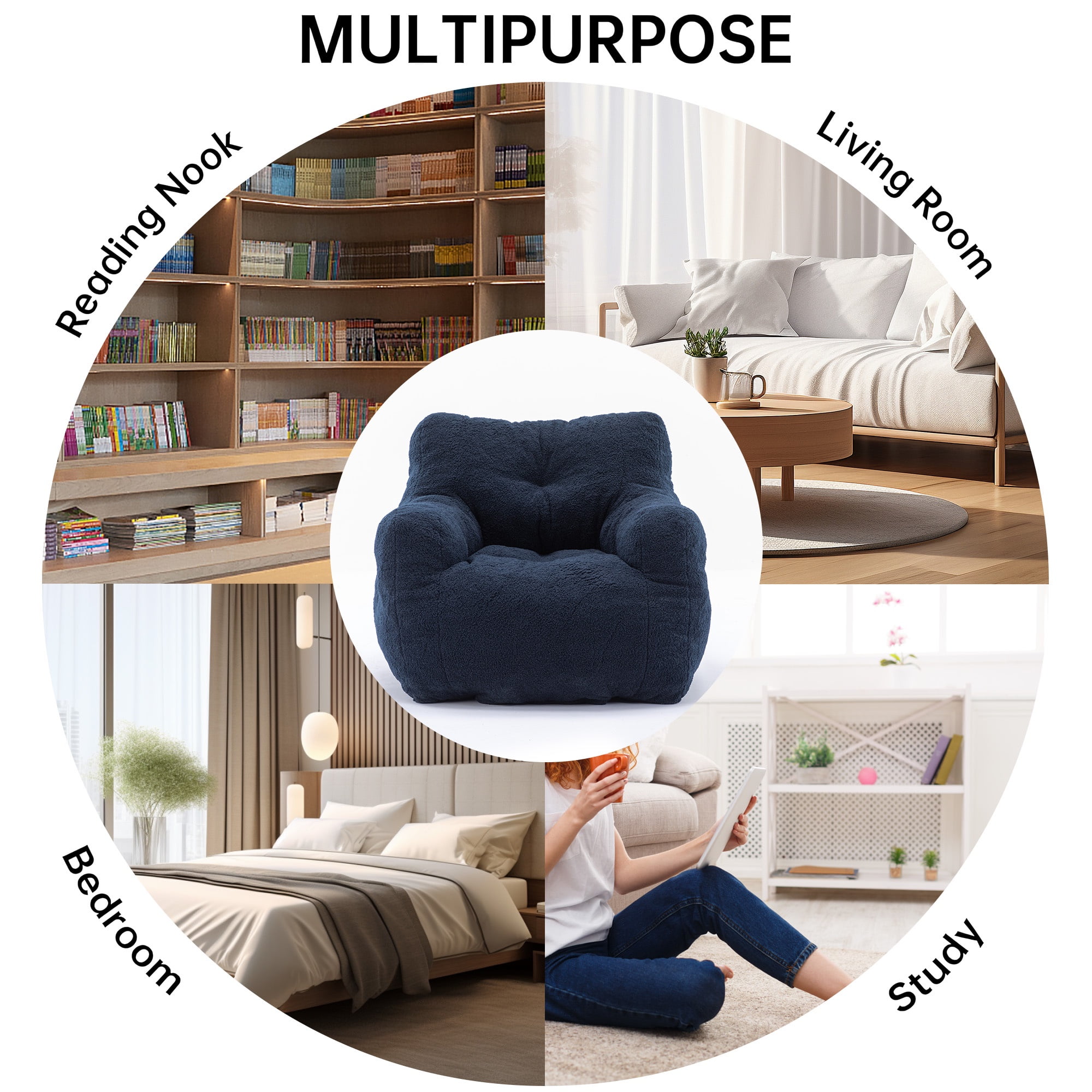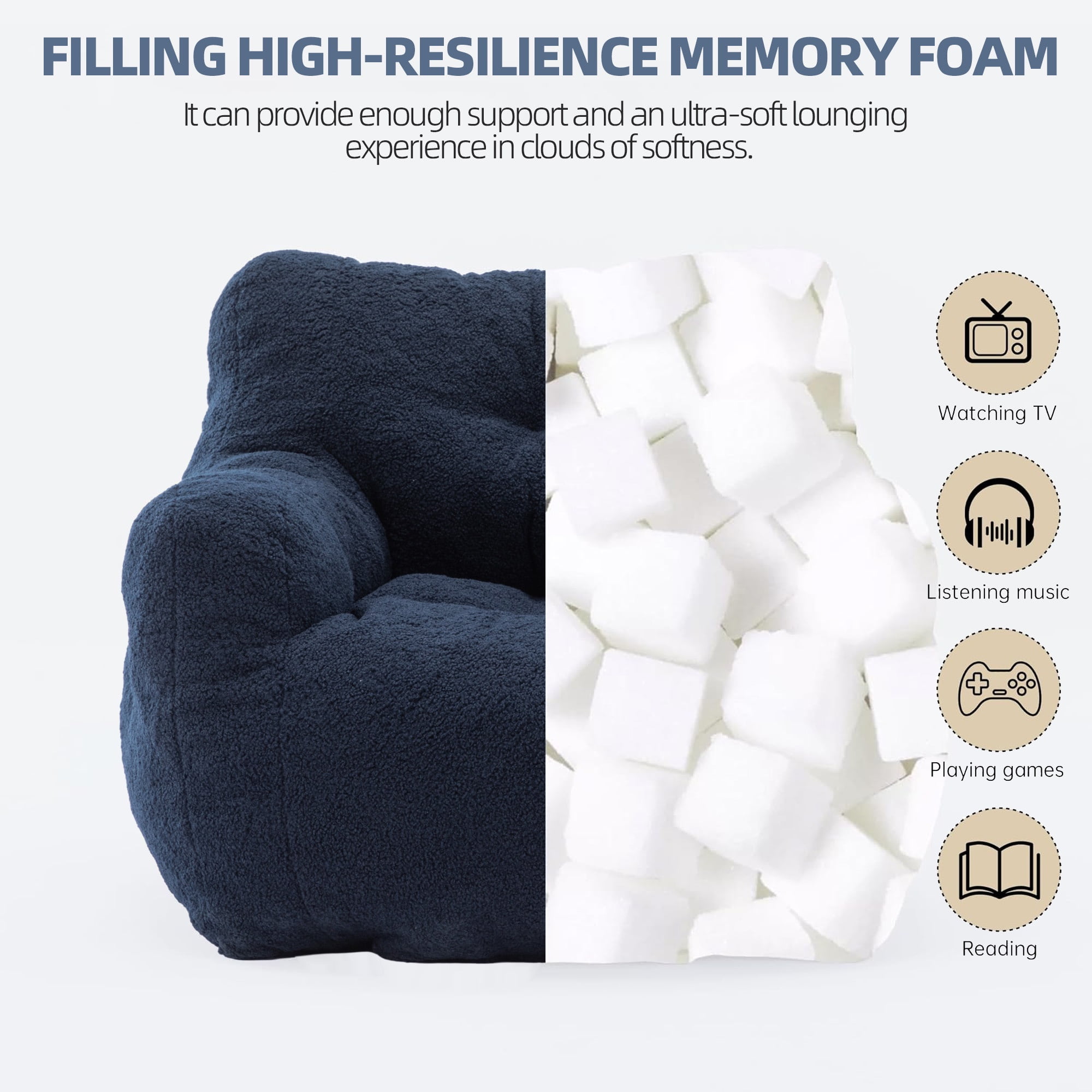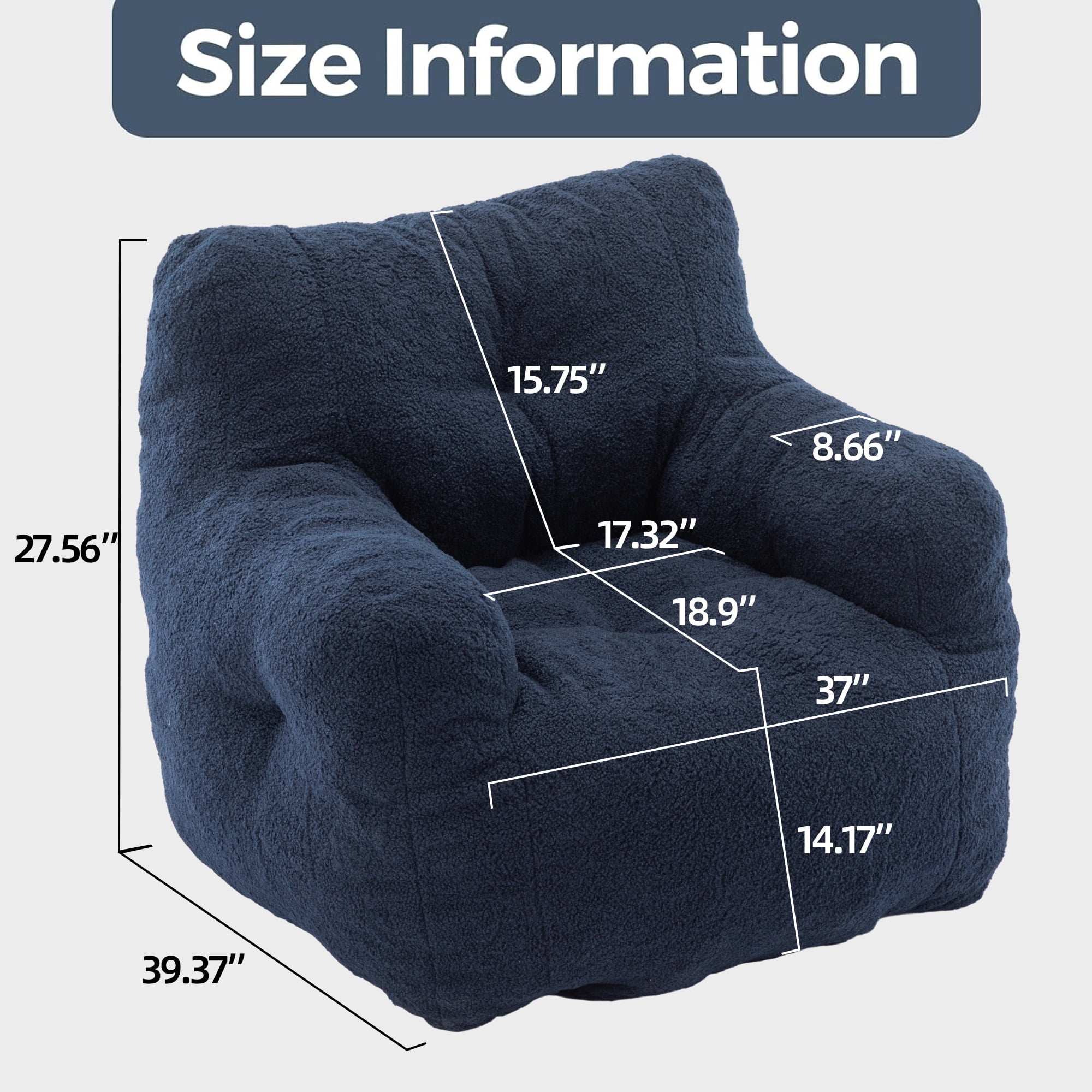 Luxury Teddy Bean Bag Chair with Memory Foam – Ultimate Comfort for Every Space! Indulge in plush relaxation with our premium Teddy Bean Bag Chair, expertly designed to blend softness, support, and style. Perfect for homes, lounges, or commercial spaces, this chair offers ergonomic comfort for everyone aged 5 to 18. Weights & Dimensions Color: Blue Upholstery Material: Teddy Seat Fill Material: Foam Back Fill Material: Foam with upholstery Weight Capacity: 250 lbs Frame Material: Foam Product Size: 39.37(D) * 37.0(W) * 27.56(H) inch Seat Height: 14.17” Seat Width: 17.32” Seat Depth: 18.9” Net Weight: 28.60 Lbs