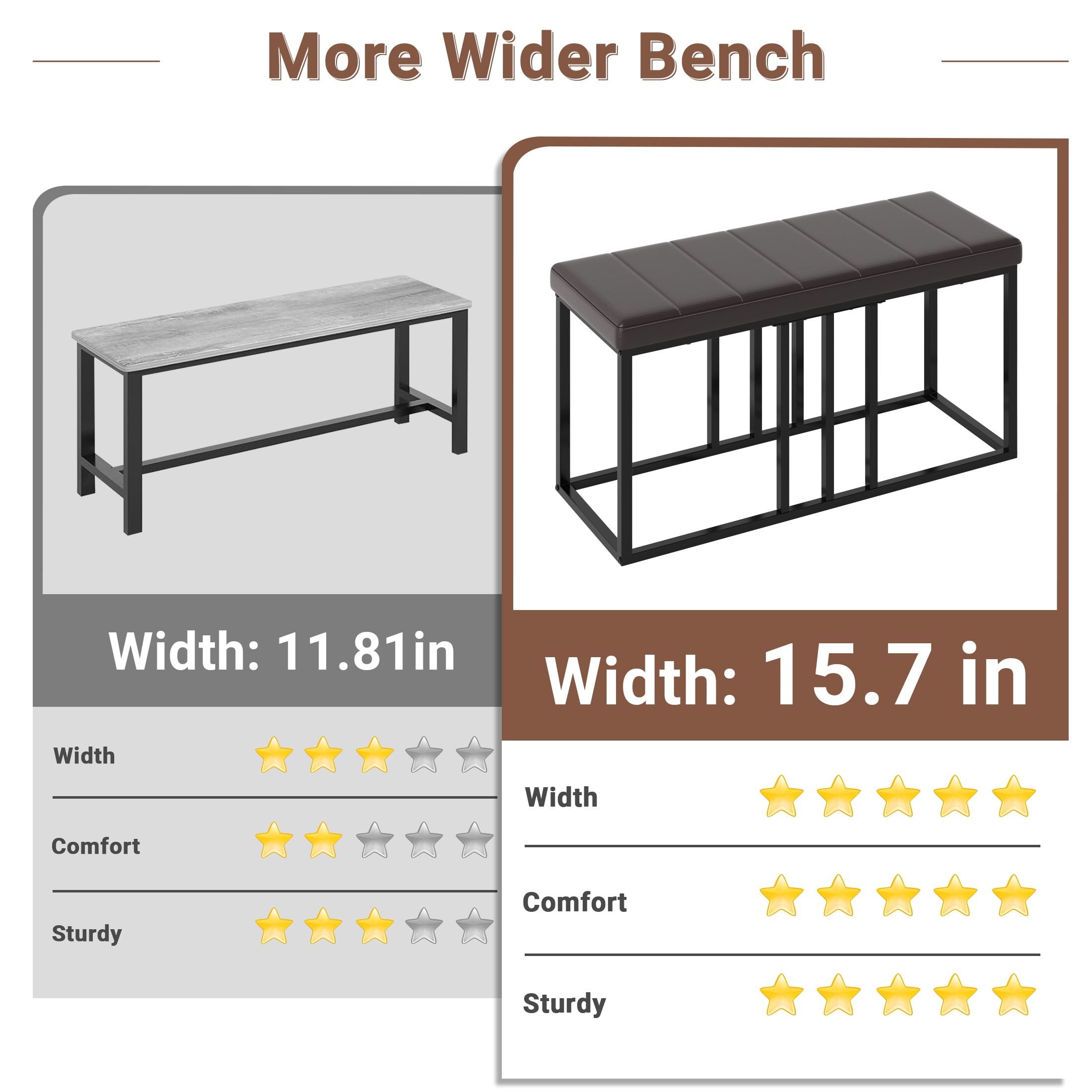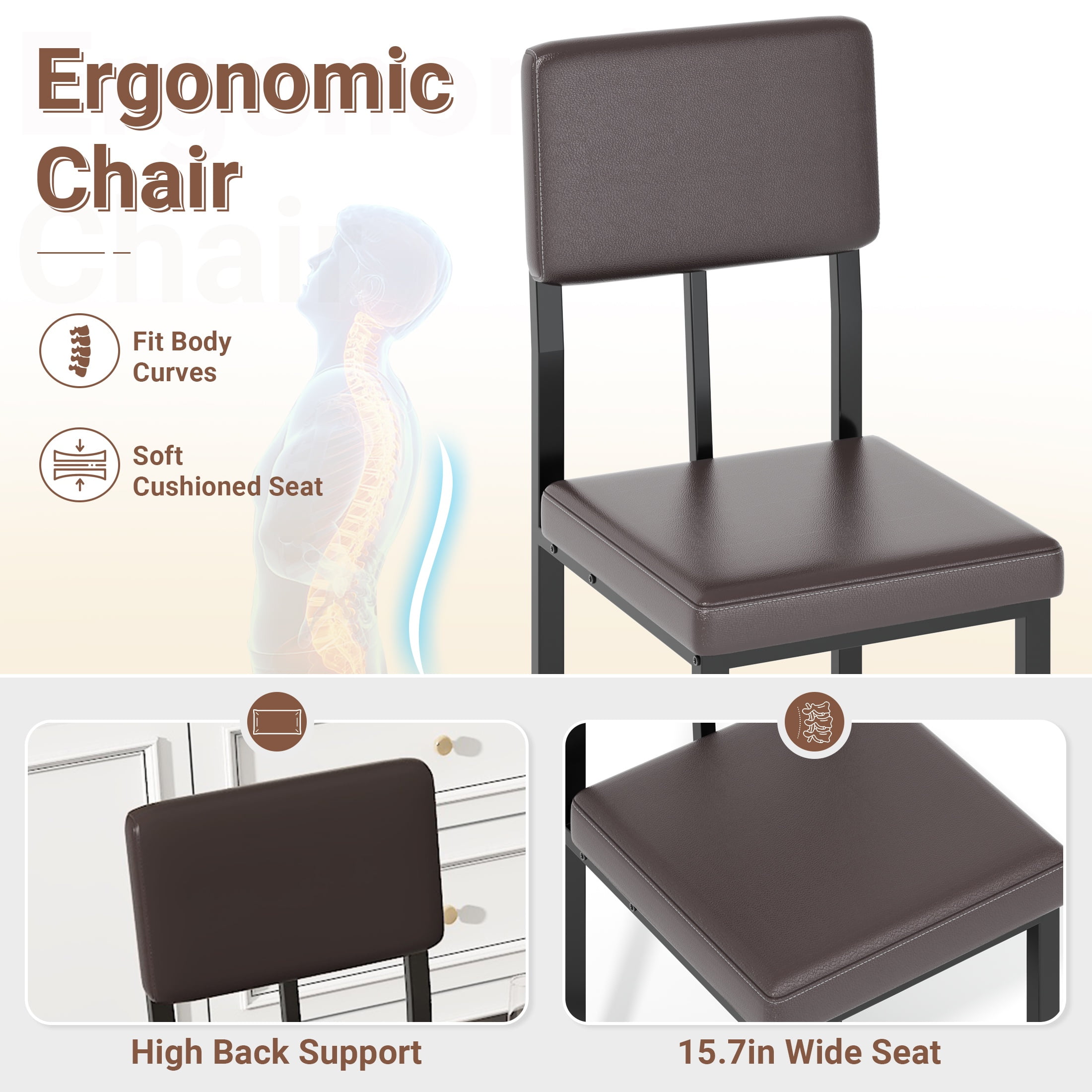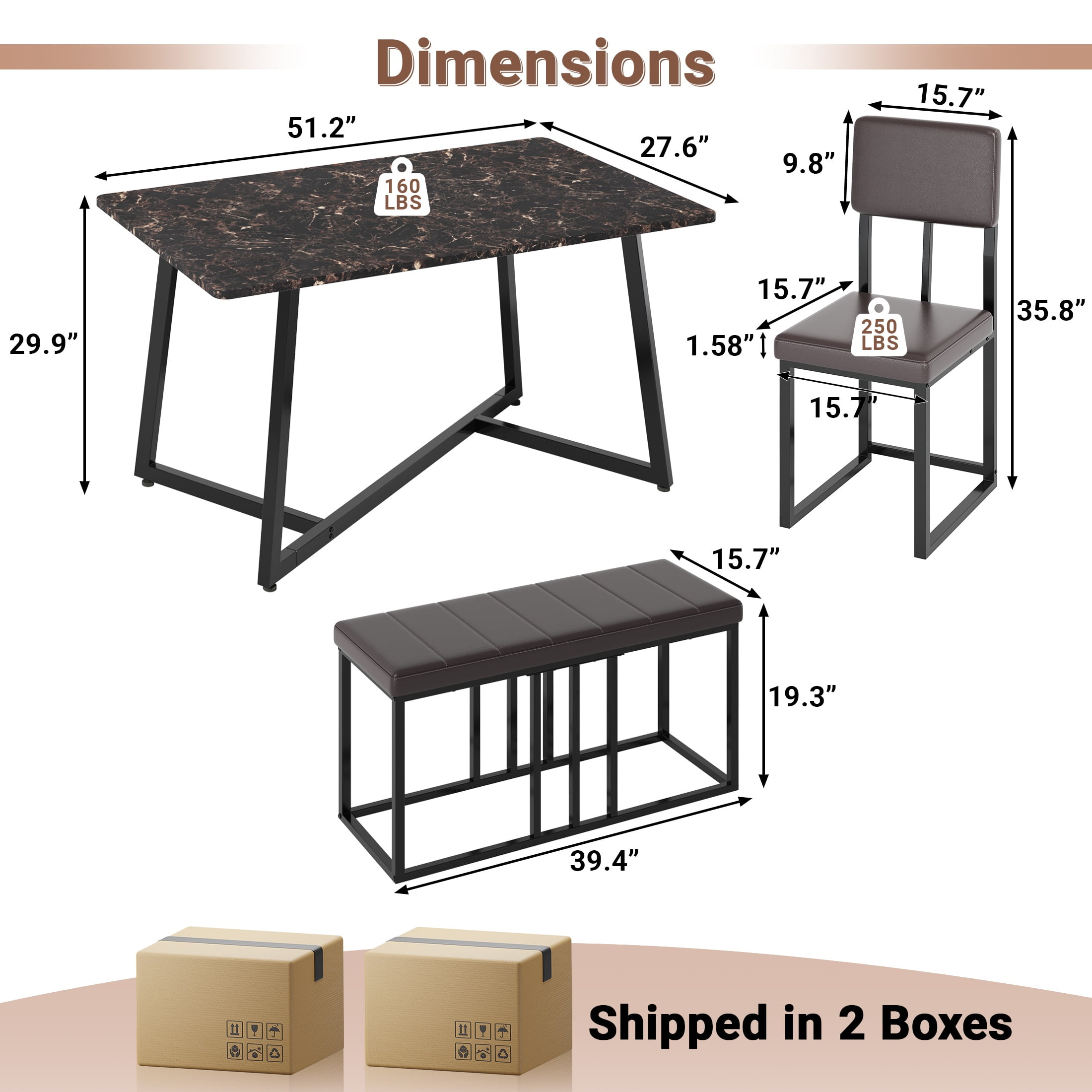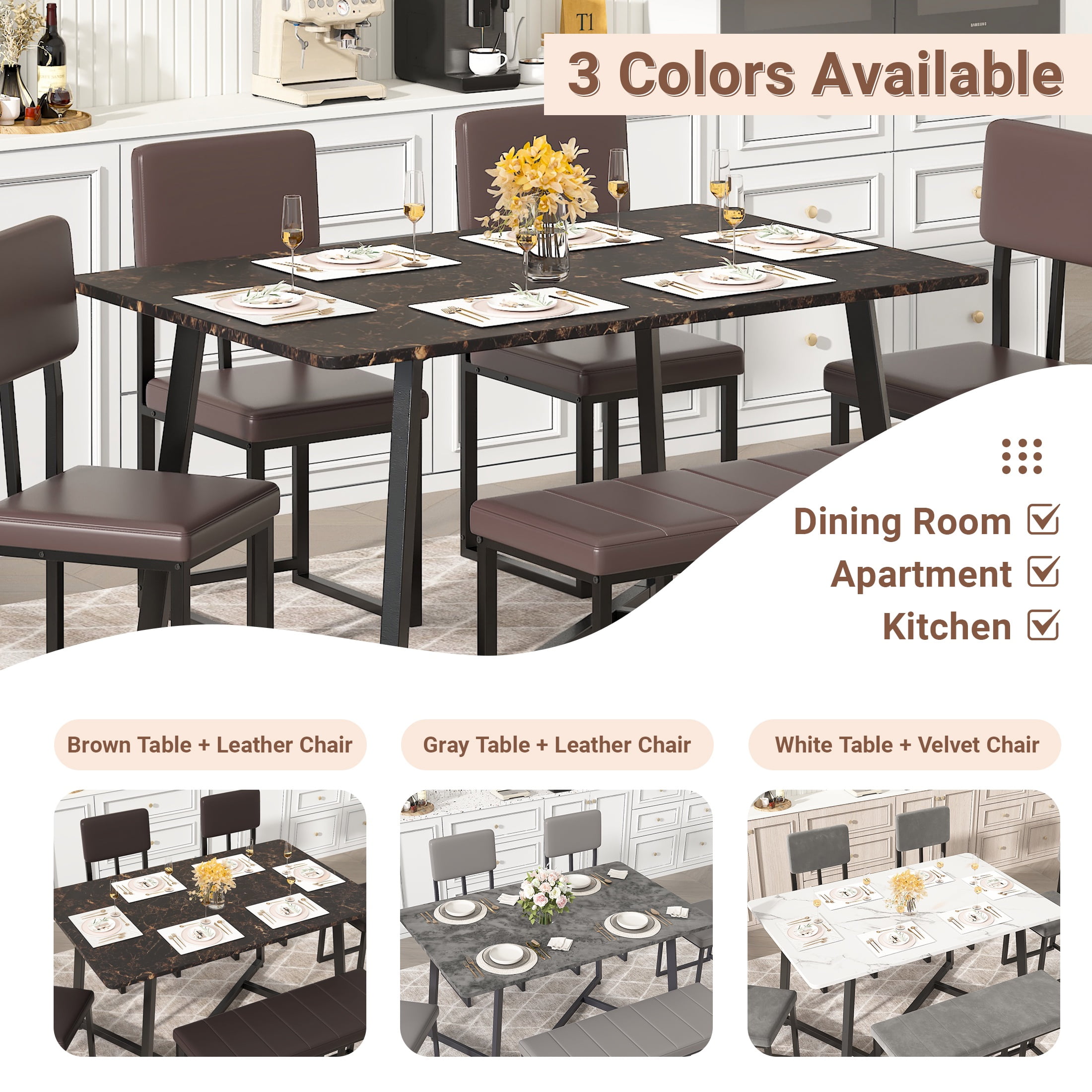 Scratch-Resistant Tabletop – The faux marble veneer tabletop is not only stylish but also scratch-resistant, ensuring a smooth and attractive surface for a long time. Faux Marble Dining Set – This set includes a 51.2″x 27.6″ x 29.9″ table, four 15.7″ x 15.7″ x 35.8″ chairs, and a 39.4″ x 15.7″ x 19.3″ bench, all made from durable wood board and iron frame, providing a long-lasting dining set for 6. Comfortable Seating – The chairs and bench are adorned with soft cushions and durable leather, providing a comfortable seating experience for all users. Fully Upgraded: We widened the seat, which is about 2 inches wider than other dining table and chair sets, making it more comfortable. Fully upgraded the frame design, with an increased number of support columns, making it more stable. Stylistic Elements – The modern and minimalistic design of the faux marble dining set adds a contemporary touch to any room, making it not only functional but also visually appealing. Easy to Assemble – The dining set is delivered with an instruction manual and all necessary hardware, making the assembly process easy and convenient.