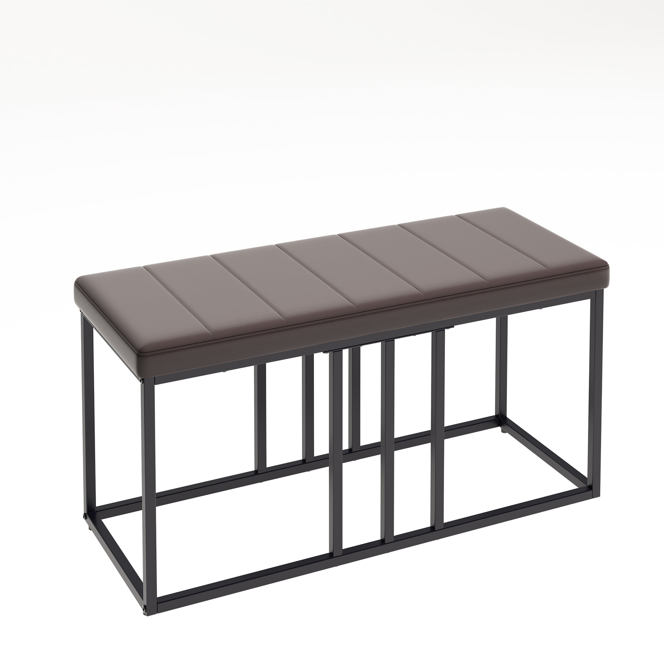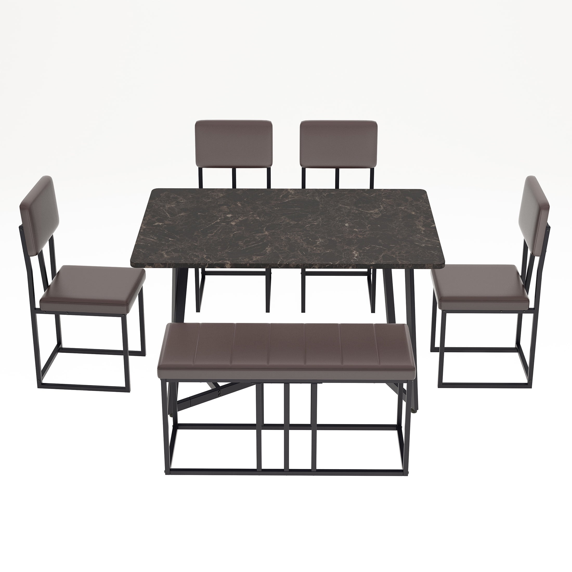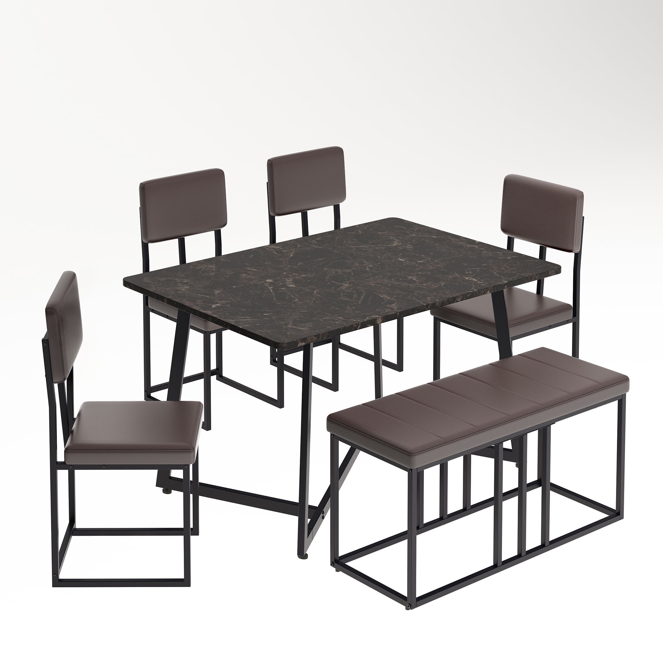 PORKISS Dining Room Set for 6, Modern Dining Table Set for 6 with Faux Marble Table, 4 Leather Chairs and 1 Cushion Bench, Metal Frame, Black + Brown
