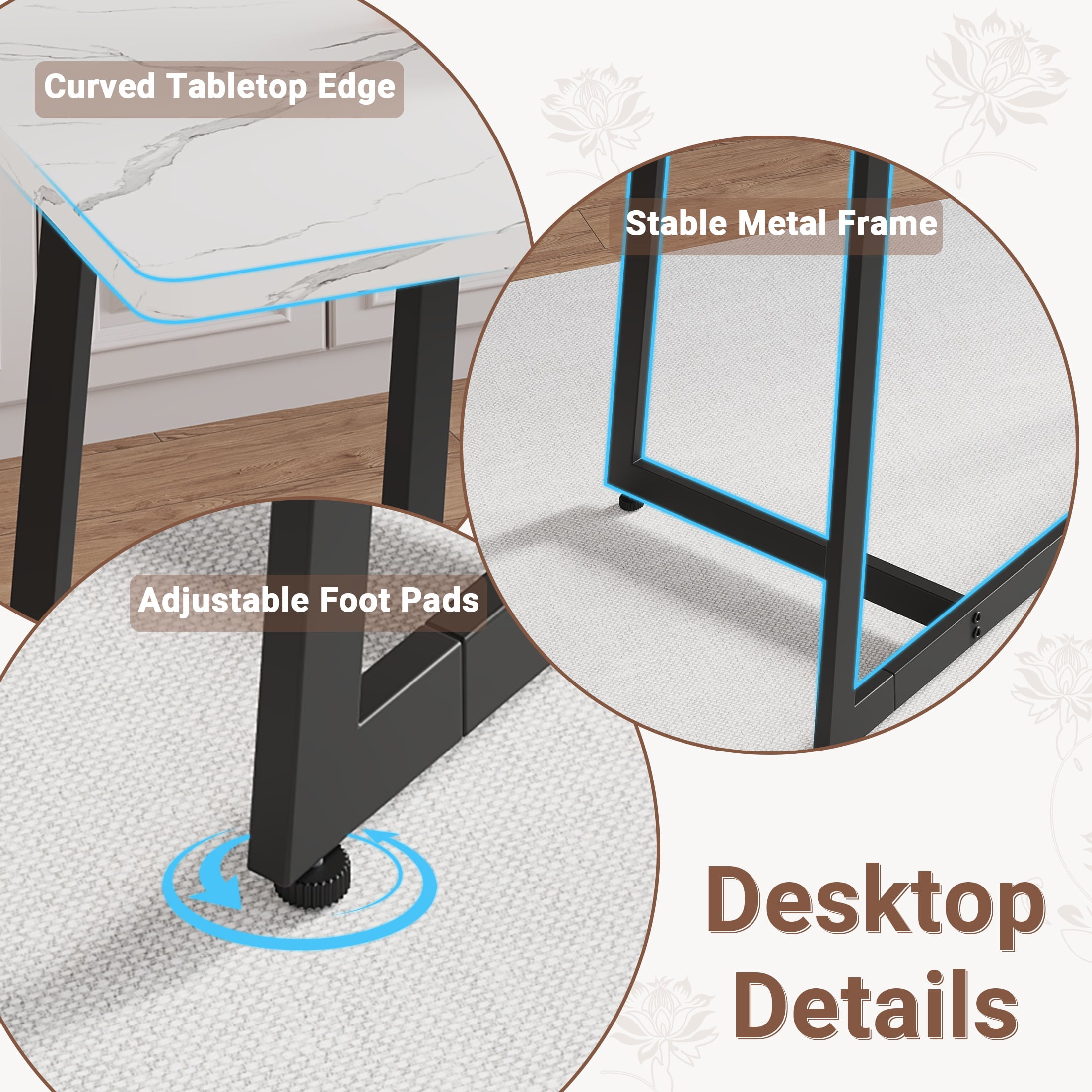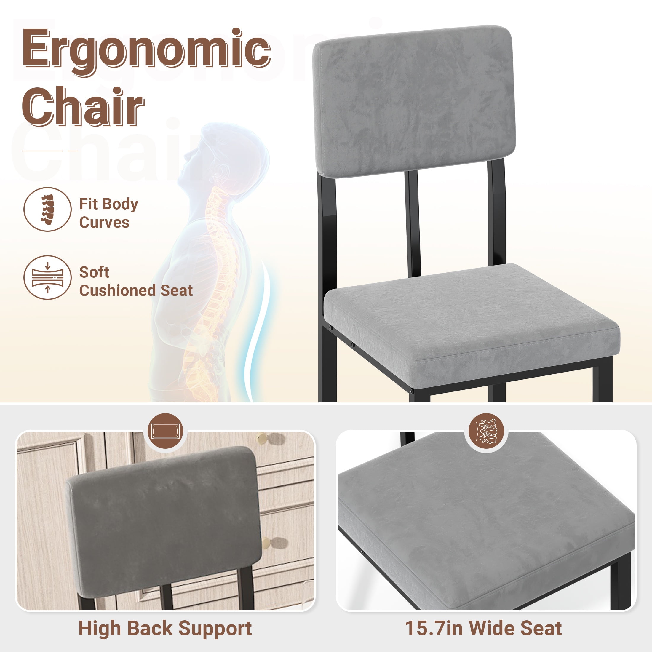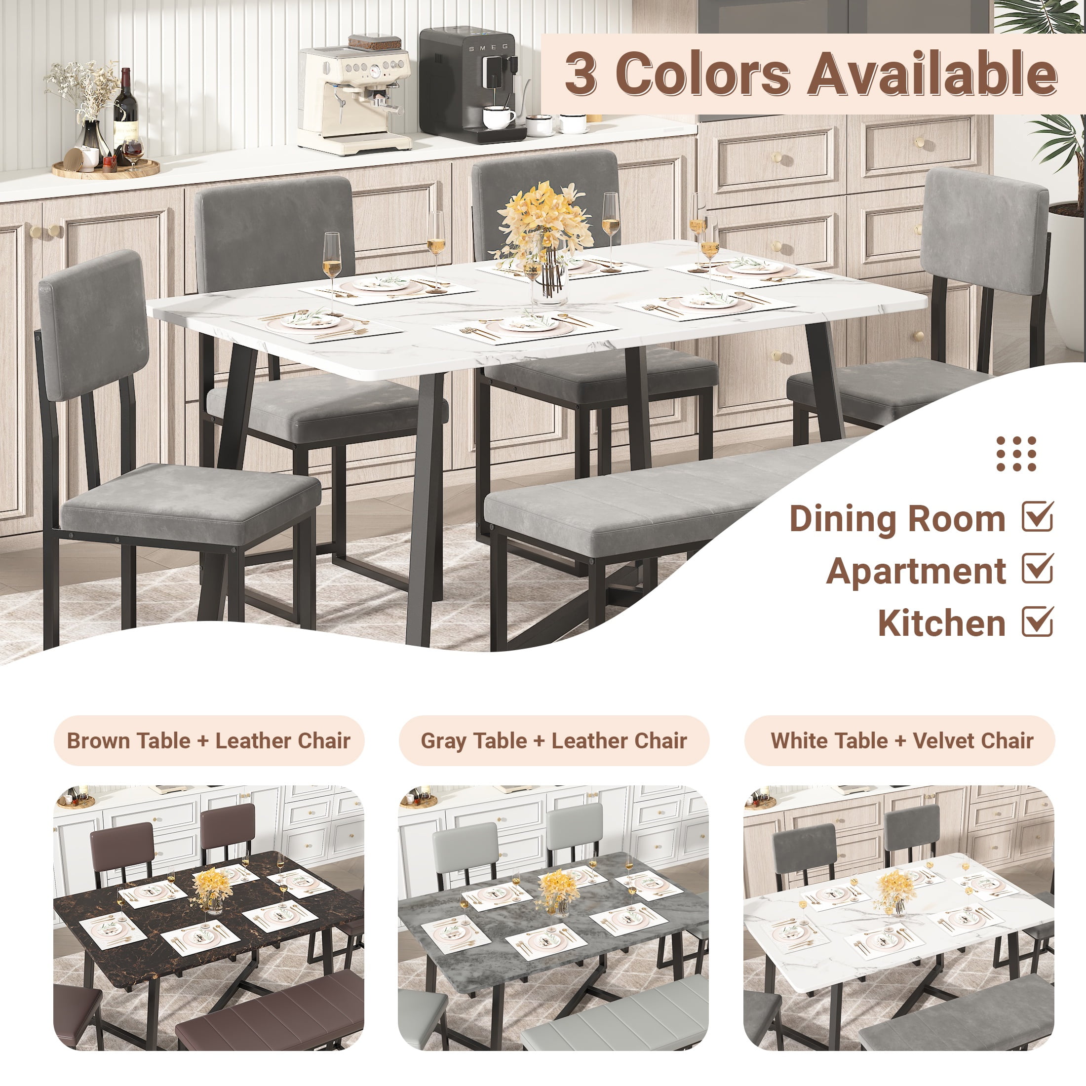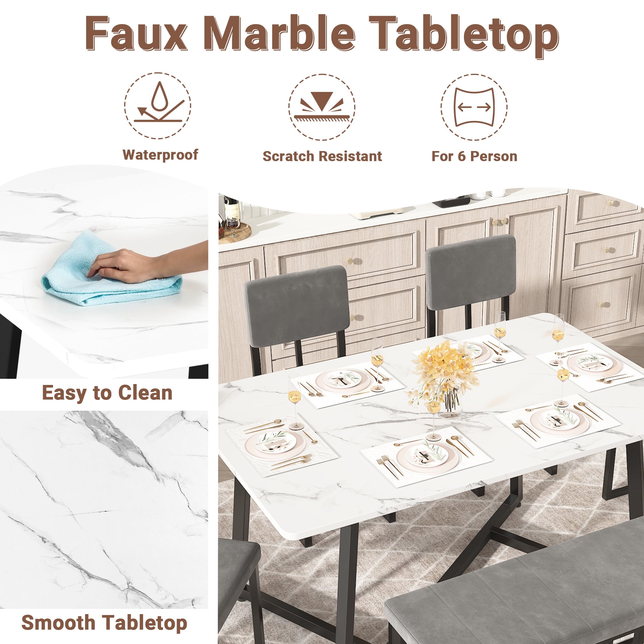 Scratch-Resistant Tabletop – The faux marble veneer tabletop is not only stylish but also scratch-resistant, ensuring a smooth and attractive surface for a long time. Faux Marble Dining Set – This set includes a 51.2″x 27.6″ x 29.9″ table, four 15.7″ x 15.7″ x 35.8″ chairs, and a 39.4″ x 15.7″ x 19.3″ bench, all made from durable wood board and iron frame, providing a long-lasting dining set for 6. Comfortable Seating – The chairs and bench are adorned with soft cushions and comfortable velvet fabric, providing a comfortable seating experience for all users. Fully Upgraded: We widened the seat, which is about 2 inches wider than other dining table and chair sets, making it more comfortable. Fully upgraded the frame design, with an increased number of support columns, making it more stable. Stylistic Elements – The modern and minimalistic design of the faux marble dining set adds a contemporary touch to any room, making it not only functional but also visually appealing. Easy to Assemble – The dining set is delivered with an instruction manual and all necessary hardware, making the assembly process easy and convenient.
