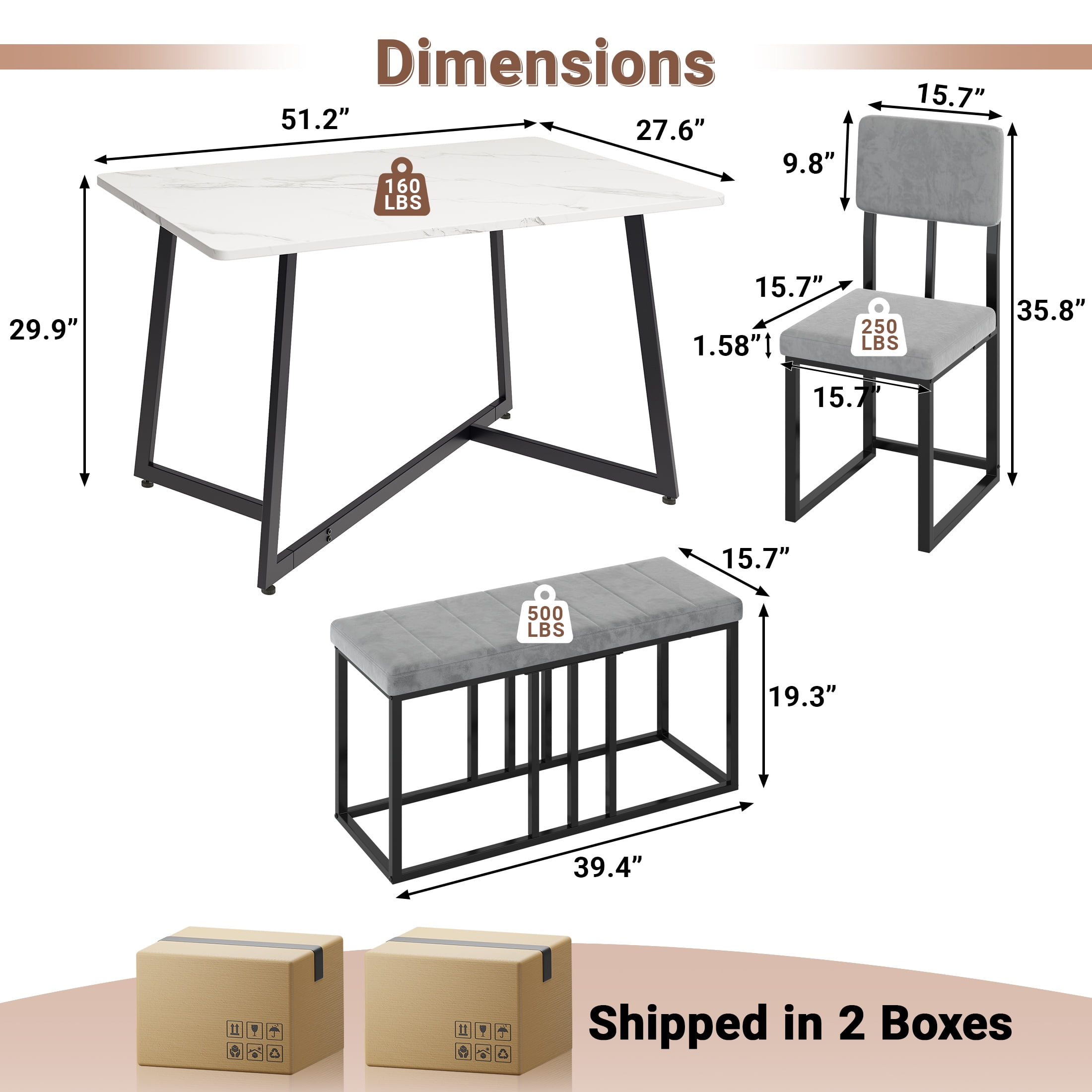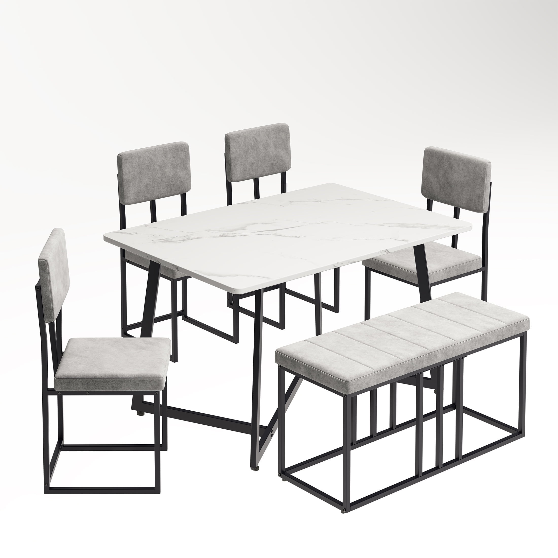 PORKISS 6-piece dining set. This ensemble, which includes a faux marble table, four cushioned chairs, and a cushioned bench, promises to enhance your dining experience. The set is crafted with wood and an iron frame for durability and strength, ensuring it can bear weight and stand the test of time. The faux marble veneer tabletop is scratch-resistant, maintaining its elegance even with daily use. The rounded corners of the tabletop add a safety element, preventing injuries from collisions. The cushioned chairs and bench, covered in comfortable velvet fabric, offer a comfortable seating experience. This dining set’s modern and minimal design adds a contemporary touch to your space. With an easy-to-assemble guide and all the necessary hardware provided, you can set it up in no time. The PORKISS dining set is not just a piece of furniture; it’s a statement of style, quality, and functionality. Specifications: Product Type: Dining Table Set for 6 Color: White + Gray + Black Material: Wood, Metal, Velvet Table Dimensions: 51.20*27.6*29.9 in Chair Dimensions: 15.7*15.7*35.8 in Bench Dimensions: 39.4*15.7*19.3 in Seat Thickness: 1.58 in Table Weight Capacity: 160 lbs Chair Weight Capacity: 250 Ibs Bench Weight Capacity: 500 Ibs Product Weight: 96.12 lbs Packages Number: 2; the two packages may arrive at different times. Please wait patiently for them to arrive. Package Includes: 1 x Table 4 x Chair 1 x Bench 1 x Assembly Kit 1 x Instruction