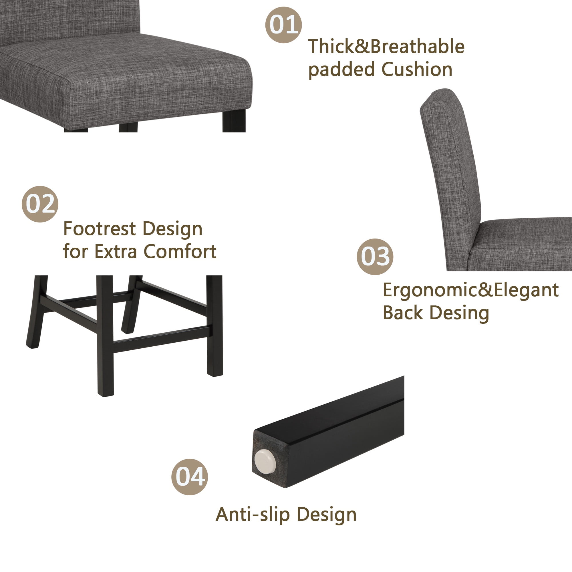 Modern 5-Piece Counter Height Table Set: The counter height table set consists of a square wooden table and four upholstered chairs, ideal for family dinners and gatherings with friends, with a clean and modern design that is perfect for any dining room. Durable & Sturdy Construction: Crafted with a robust plywood frame and rubberwood legs, the counter height table is built to last. The tabletop features a medium-density fiberboard for added reinforcement, ensuring durability and ease of maintenance for long-term use. Comfortable Dining Chairs: The chairs boast solid wood legs for enhanced stability, padded seat cushions, and ergonomically curved backrests for maximum comfort. Non-slip pads on the legs protect your floors from scratches while enhancing safety and stability. Space-Saving Solution: Designed with small spaces in mind, the chairs can be conveniently tucked under the table when not in use. This space-saving feature makes it an excellent choice for apartments, condos, or other compact areas. Easy Assembly & Dimensions: Each piece is labeled for quick and hassle-free assembly, with detailed instructions included.