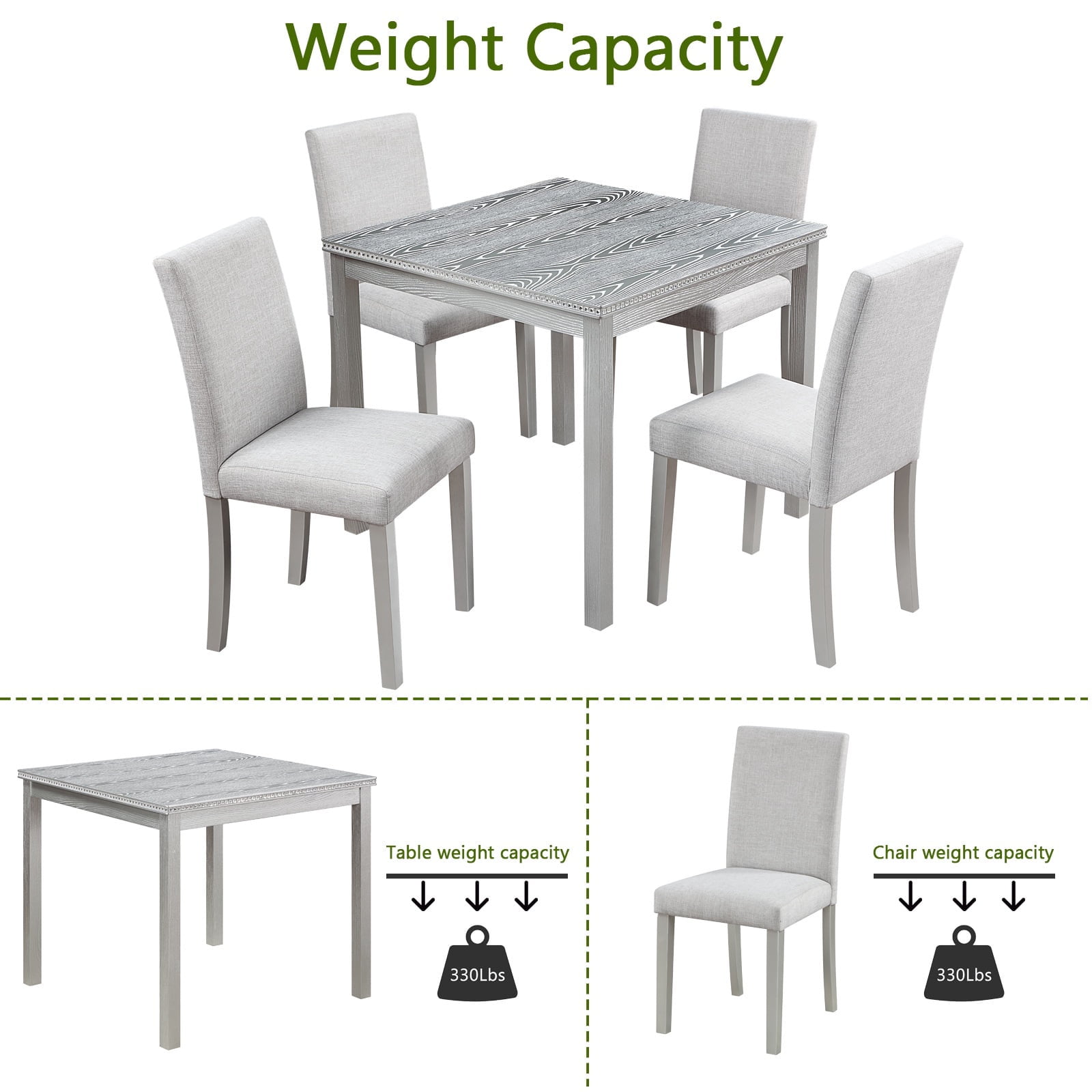 Trusted Quality — The dining table set is made from durable high-quality pine solid wood. Its stable construction ensures spaciousness and sturdiness. The tabletop features a natural wood grain design that adds elegance and care, while the smooth, water-resistant surface is easy to clean with a simple wipe. The table corners have curved edges, ensuring a smooth touch. The wide tabletop and solid legs make it ideal for your home. Contemporary Dining Set – Designed with high-brow essentials in a rich finish, comfortable seats, and modern lines. And the workmanship of the table set creates an elegant and charming atmosphere for your home decor. Wide Application and Adequate Space – The kitchen table set includes a dining table and 4 upholstered dining chairs. It can be applied in various situations, kitchen, dining room, restaurant, and coffee shop, featuring a perfect decoration for domestic use. It maximizes the daily dining enjoyment with your family or friends due to the plenty of space it provides to have a meal. Comfortable Upholstered Chairs — The chairs are made of high-quality solid wood and have comfortable, upholstered seats and backrests with high-quality foam padding. The backrests are thick and soft, providing stable support and comfort. The seats are wide and the cushions are soft, making dining more relaxing. Easy to Assemble – Come with clear instructions and required tools, It will only take you a little time to put together. Our warehouse is in America. If there is any part missing or damaged during shipping, please contact us, we will help you to solve the problem ASAP. Product Dimensions: Table: 45.5″L x 28.5″W x 30″H Chair: 16.5″W x 21.5″D x 35″H Seat Depth: 16″ Seat Height: 19″ Specifications: Product Name: Dining Table Set of 5 Table Material: Pine Wood+MDF Chair Material: Acacia Wood+Bent Wood+Rubber Wood+Fabric+Foam Weight Capacity: Table: 330 LBS, Chair: 330 LBS/piece Upholstered Chair: Yes Assembly Required: 30 min Additional Tools Required: All tools included Package Number: 2 Care & Maintenance: Wood Furniture Care: We recommend dusting frequently with a clean, soft, dry, lint-free cloth. Clean the surface by rubbing in the direction of the grain and wipe dry. Fabric Materials Care: Please use a soft cloth with cool soapy water and a blotting motion to remove the stain. Fully air dry. Package Includes: 1 Dining Table + 4 Upholstered Chairs Notes: Please read the assemble manual in advance. Please do not over-tighten nuts, as this may cause distortion or breakage. Items may slightly differ from photos in terms of color due to the lighting or your monitor’s display. Manual measurement has been used, there may be some reasonable error.