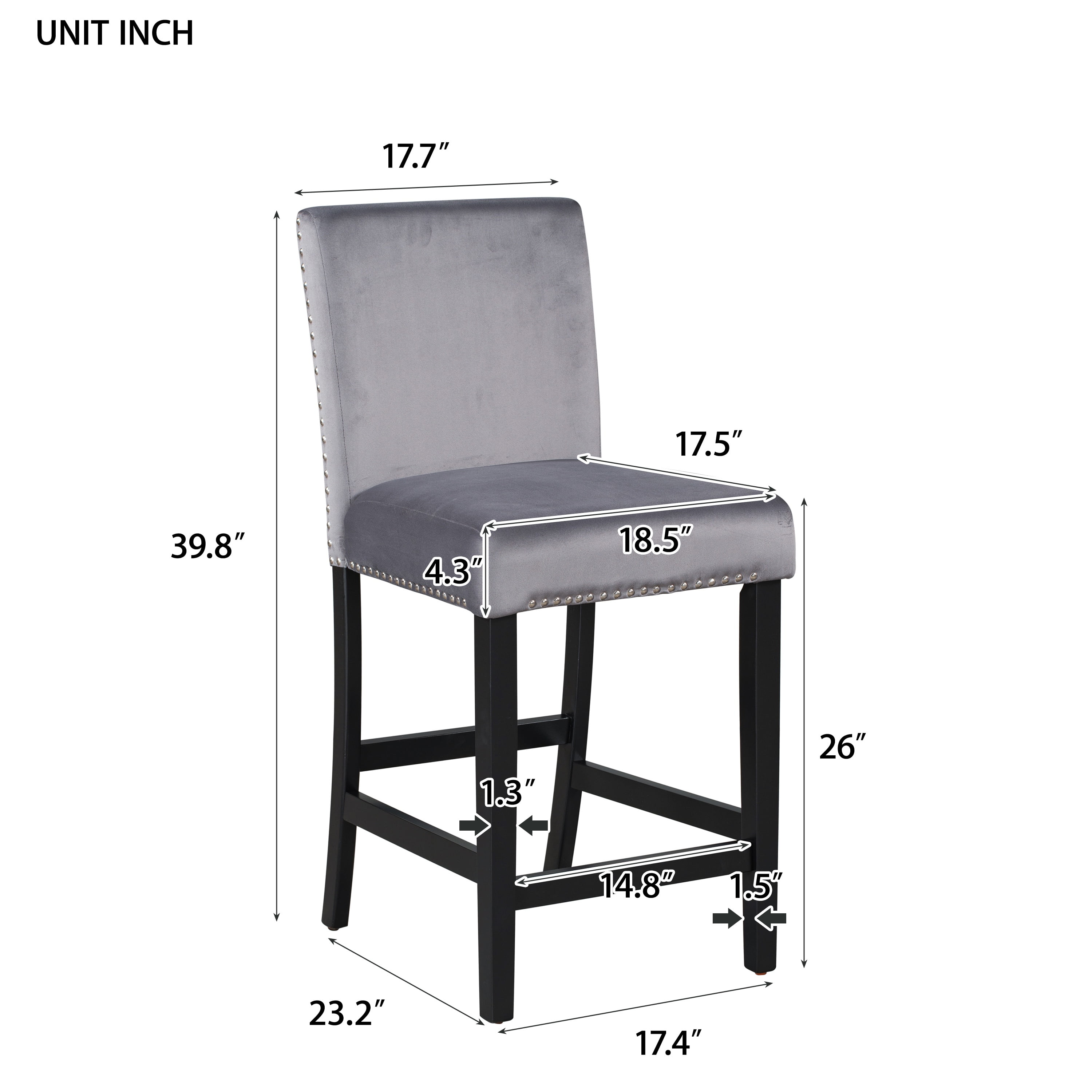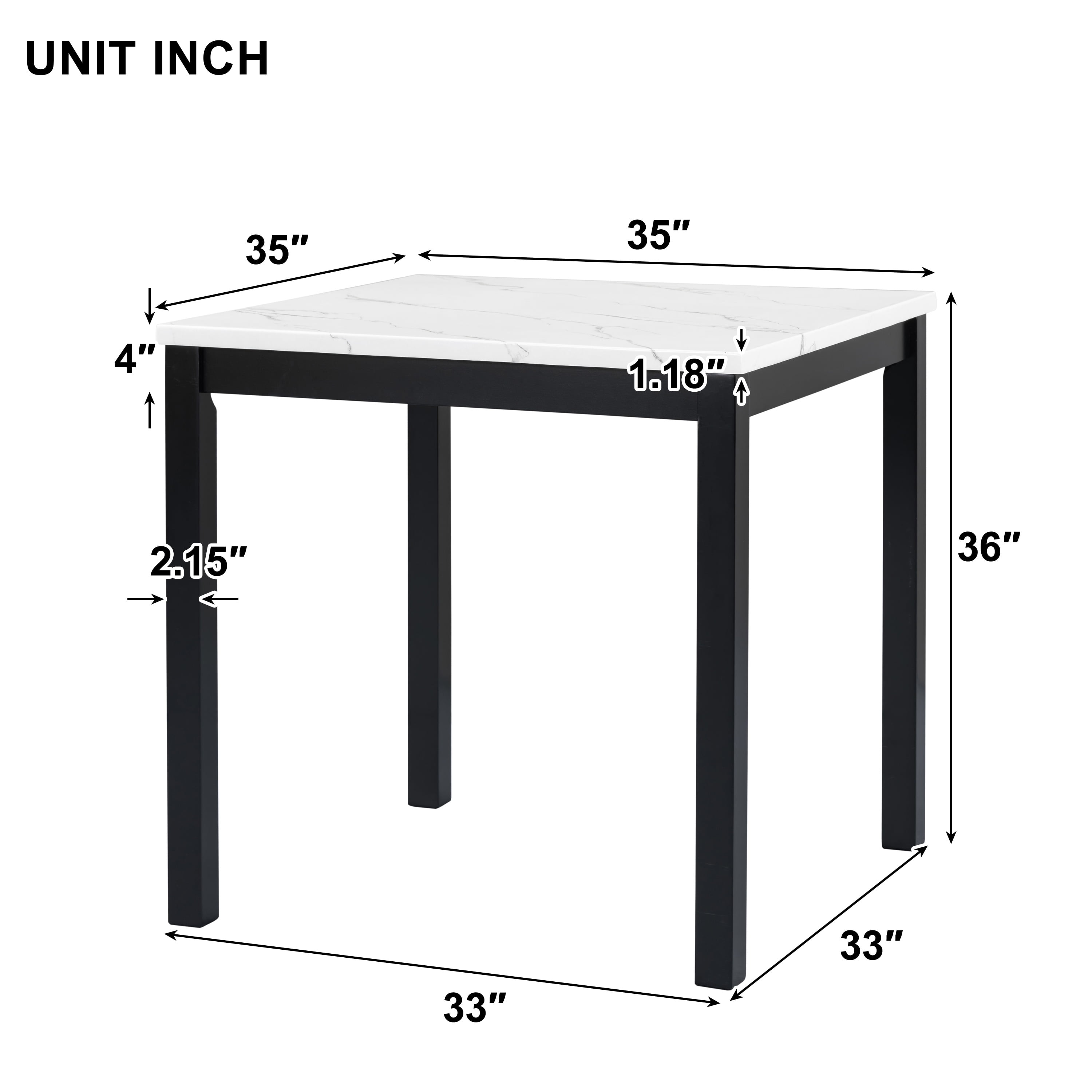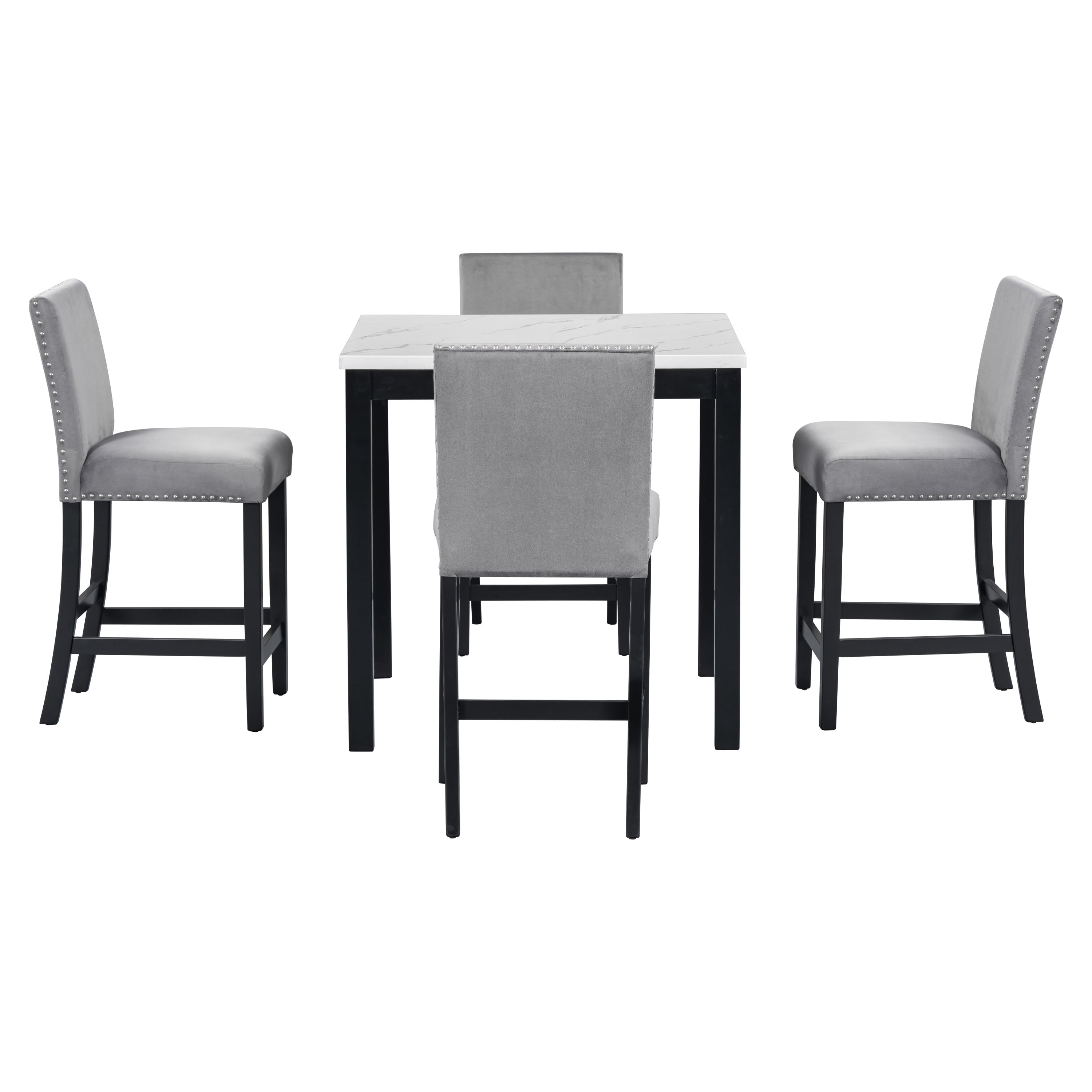 Faux Marble Dining Table – This dining table measures 35″ x 35″ x 36″, and is made of top-quality MDF and marble veneer, providing a shiny finish that enhances the aesthetic of any room. Easy to Clean – The table surface is processed with a special coating, making it resistant to stains and easy to clean with a damp cloth, keeping it glossy and smooth over time. Counter Height Chairs – The set includes bar height chairs upholstered with velvet for maximum comfort. The chairs are designed with sturdy rubber wood legs and are accented with chic silver nails, adding elegance and style. Stylistic Elements – The shiny faux marble dining table and velvet cushioned chairs complement various home decor. The contemporary design instantly brightens your dining room or kitchen, creating a stylish and comfortable dining environment. Durable Materials – The table is made of high-quality MDF and marble veneer, ensuring durability and longevity. The chairs are made with soft velvet cushions and sturdy rubber wood legs, guaranteeing comfort and stability. Specifications: Product Type: 5-Piece Counter Table set Color: Gray & Black & White Table Material: Faux Marble, Rubber Wood, MDF Chair Material: Rubber Wood, MDF, Velvet, Foam Table Dimensions: 35*35*36 in Chair Dimensions: 18.5*23.2*39.8 in Table Weight: 48.5 lbs Chair Weight: 15.4lbs/pc Table Maximum Weight: 500 lbs Chair Maximum Weight: 250 Ibs Packages number: 2 Package Includes: 1 x Table 4 x Chair 1 x Assembly Kit 1 x Instruction