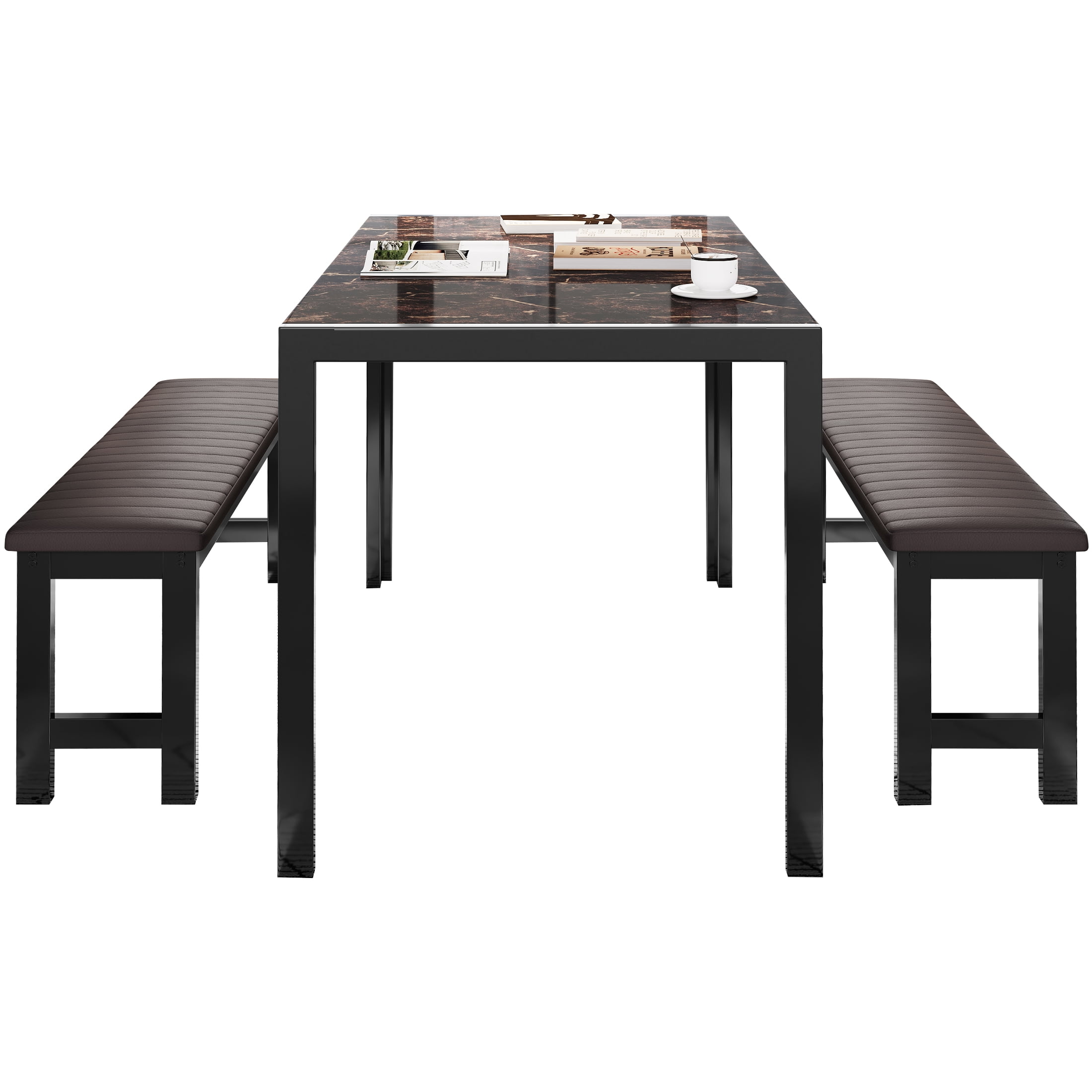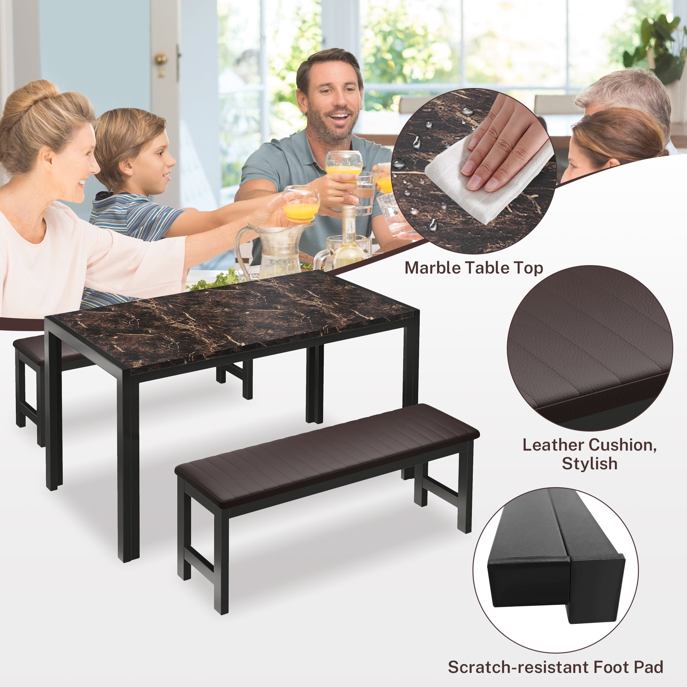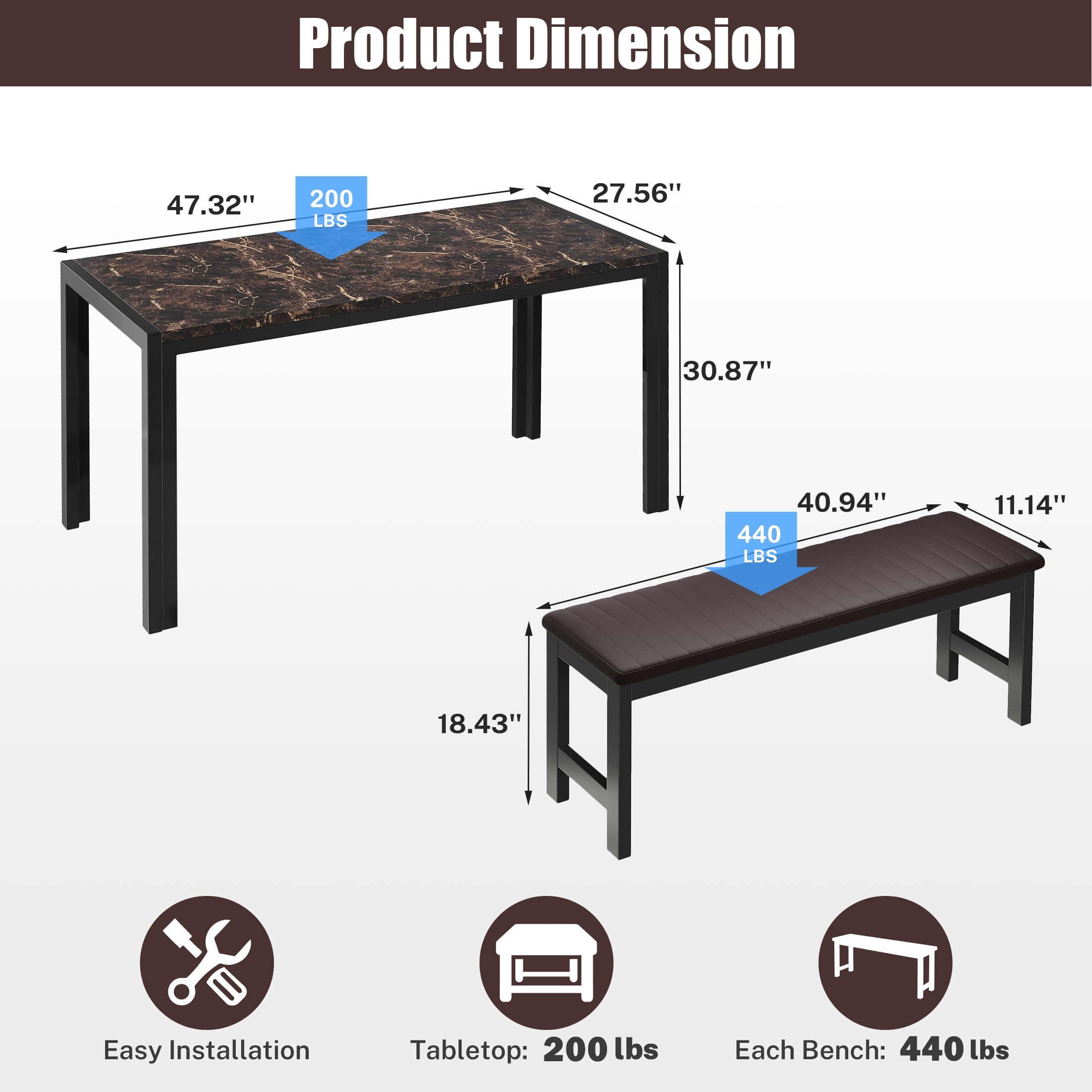 Built to Last: Crafted with heavy-duty, thickened steel tubing frames for exceptional stability. The dining table boasts a 200 lb weight capacity, while each sturdy dining bench supports an impressive 440 lbs. Superior Comfort: Relax on plush bench seats featuring soft PU leather fabric upholstery over high-resiliency foam cushions. Designed for comfort, even during long meals or gatherings. Stylish & Easy Clean: The smooth marble-look laminate tabletop provides a sophisticated, modern aesthetic. It resists stains and wipes clean effortlessly – perfect for busy families and everyday use. Effortless Assembly: Get ready to dine in under 30 minutes! Includes clear paper instructions and all necessary tools. Our easy assembly furniture is hassle-free. Space-Saving Design: The sleek bench seating tucks neatly under the table, making this kitchen table set ideal for small space dining solutions and apartment furniture.