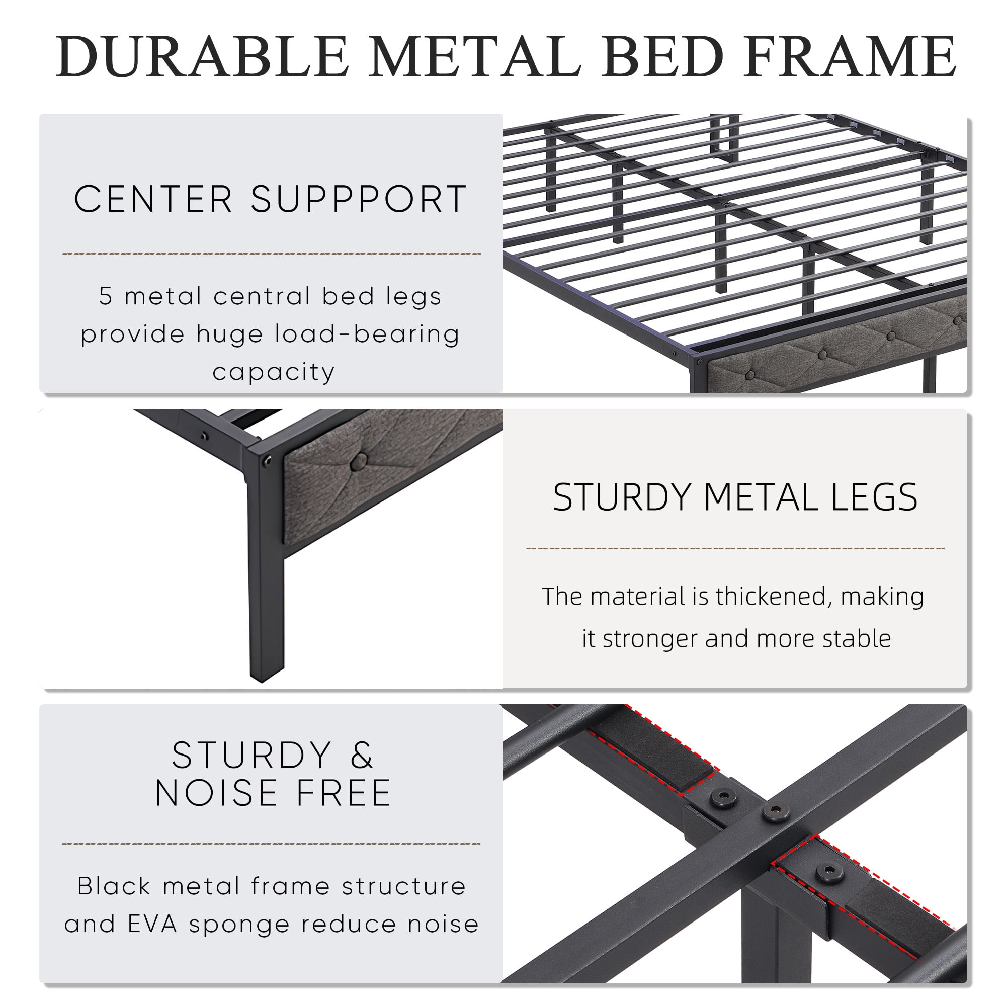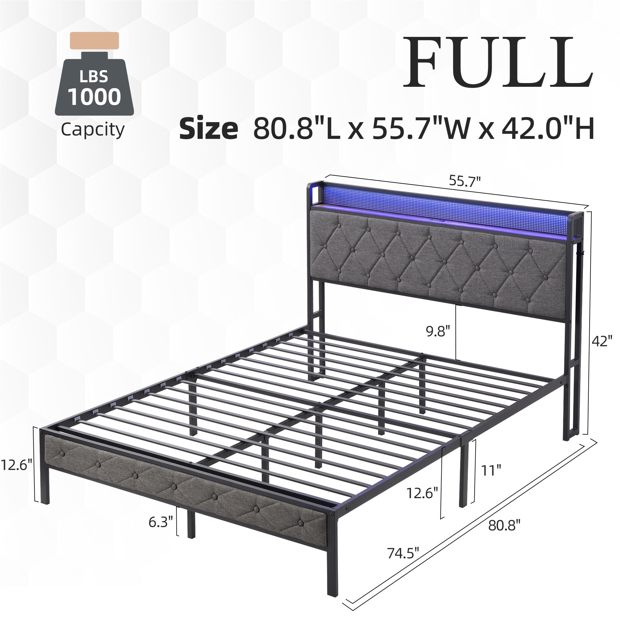PORKISS Full Modern Wood Iron Platform Bed with USB Ports, Dark Gray Stylish platform bed with a fabric upholstered headboard that enhances any bedroom decor Equipped with built-in 20W fast-charging ports, including 3 USB ports and 1 Type-C port for convenient charging Features a storage headboard and smart RGB LED lights with over 60,000 color choices for personalized ambiance Constructed with 17 heavy metal slats and 11 legs for a sturdy and noise-free design Ample under-bed storage space to keep your room organized and tidy