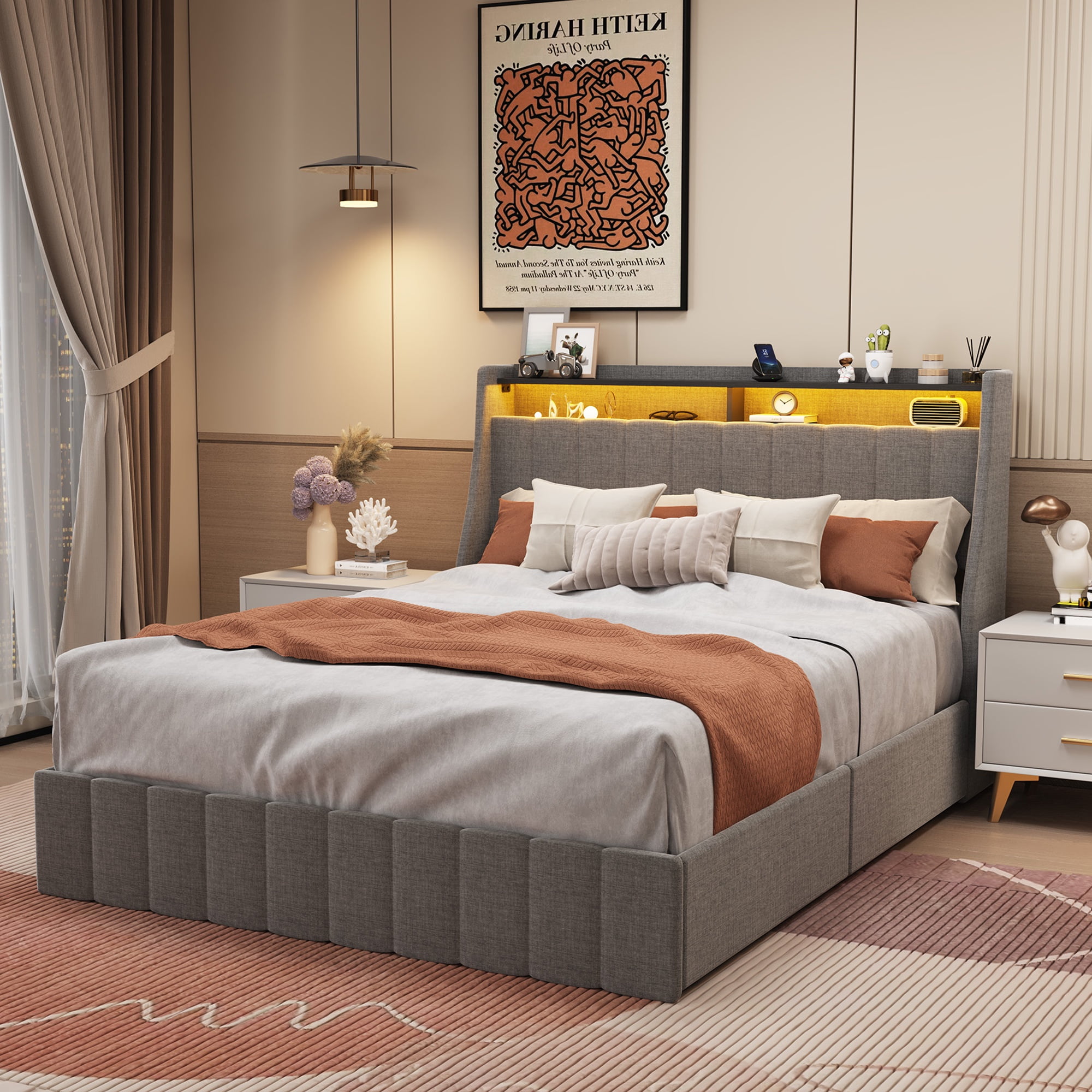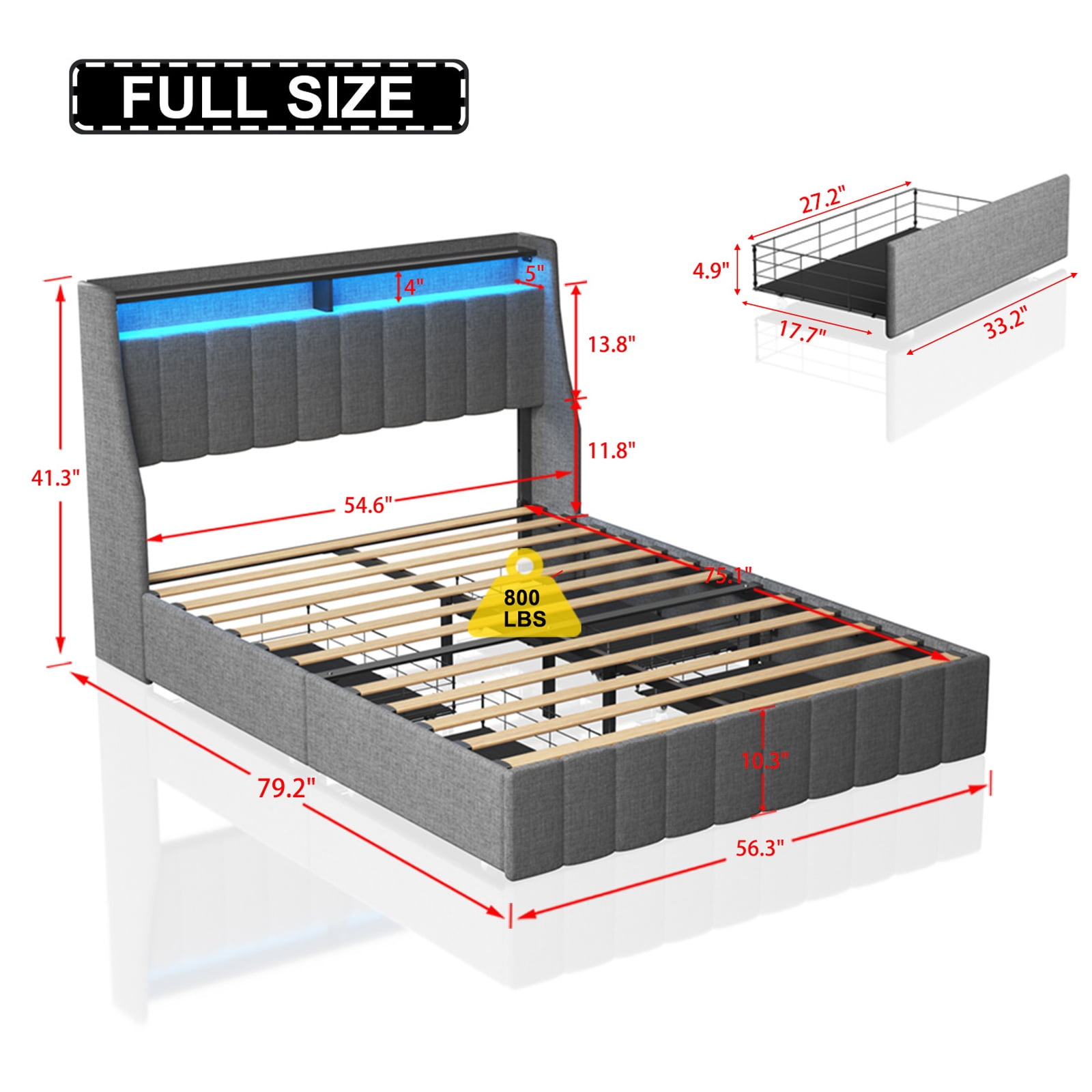 PORKISS Full Size LED Bed Frame with Drawers, Linen Upholstered Bed, Metal Platform Bed with Soft Cushioned Headboard for Adults Teens, Light Grey