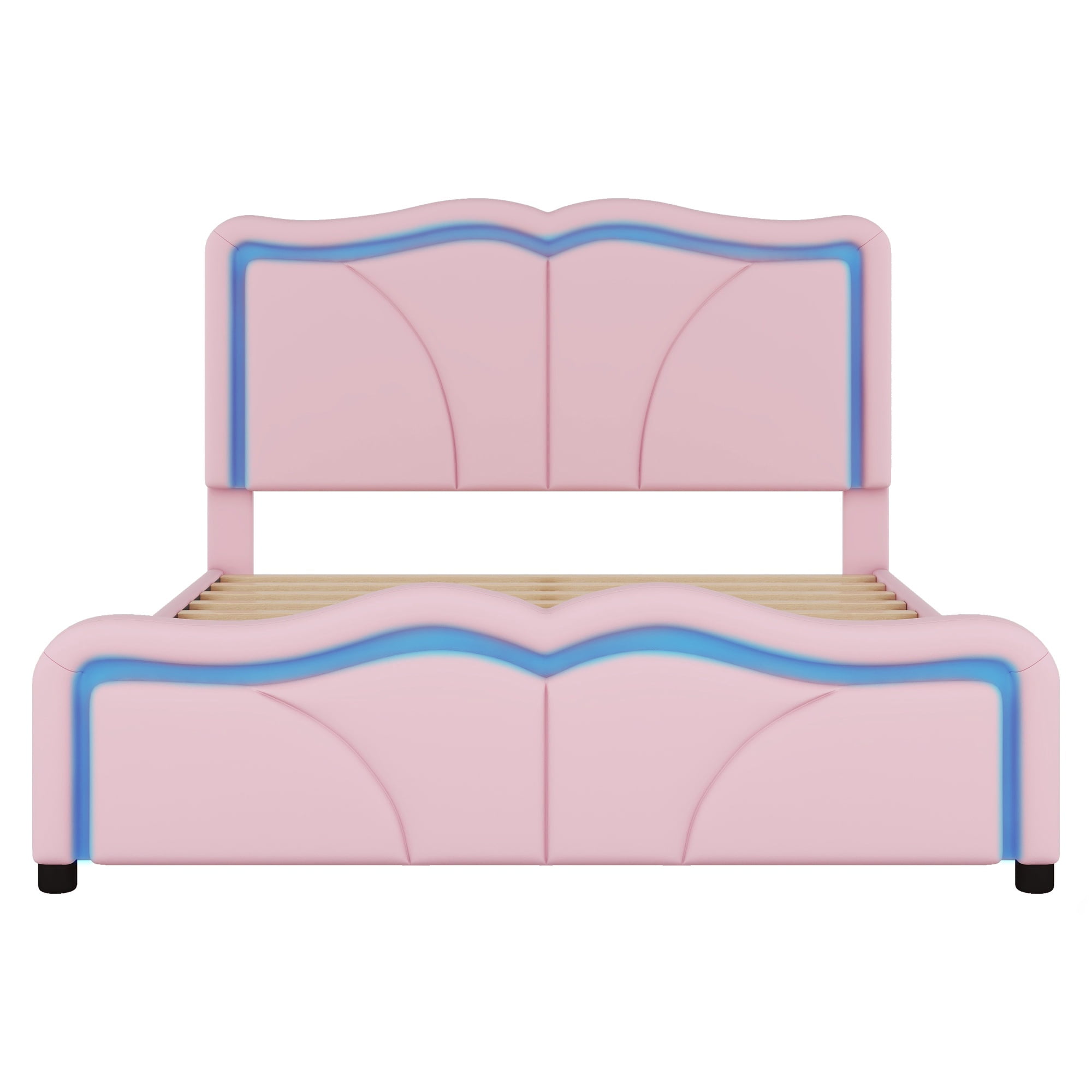 PORKISS Full Size LED Bed Frame, PU Leather Upholstered Bed, Wood Platform Bed with Soft Cushioned Headboard, Princess Bed, Pink