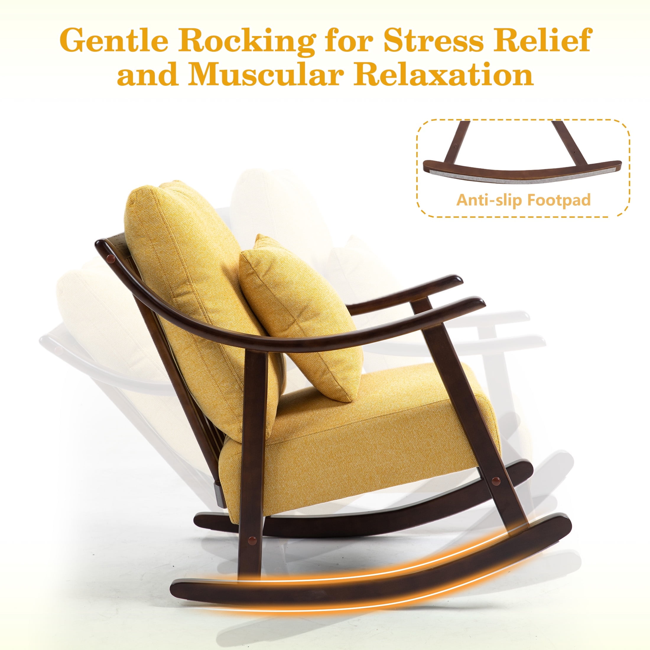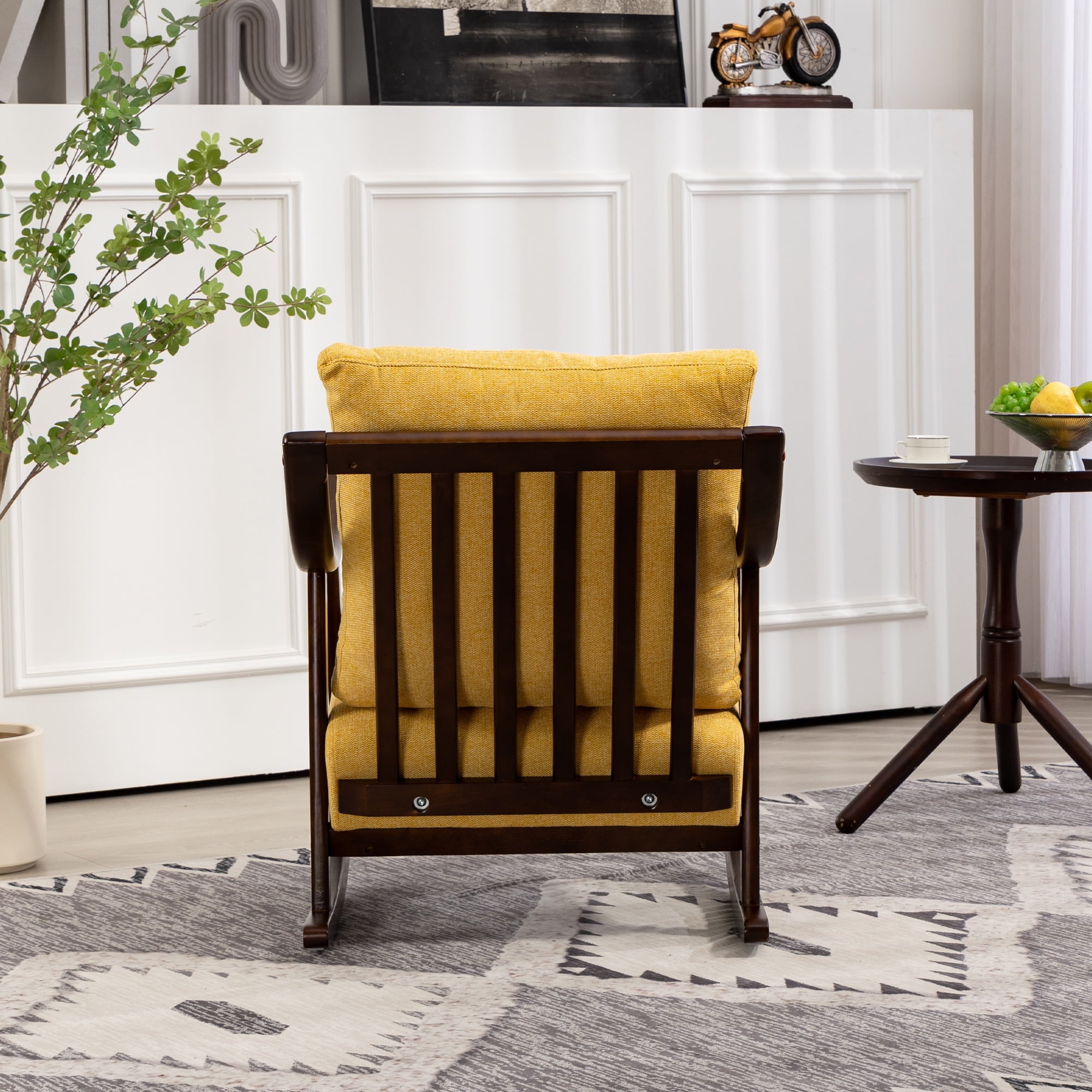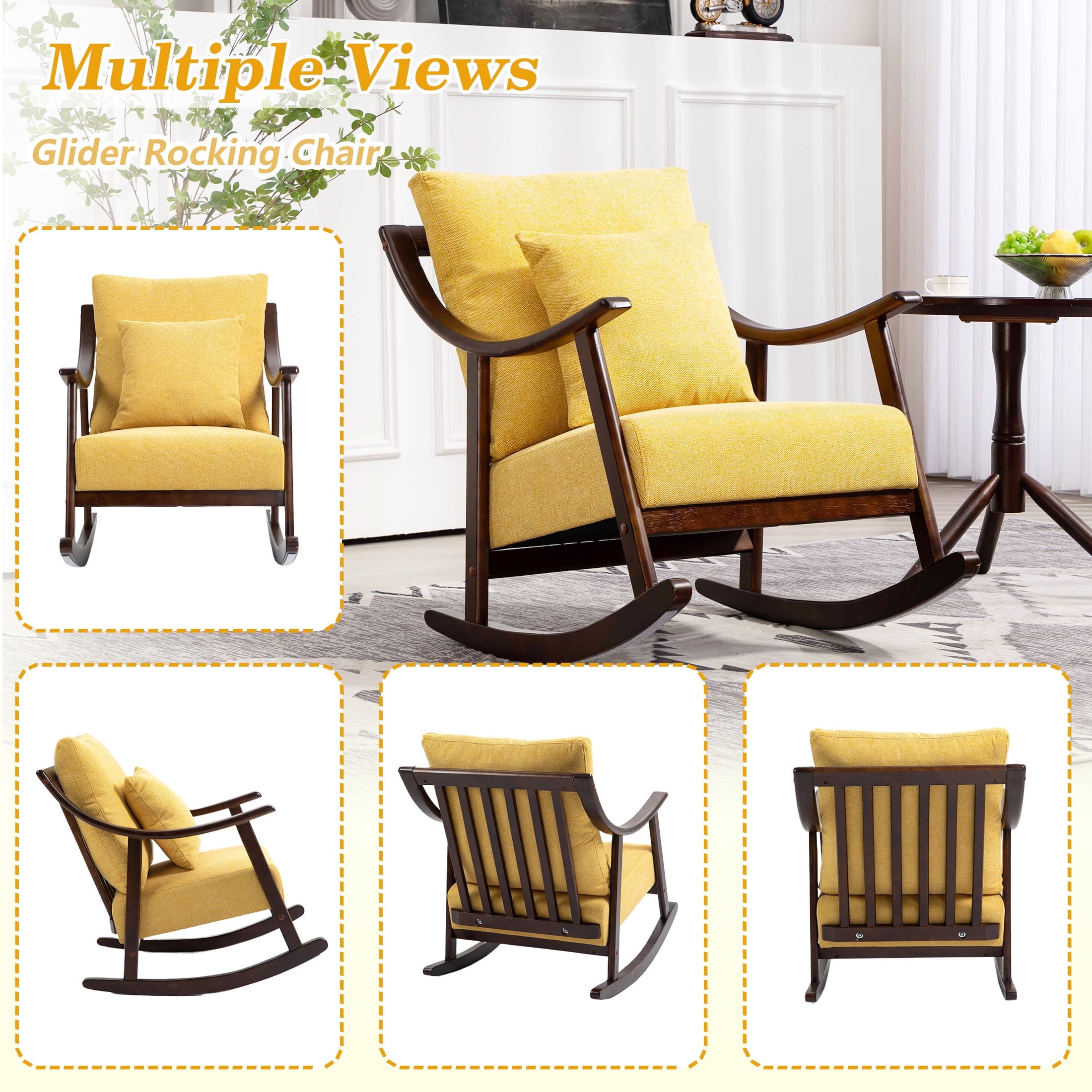 PORKISS Modern Rocking Chair with Padded Lumbar Pillow, Mid-Century Accent Chairs with Solid Wood Frame for Living Room Bedroom Playroom. This beautifully crafted accent chair introduces timeless elegance and ultimate relaxation into your home. Designed to provide comfort and style, this chair seamlessly blends medieval charm with modern minimalist design, making it the perfect addition to any living space. Specifications: Material: Solid Wood Frame, Linen Fabric, High Elasticity and High-density Sponge Filling Fabric: Linen Load Capacity: 300 lbs Color: Yellow Dimensions: (26.0 x 23.0 x 33.5)” (L x W x H) Weight: 23.3lbs / 10.57kg Package Includes: 1 x Rocking Chair 1 x Lumbar Pillow