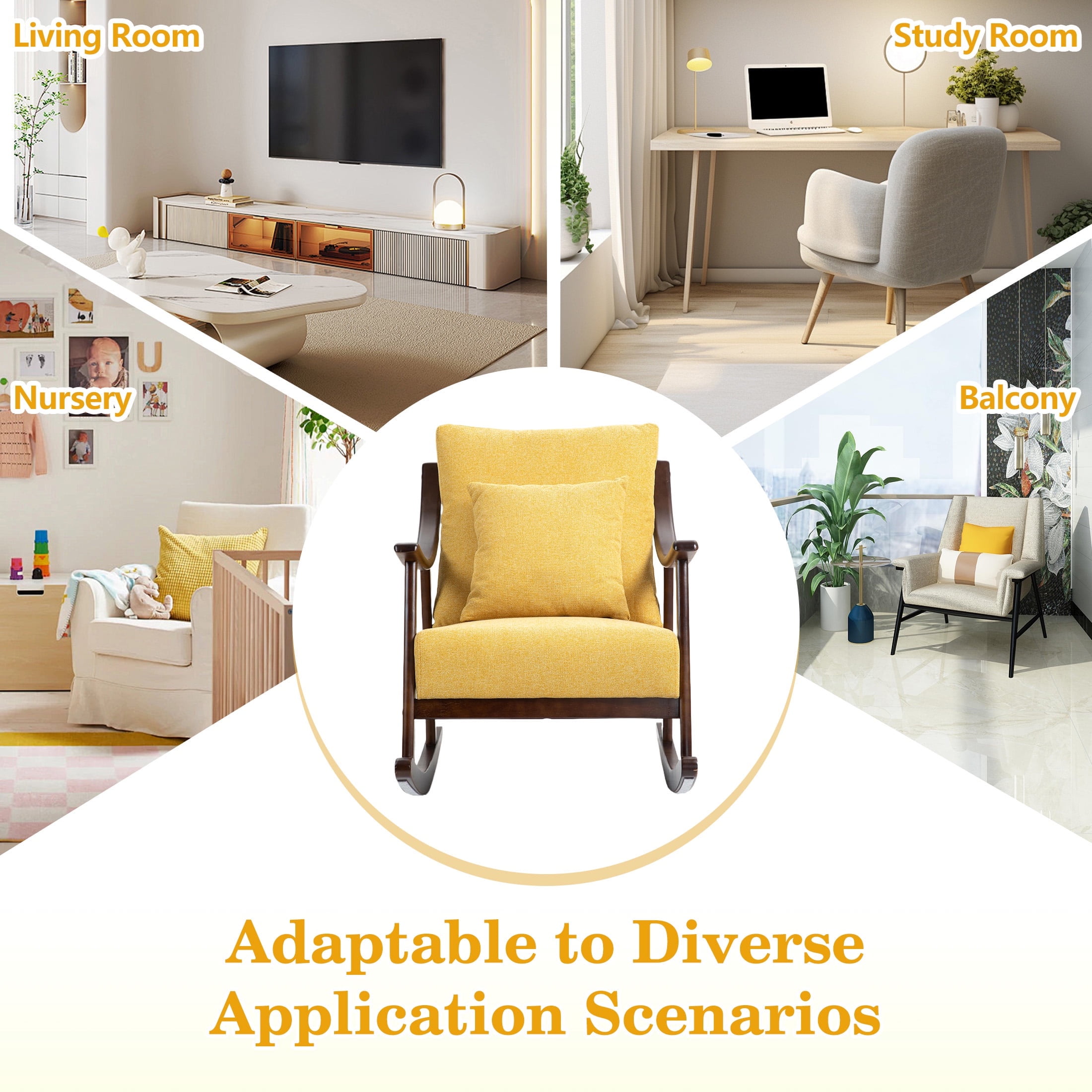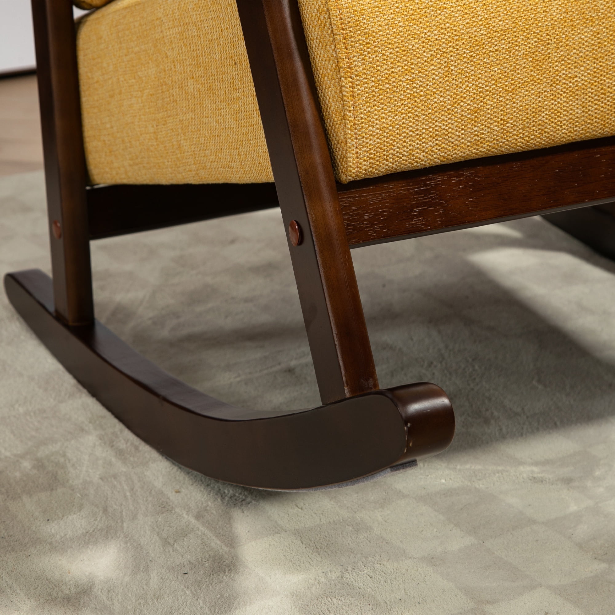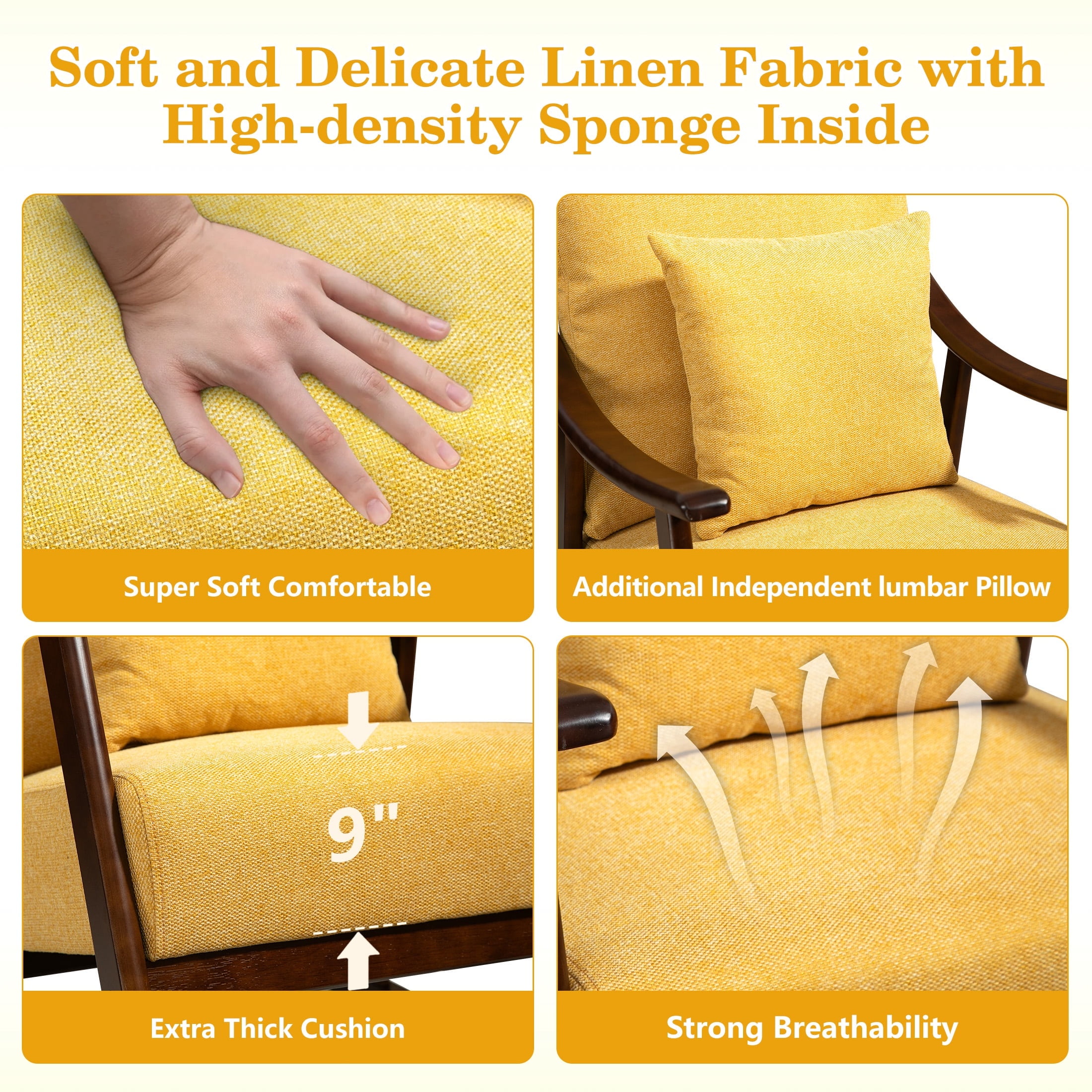 PORKISS Modern Rocking Chair with Padded Lumbar Pillow, Mid-Century Accent Chairs with Solid Wood Frame for Living Room Bedroom Playroom. This beautifully crafted accent chair introduces timeless elegance and ultimate relaxation into your home. Designed to provide comfort and style, this chair seamlessly blends medieval charm with modern minimalist design, making it the perfect addition to any living space. Specifications: Material: Solid Wood Frame, Linen Fabric, High Elasticity and High-density Sponge Filling Fabric: Linen Load Capacity: 300 lbs Color: Yellow Dimensions: (26.0 x 23.0 x 33.5)” (L x W x H) Weight: 23.3lbs / 10.57kg Package Includes: 1 x Rocking Chair 1 x Lumbar Pillow