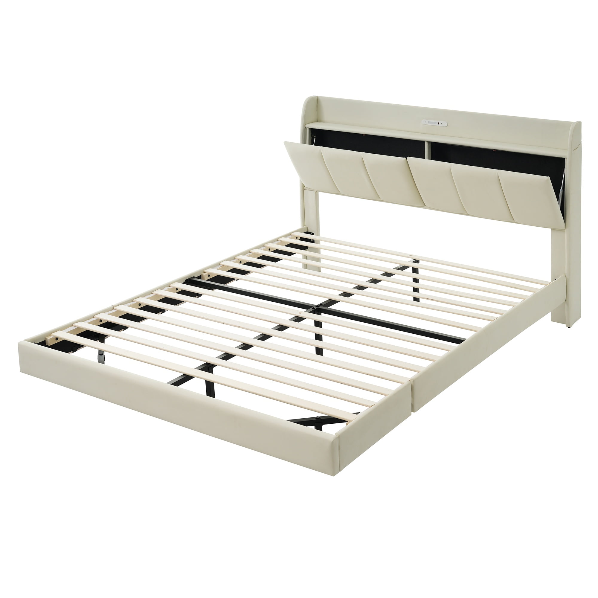 Unique Floating Design – Experience the dreamlike sensation of sleeping on air with our unique hidden bed foot design. This modern feature, combined with LED lights, creates a stunning visual effect, making your bed appear as if it’s floating above the ground. Practical and Beautiful Construction – Crafted from MDF and Plywood, this plaform bed frame queen is both sturdy and durable. The storage upholstered headboard adds a touch of luxury with its soft, comfortable surface, seamlessly blending with any home decor for a perfect bedroom centerpiece. Touch Sensor Nightlight – Navigate your bedroom with ease using the touch sensor nightlight integrated into the headboard. This convenient feature provides subtle illumination, ensuring you can move around without disturbing your partner during nighttime. Versatile Headboard with USB Ports – Stay connected with the versatile headboard that includes 2 USB ports for charging your devices. Additionally, the LED lights can be controlled via remote, and small pockets on both sides offer handy storage for phones, books, and other essentials. Ample Dimensions and Capacity – Designed to fit a queen-size mattress, this bed frame for adults measures 88.2 x 62.2 x 43.7 inches and supports up to 660 lbs. The storage shelf within the headboard holds up to 22 lbs, providing ample space for your bedding and accessories.