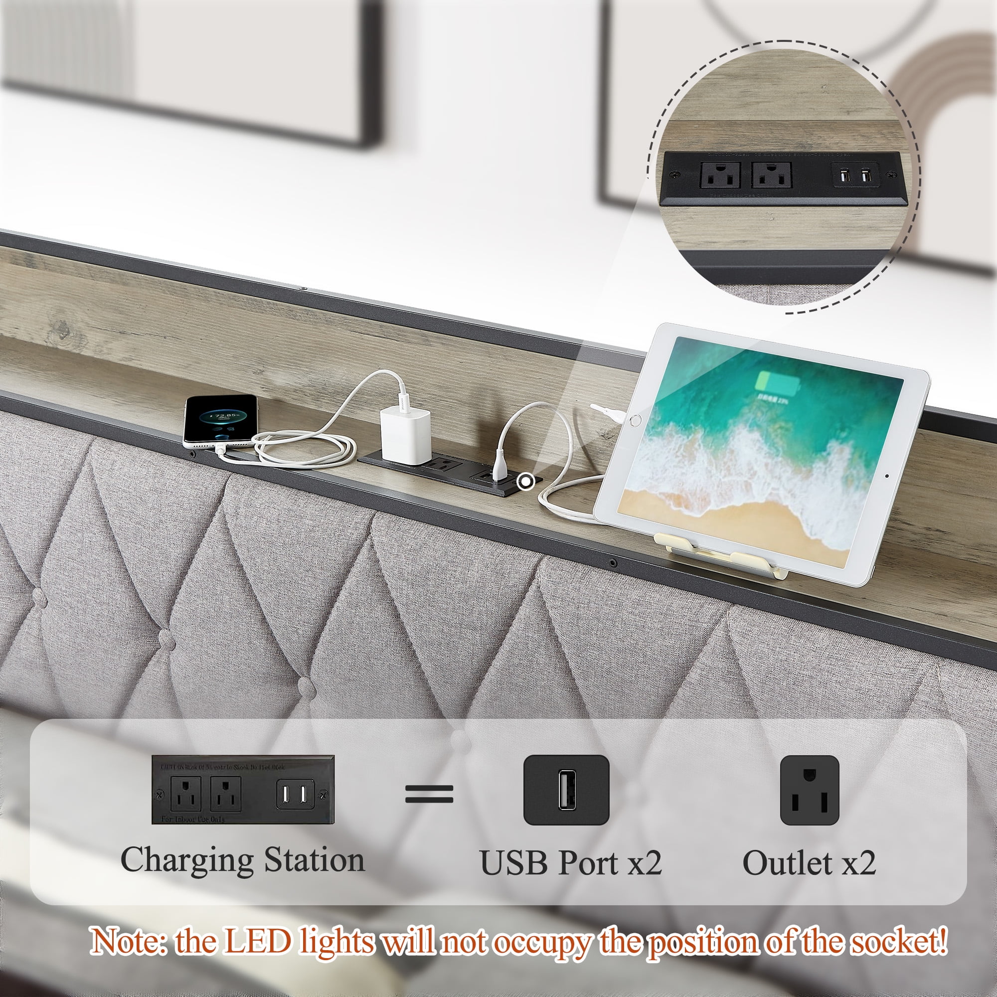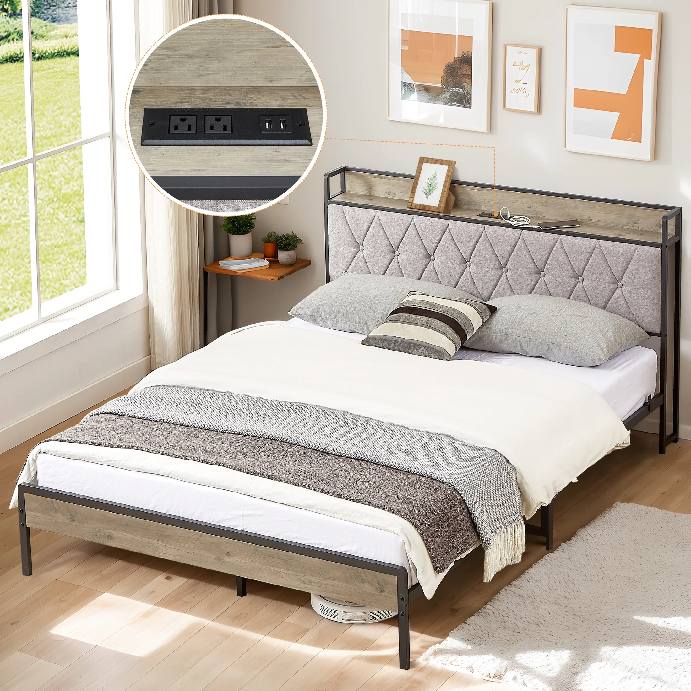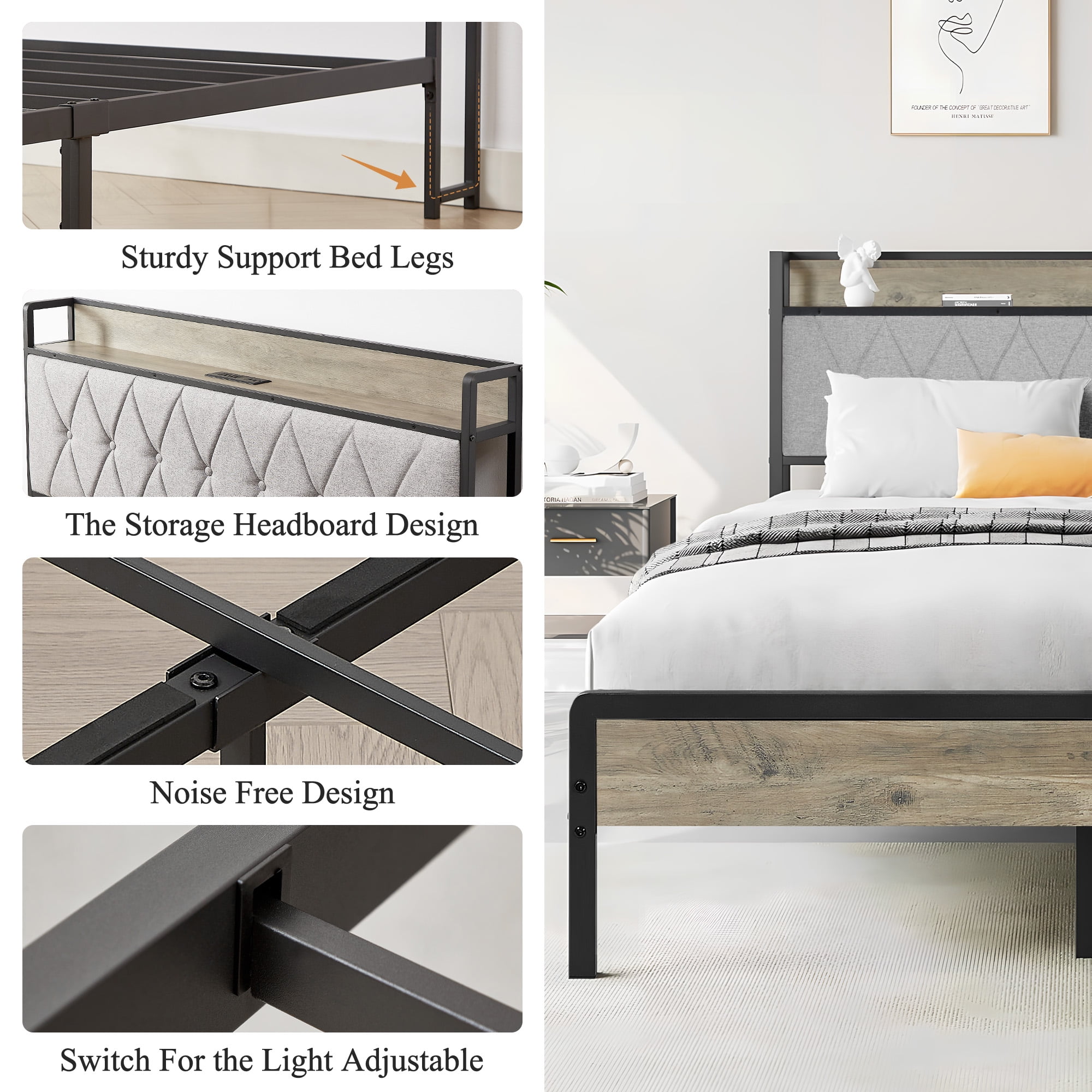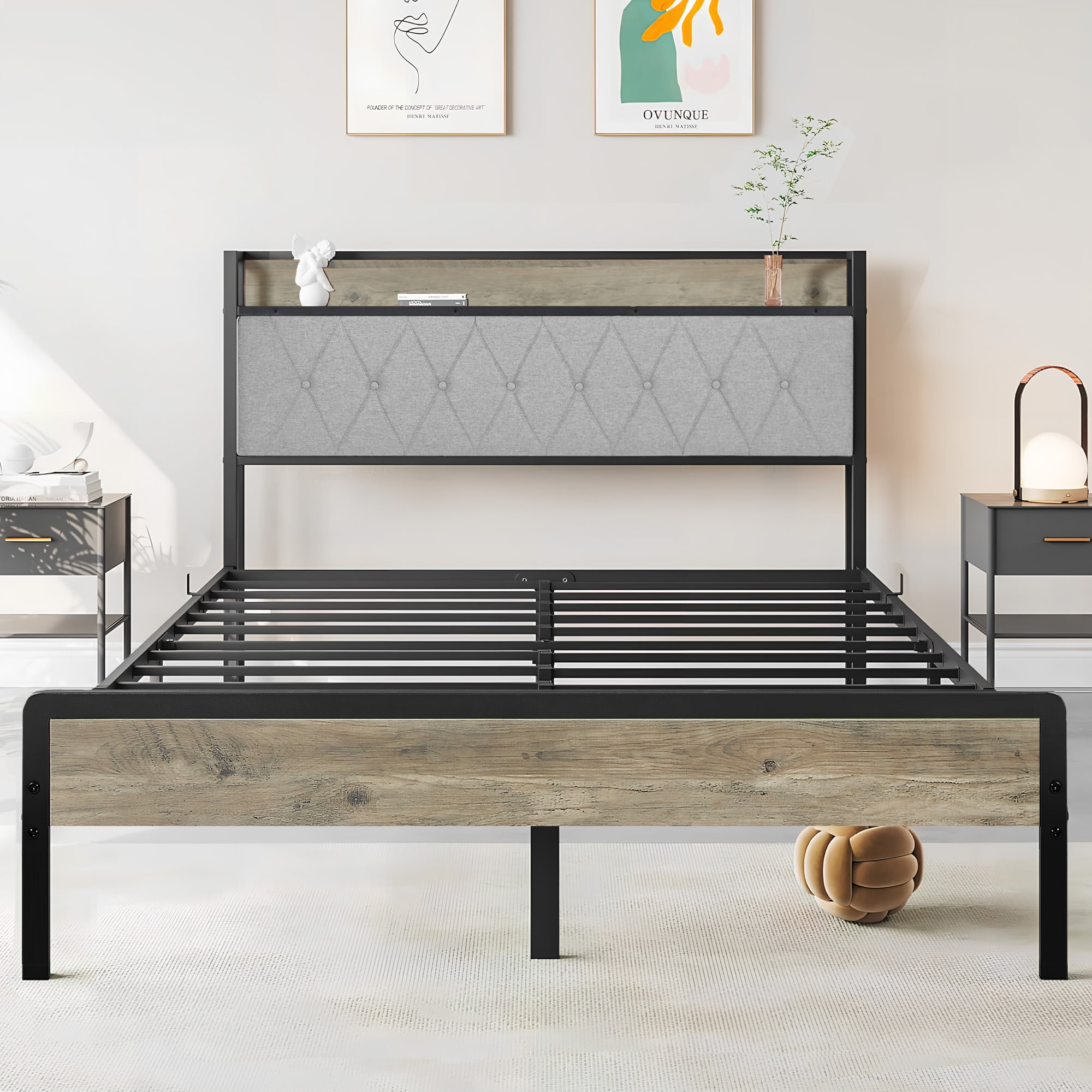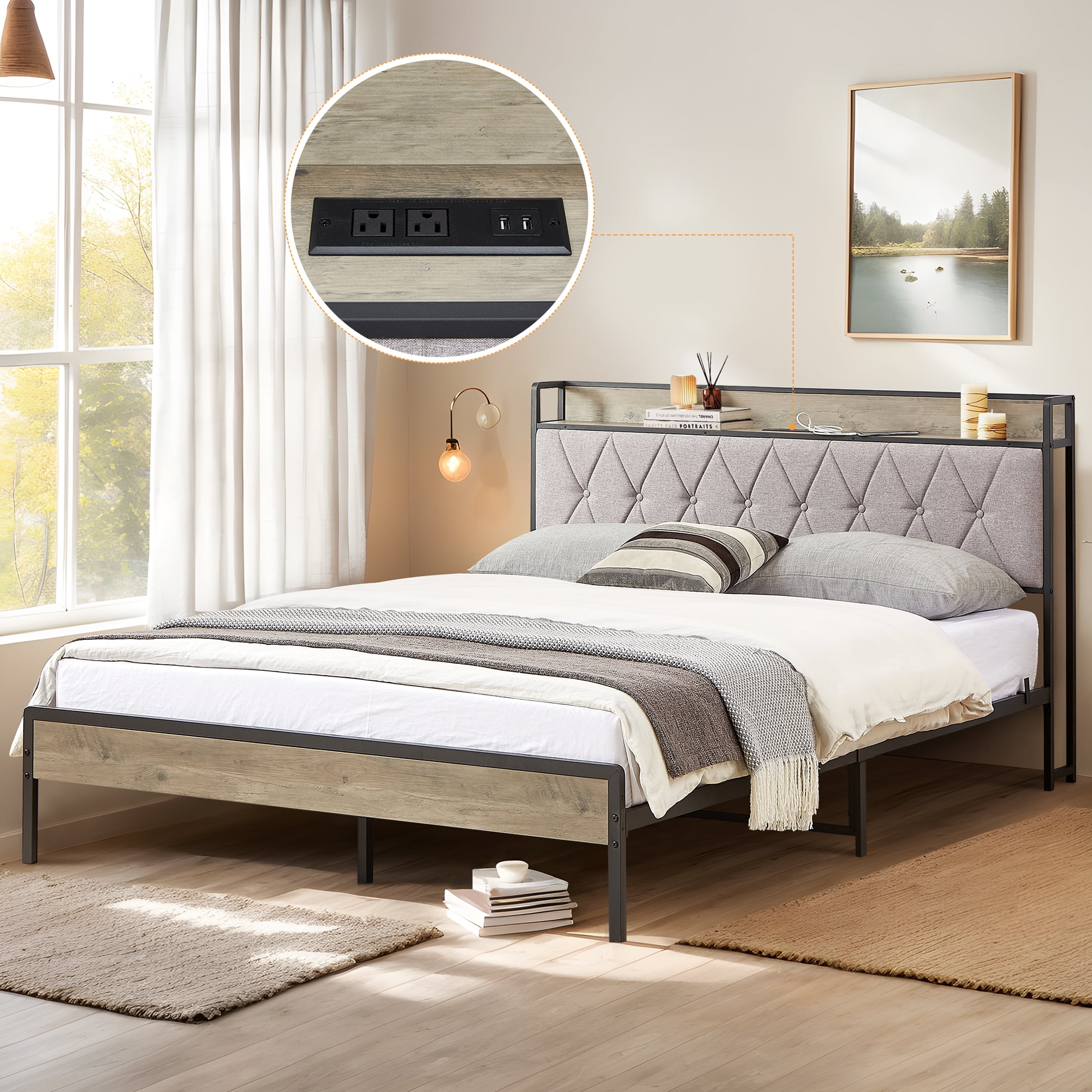 PORKISS Queen Size Bed Frame with Storage Headboard, Metal Bed Frame with Plug Outlets, USB, Gray