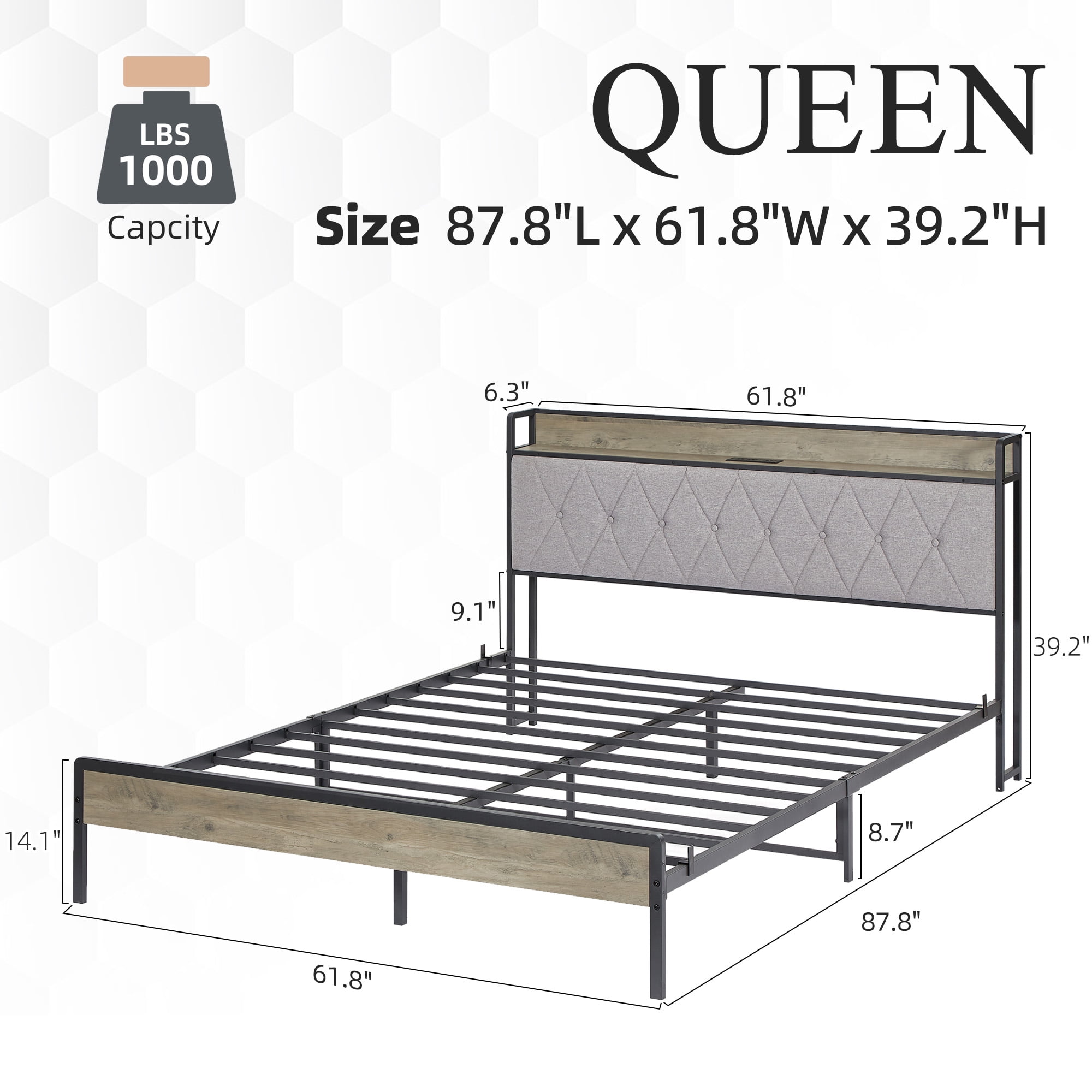 PORKISS metal queen platform storage bed is an elegant bed frame that pairs perfectly with a variety of home interiors. Built-in 2 Standard Plug Outlets & 2 USB Ports, so you can always charge your electronics. The vintage look of the bed frame also adds an artistic temperament and character to your bedroom. Solid fabric upholstered headboard and metal construction slats design give strong support of stability and durability, and you can use it for a long time. Each piece of design bears your comfort in mind. The platform bed frame support system and stylish headboard are an all-in-one solution for incredible mattress support, there is no need to purchase each piece separately. No box spring is needed. (Mattress not included) Specifications: Product Type: Queen Bed with charging station Color: Grey+Black/Rustic Brown+Black Material: Particleboard, Steel Size: 87.8″L x61.8″W x 39.2″H Max. Static Load Capacity:1000 LBS Charging Power: 120V / 12A Number of USB ports: 2 Assembly Required: about 40 min Packages number: 1 Package Includes: 1 x Bed Frame 1 x Assembly Kit 1 x Instruction
