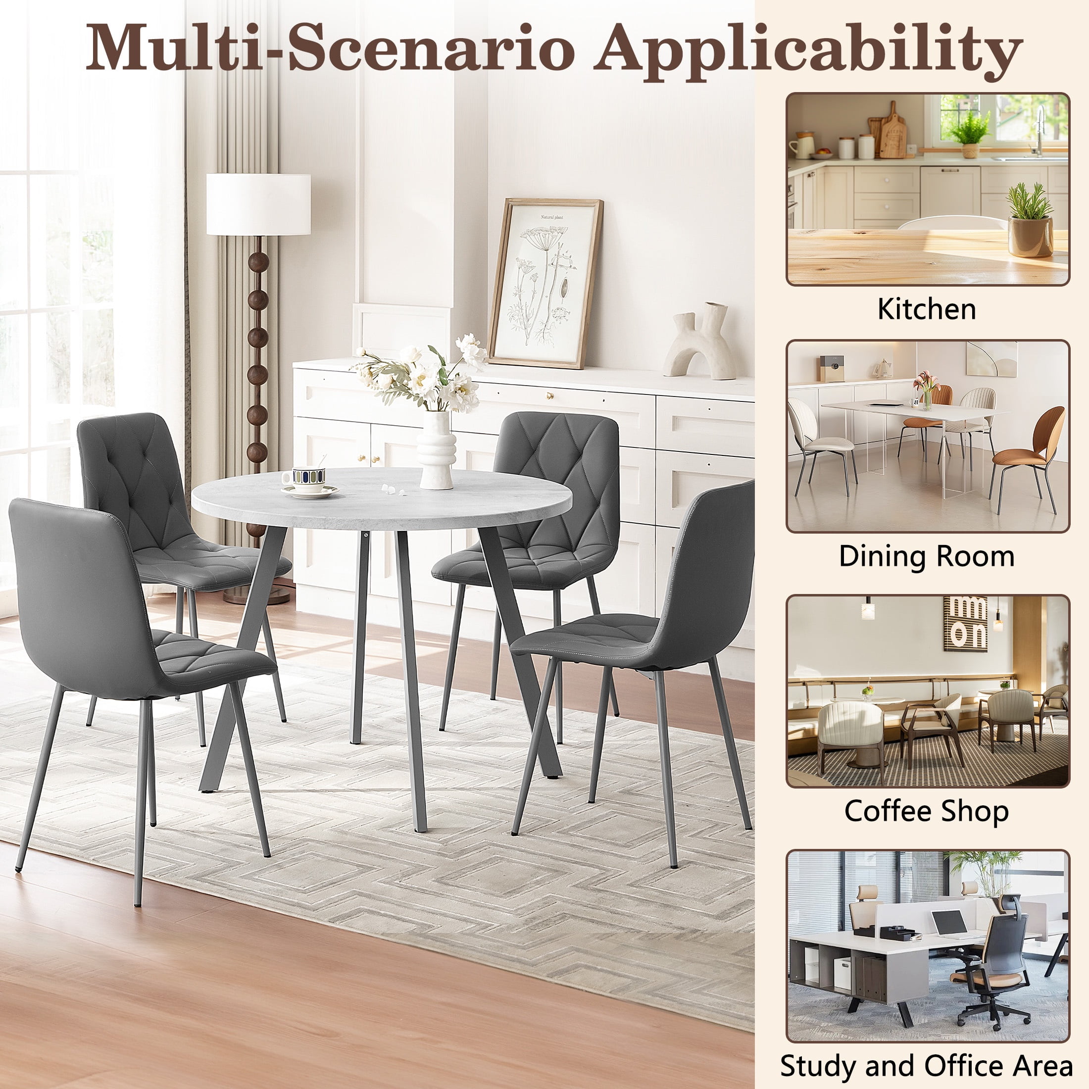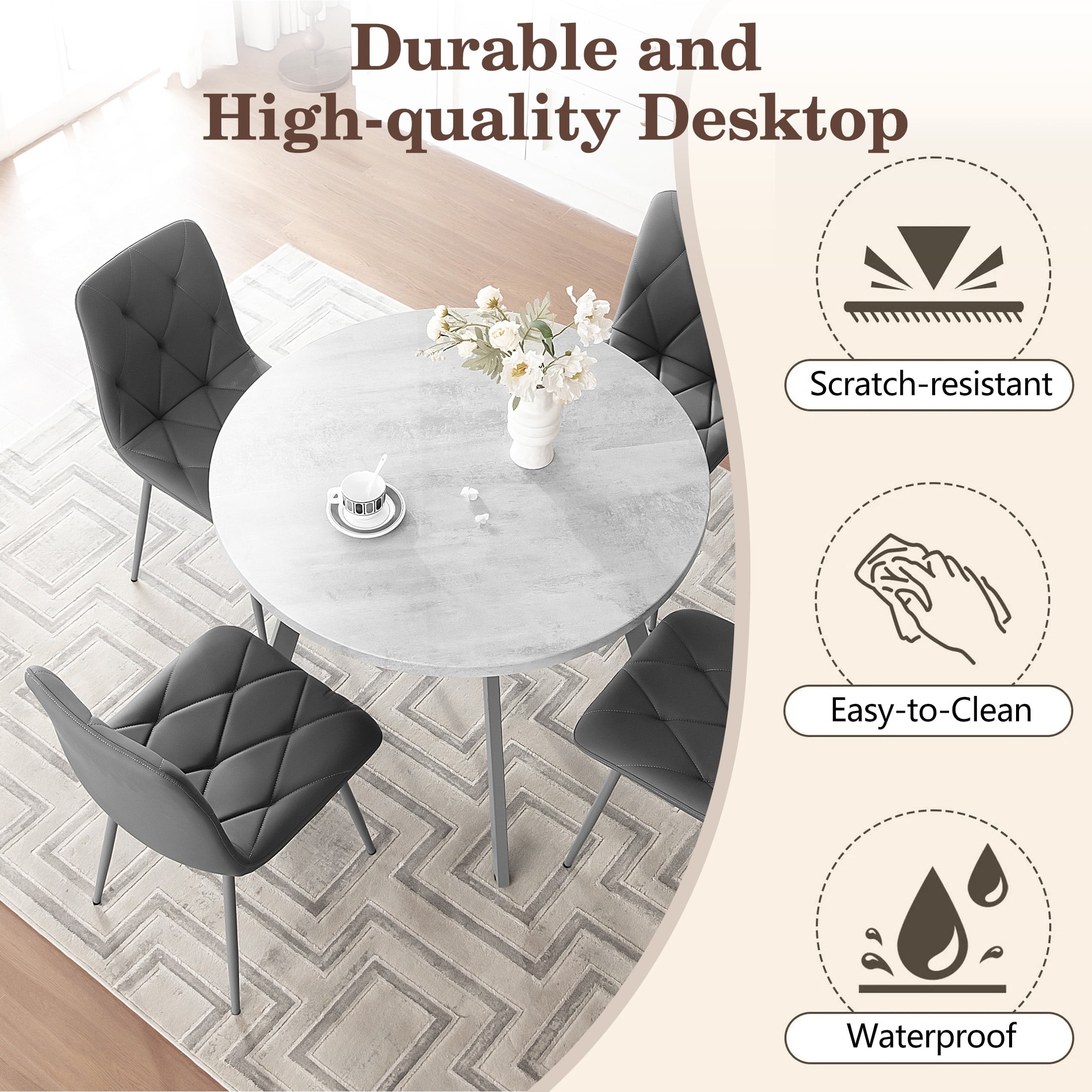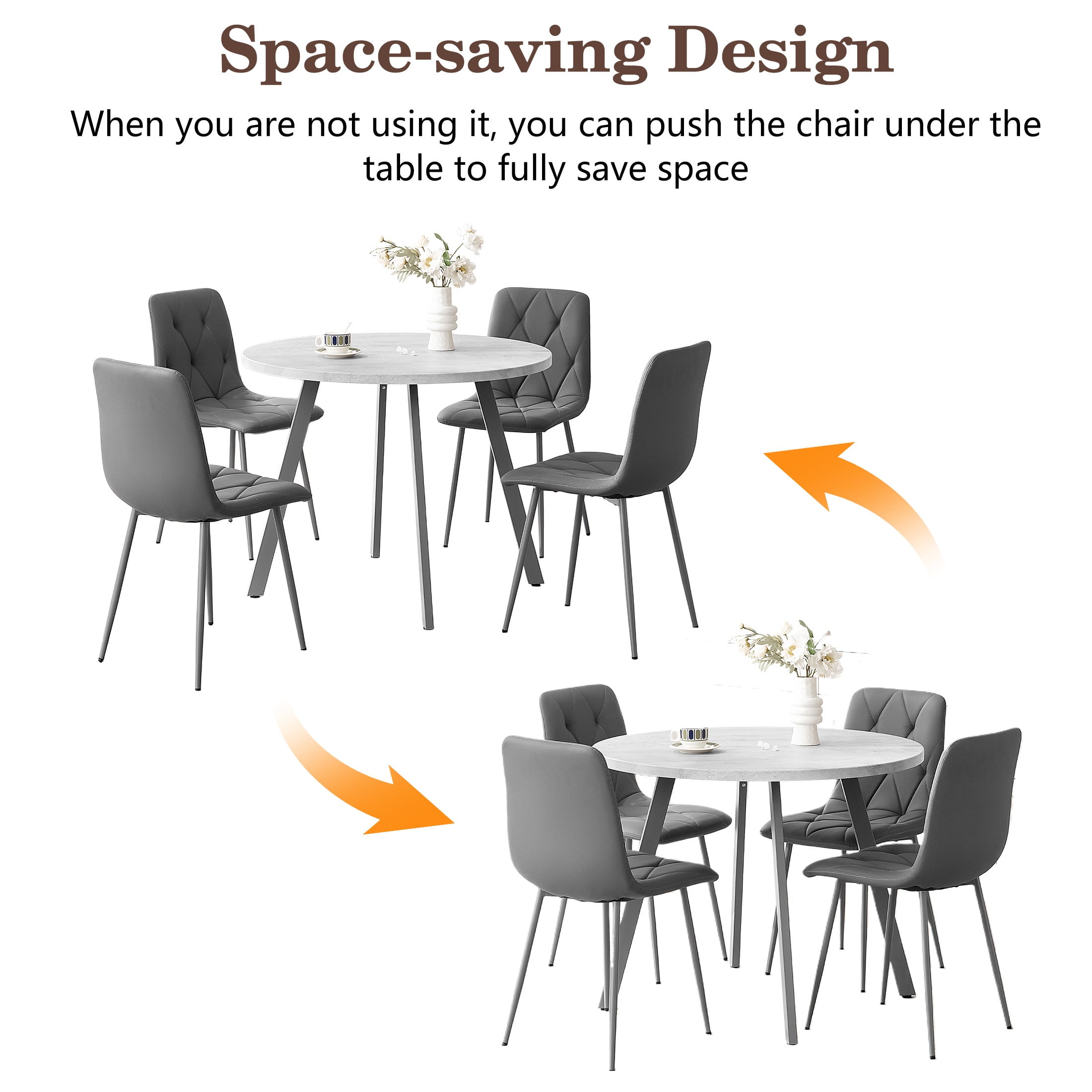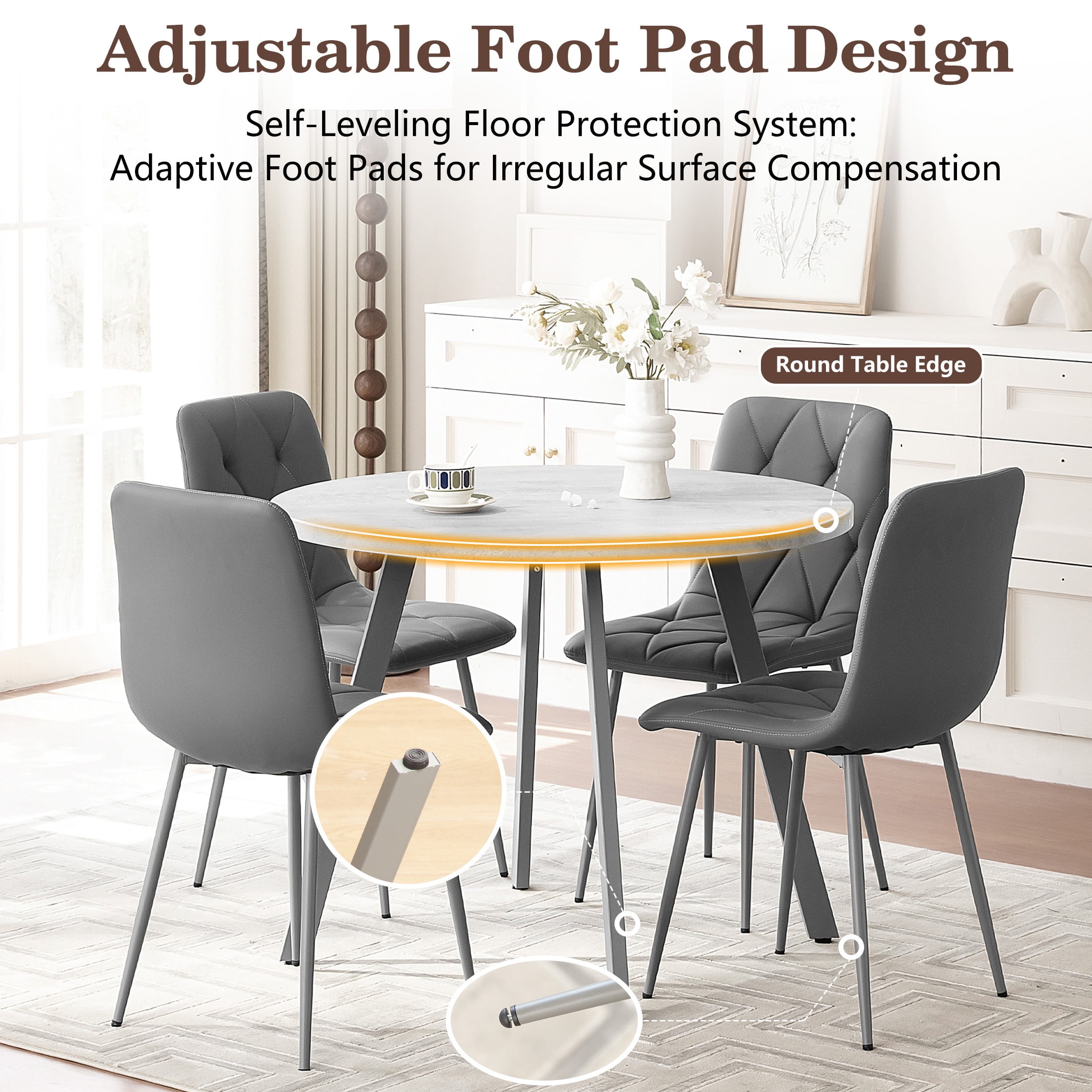 PORKISS Round Dining Table Set for 4, Round Kitchen Table and Chairs Set for 4, Modern Dining Room Table Set with 4 Faux Leather Chairs, Round Dinner Table for Small Space, Gray