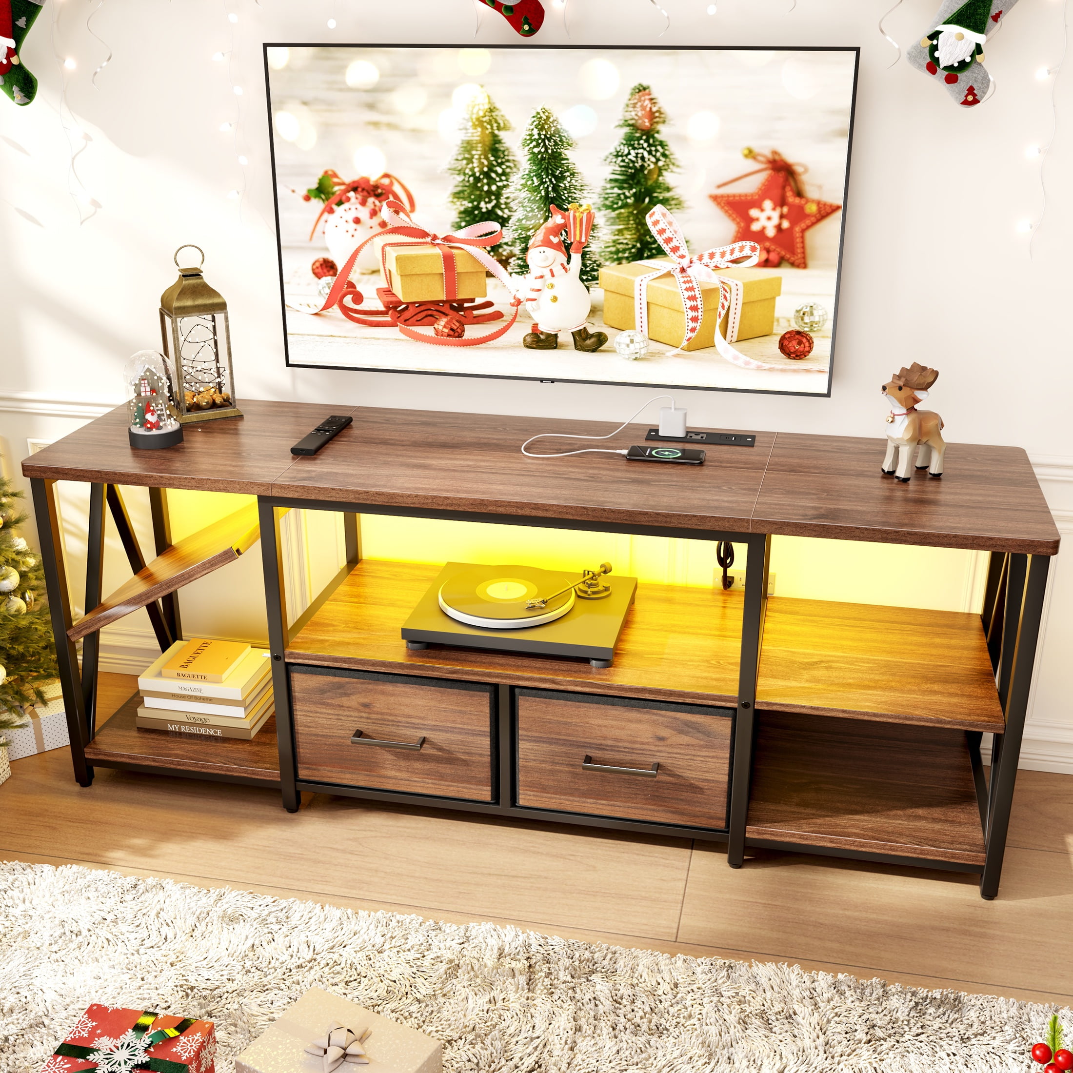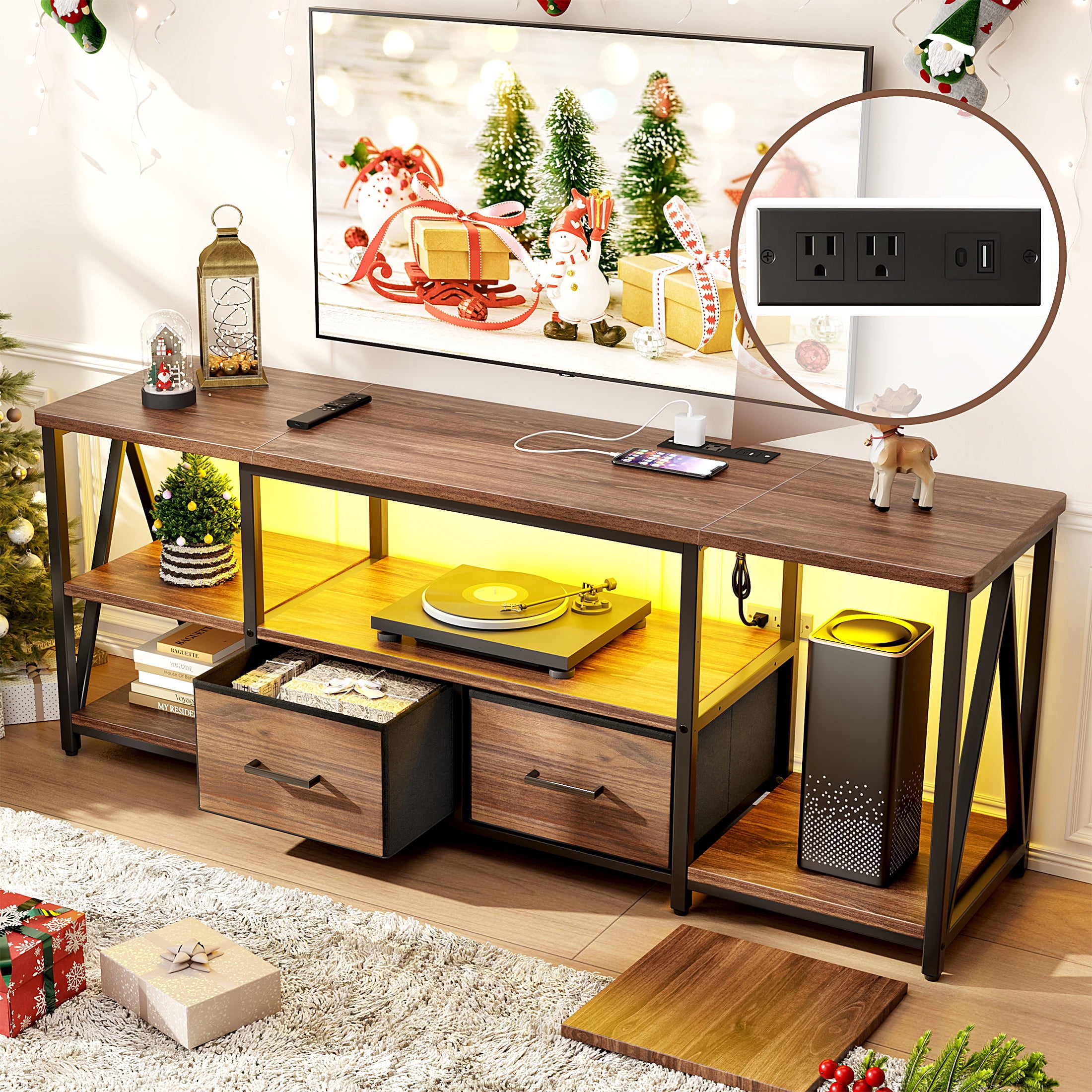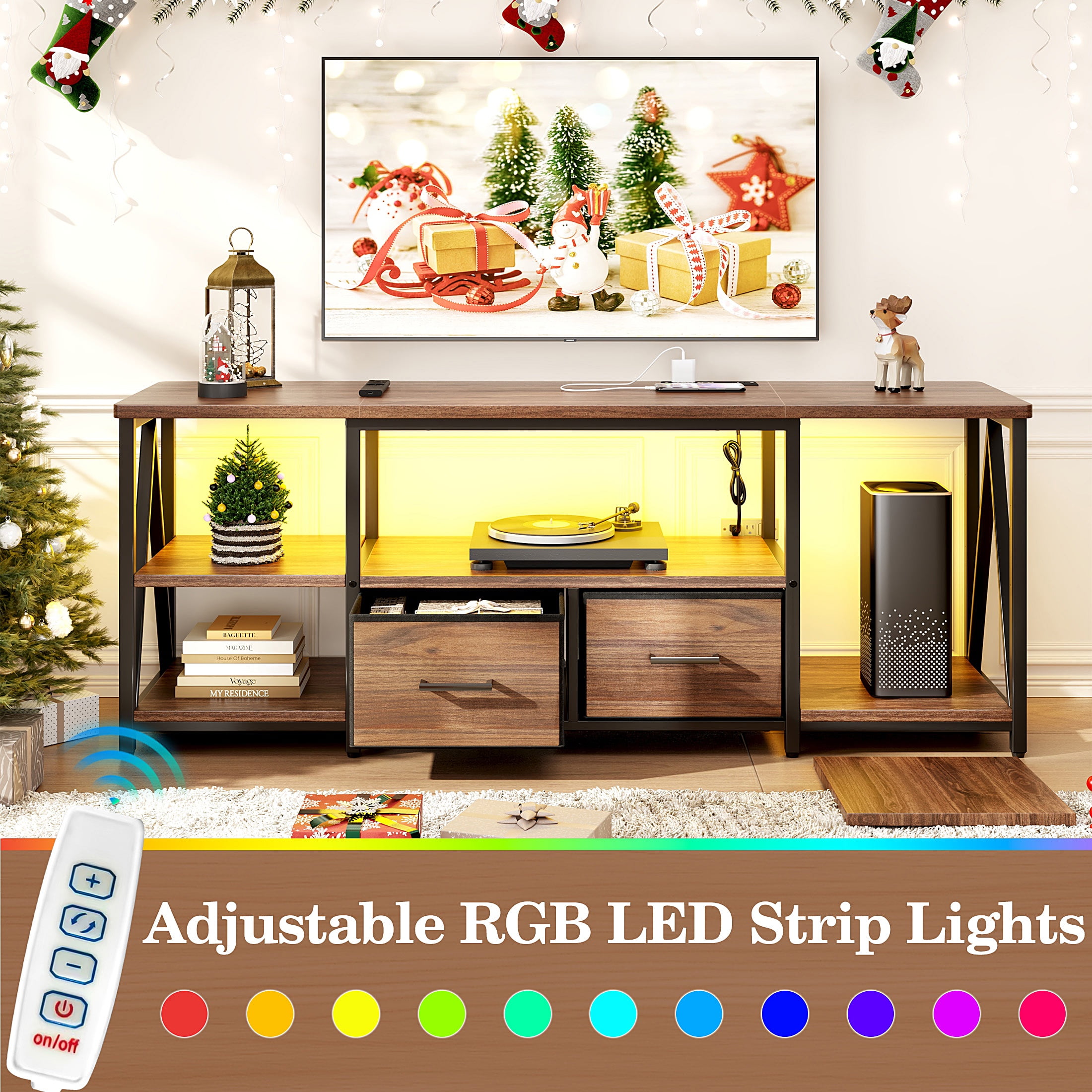 ✨ Dynamic LED Mood Lighting Create cinema-like ambiance with LED TV stands! Adjust cool or warm tones and brightness levels to set the perfect mood for movie nights or gaming in low-light environments. ???? All-in-One Charging Station Never hunt for outlets again! Features TV stands with electrical outlets including: 2 AC outlets; 1 USB-C port; 1 USB port Power consoles, phones, and devices right from your entertainment center. ???? Customizable Storage Space Two removable shelves adapt to your gear. Showcase soundbars, game consoles, or decor – reconfigure storage in seconds! ????️ Industrial-Strength Build Engineered with reinforced V-structure and thickened wood panels, this heavy-duty TV stand supports 160 lbs – easily securing large screens and AV equipment. ⏱️ 30-Minute Hassle-Free Assembly Includes numbered parts and step-by-step instructions. Build your modern TV stand faster than streaming a sitcom!