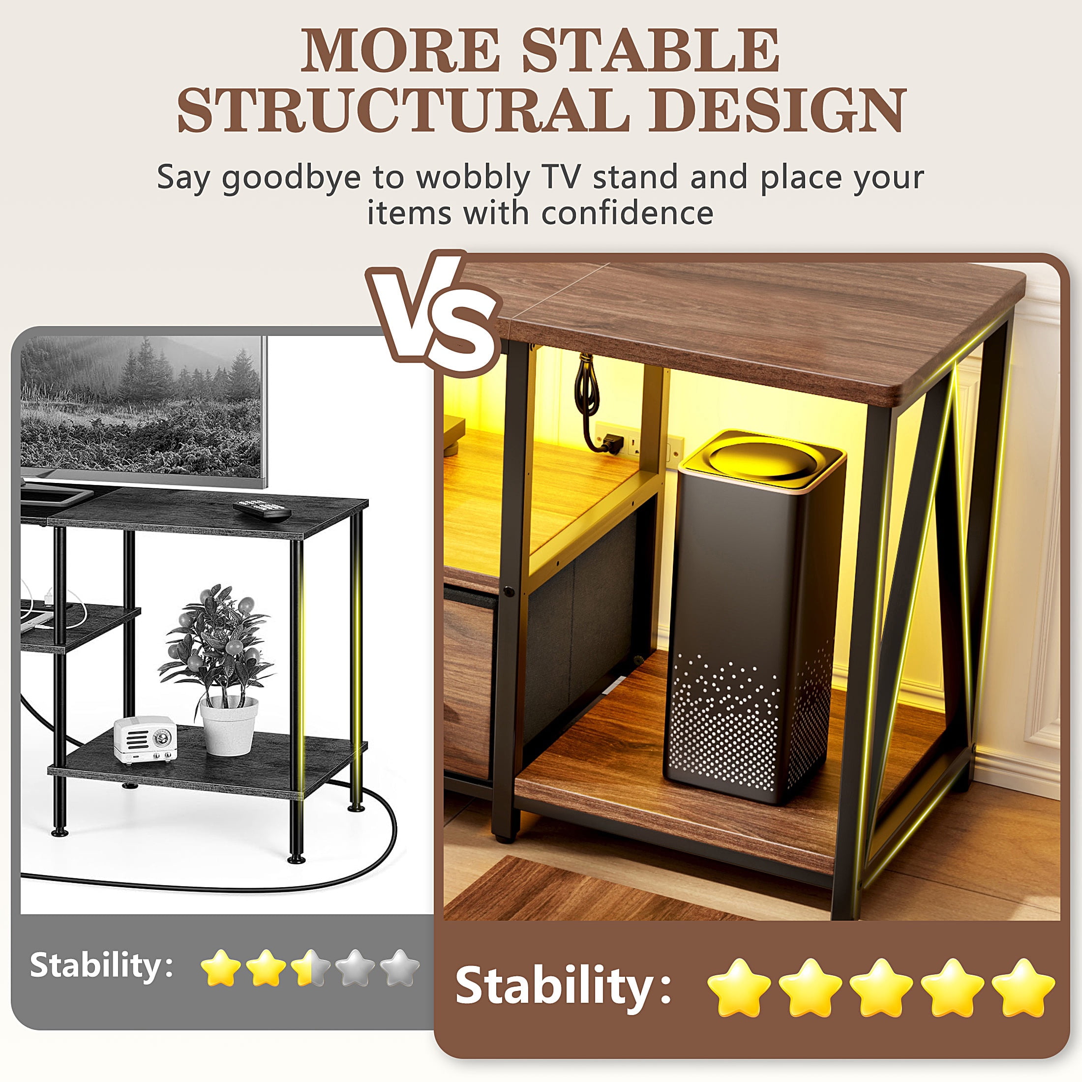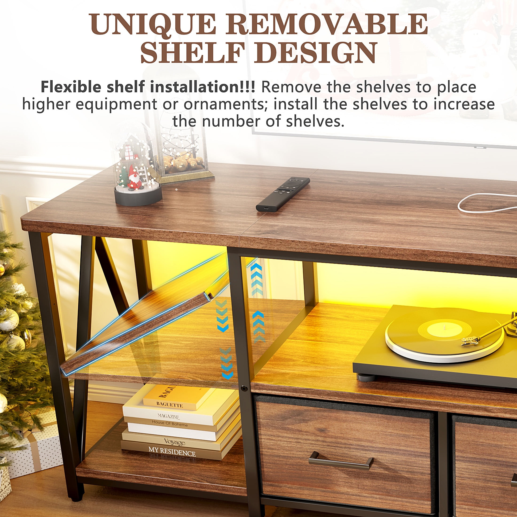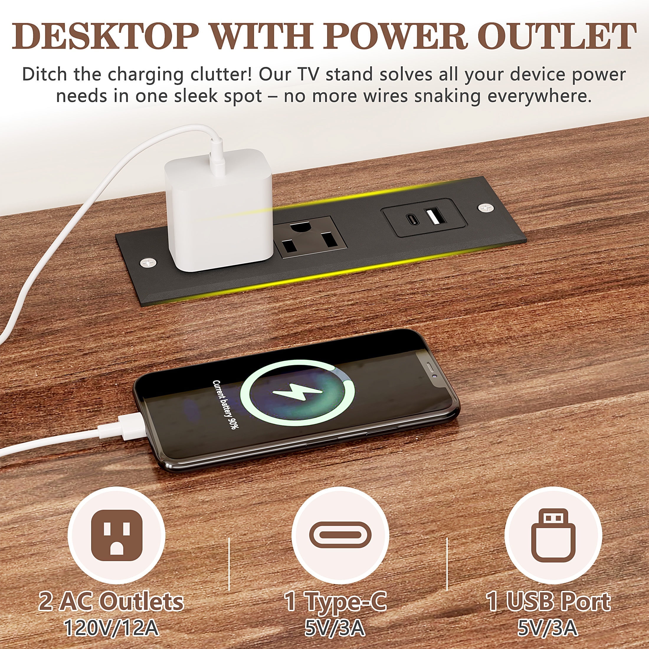 ✨ Dynamic LED Mood Lighting Create cinema-like ambiance with LED TV stands! Adjust cool or warm tones and brightness levels to set the perfect mood for movie nights or gaming in low-light environments. ???? All-in-One Charging Station Never hunt for outlets again! Features TV stands with electrical outlets including: 2 AC outlets; 1 USB-C port; 1 USB port Power consoles, phones, and devices right from your entertainment center. ???? Customizable Storage Space Two removable shelves adapt to your gear. Showcase soundbars, game consoles, or decor – reconfigure storage in seconds! ????️ Industrial-Strength Build Engineered with reinforced V-structure and thickened wood panels, this heavy-duty TV stand supports 160 lbs – easily securing large screens and AV equipment. ⏱️ 30-Minute Hassle-Free Assembly Includes numbered parts and step-by-step instructions. Build your modern TV stand faster than streaming a sitcom!