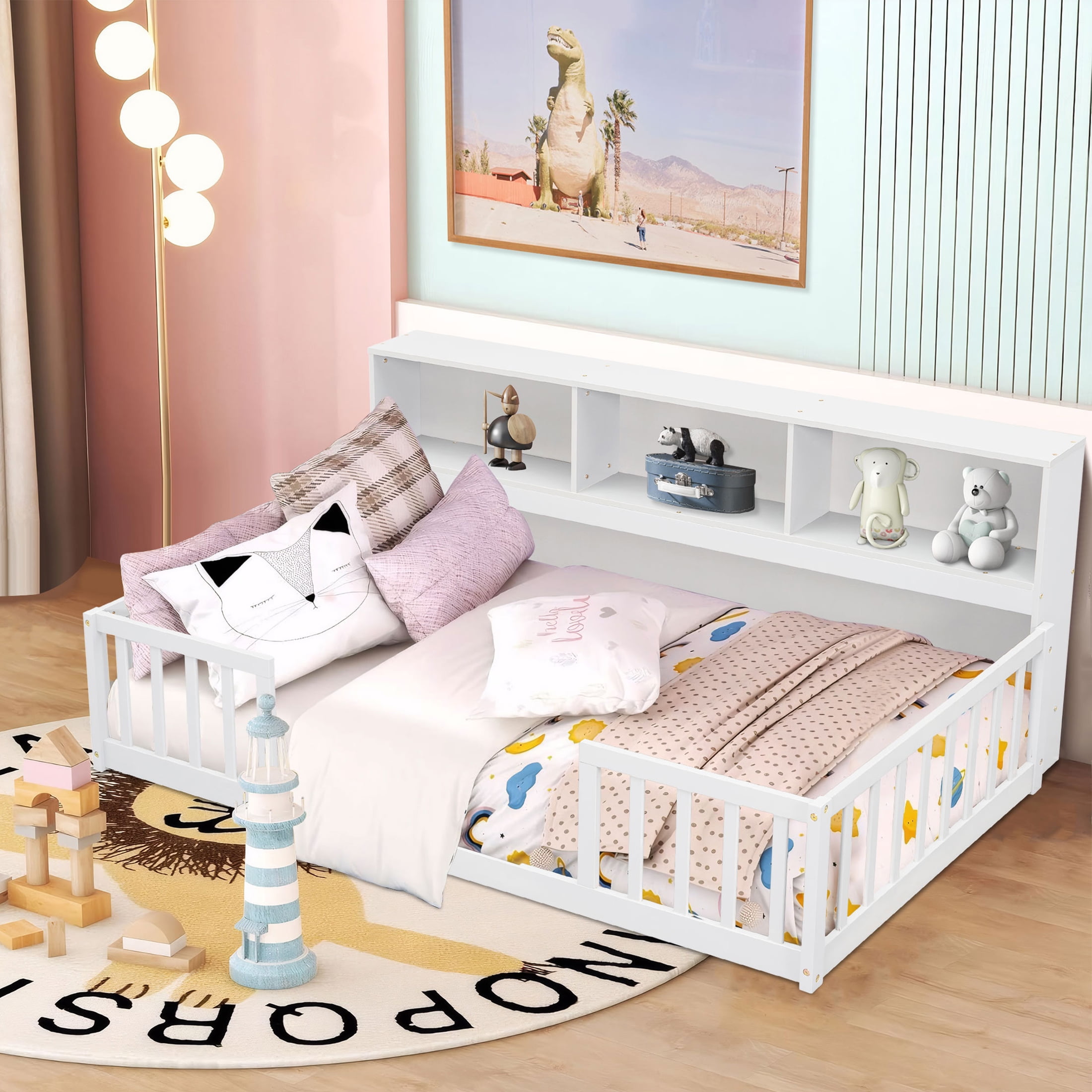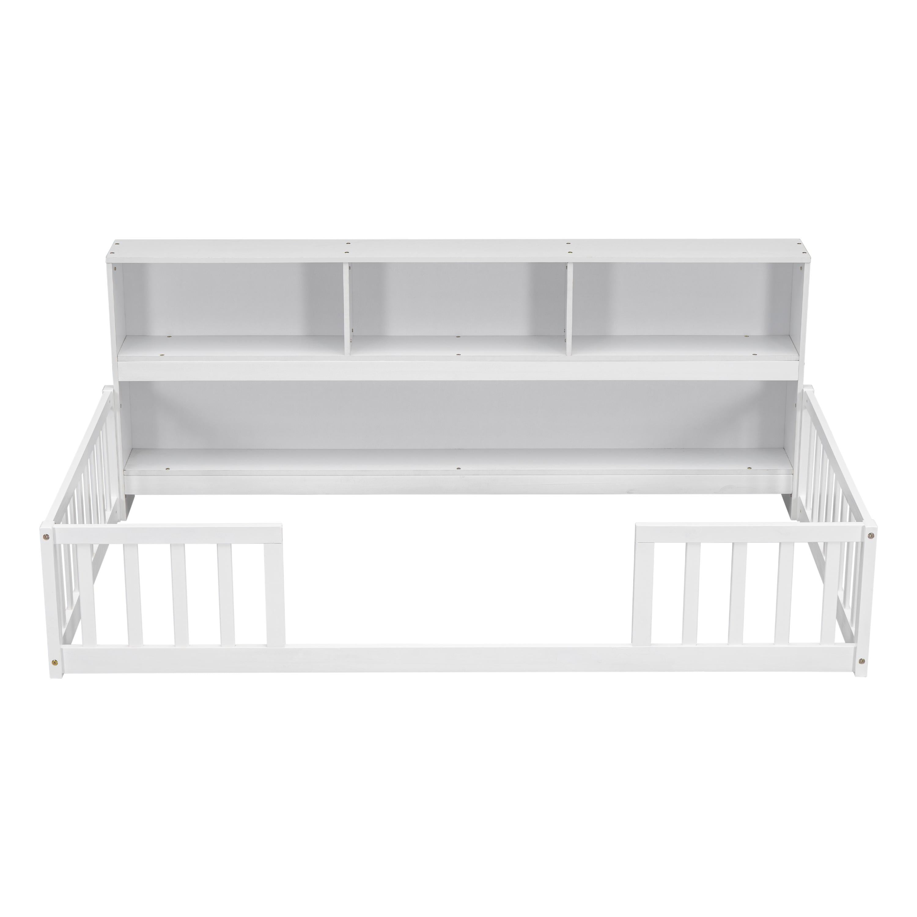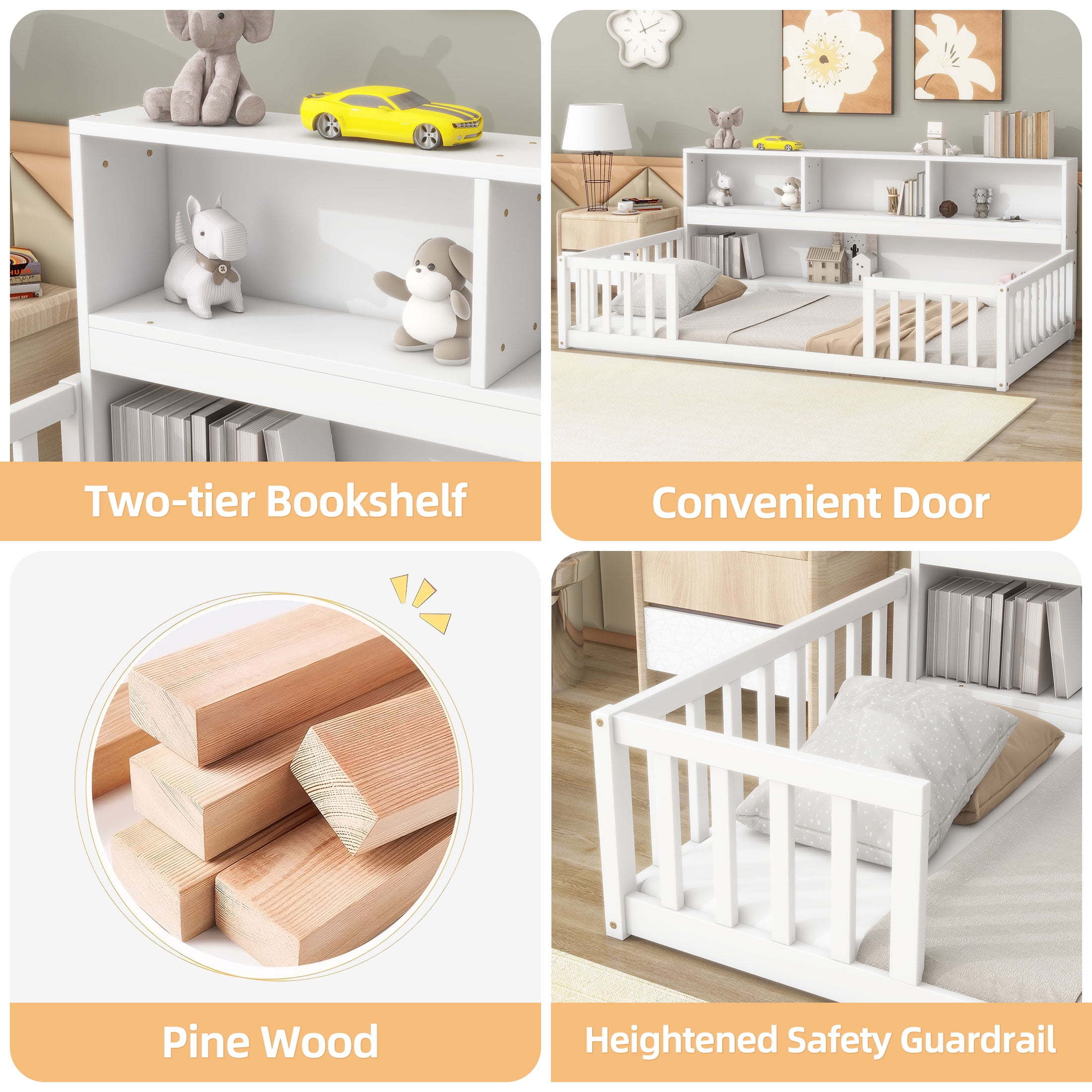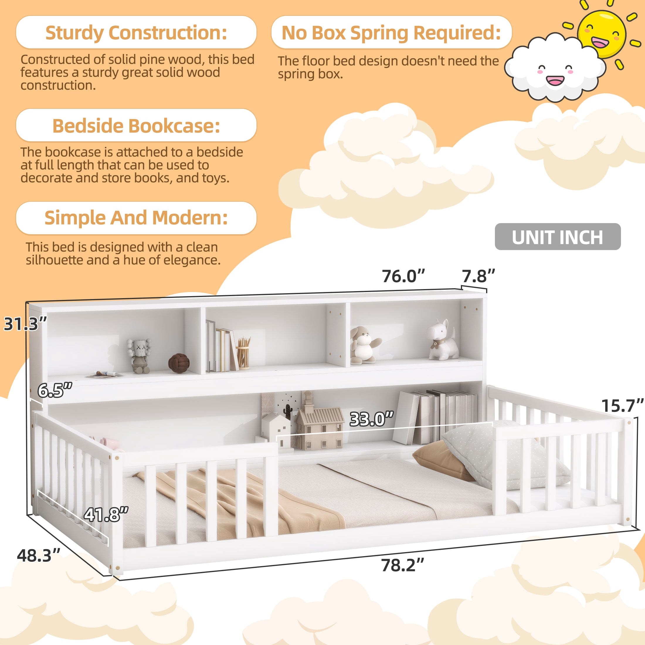 [Floor Bed with Bedside Bookcase] — The multifunctional function bookcase attached to the bedside in full length contains distinct compartments that can be used to decorate and store books, toys, lamps, and other accessories. This intelligible design saves the extra space and costs of the need for bedside cabinets, and it’s the perfect solution for a small living space- transforming a small chaotic space into a neat and fascinating bedroom. [Guardrails with an Opening] — The floor bed’s guardrails with an opening offer easy access to the bed platform, providing a comfortable and simple solution for getting in and out of bed, ideal for everyday convenience. It’s also beneficial to prevent sleepers from accidentally slipping out. [Quality and Safety Guaranteed] — This bed is crafted from quality pine wood and composite boards, providing lasting sturdiness and durability. The bed is constructed with a firmly secured frame, forging solid stability that ensures a relaxing bedtime experience and soothing nights. [Stylistic Elements] — The bed’s elegance is reflected in its sophisticated minimalistic design, suiting all interior design, enabling the bed to merge perfectly into any scenario. Moreover, there are a variety of classic colors that you can choose from, which you believe suit your bedroom the best. [Easy Assembly] — The bed is delivered in one individual package, a full set of hardware included, along with the installation manual to guide you through the process of assembly, and the bed will be swiftly assembled at ease. If you have any problems, Please feel free to contact our customer service. We will try our best to make you satisfied.