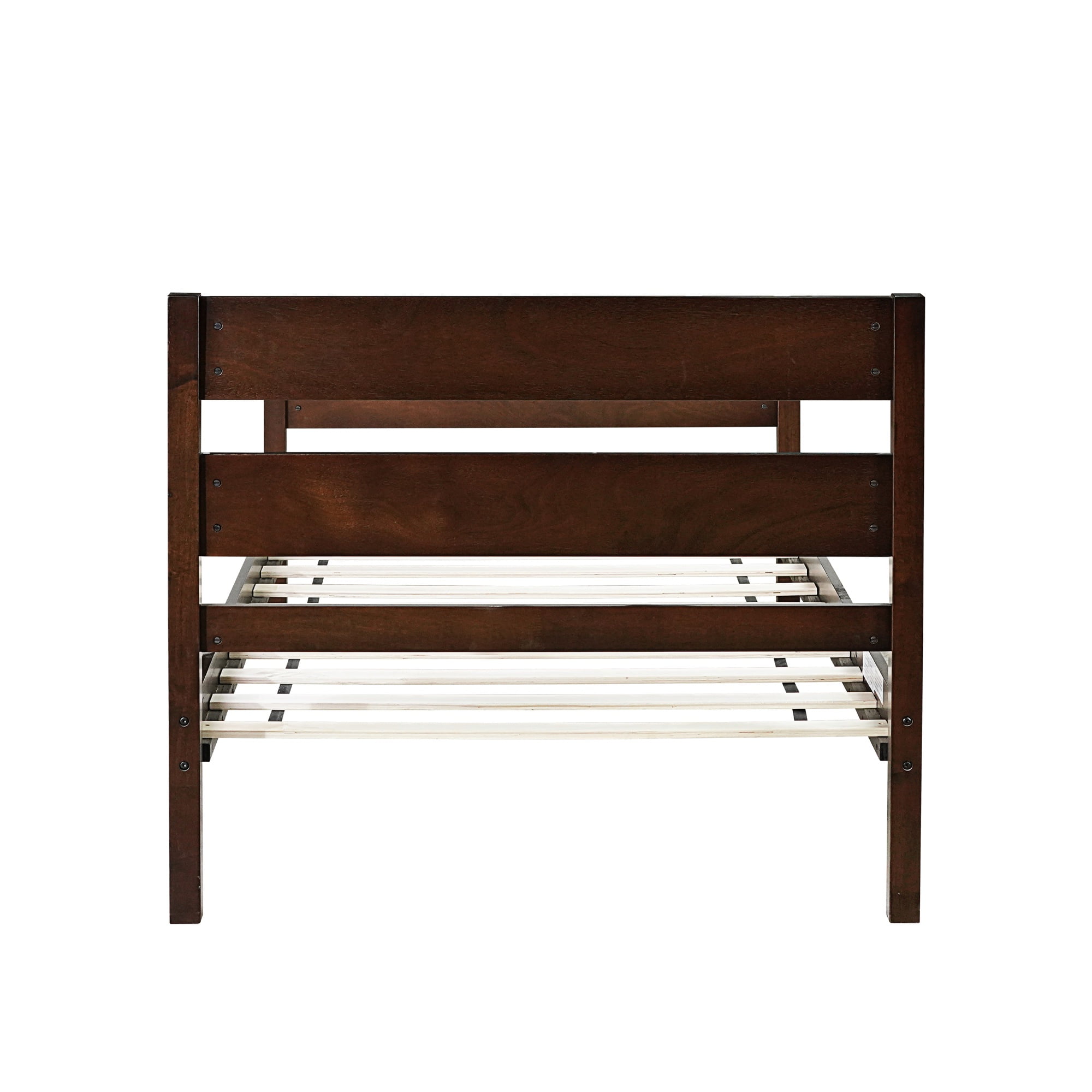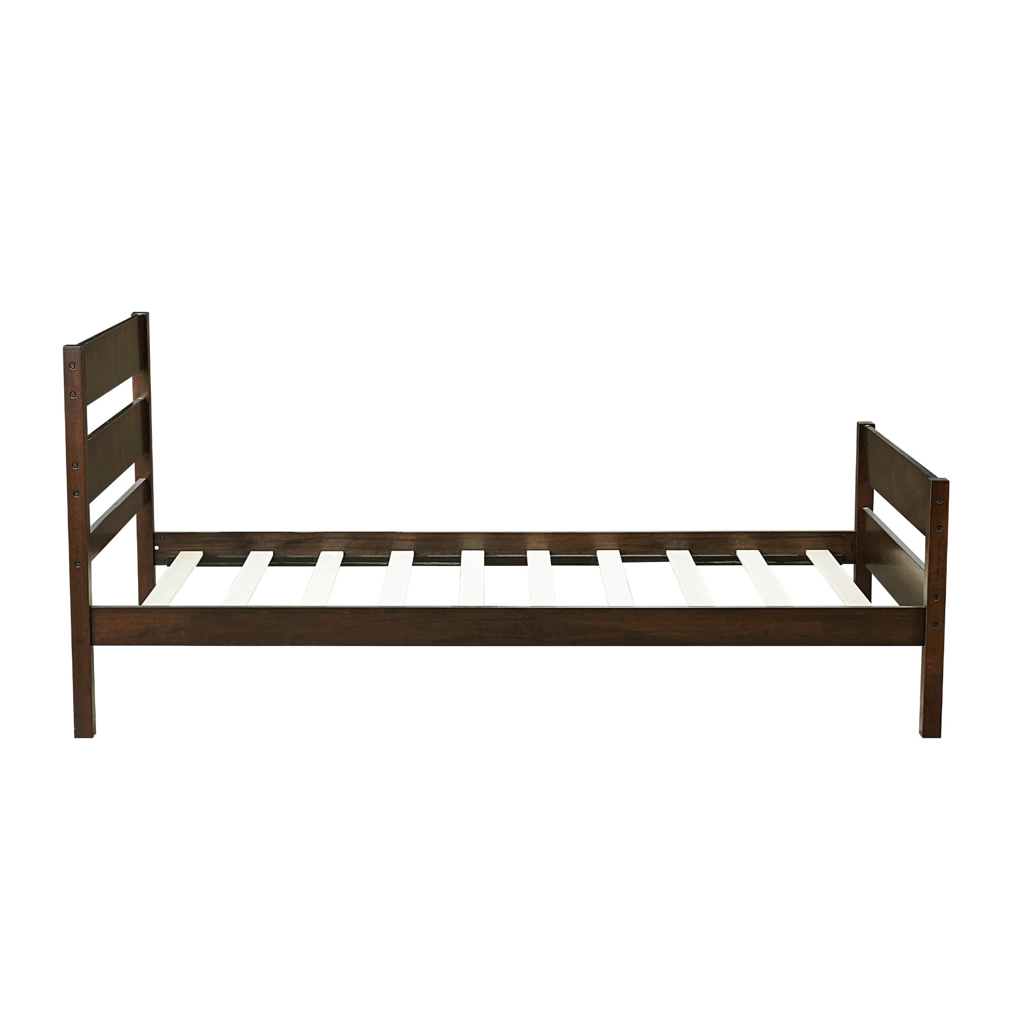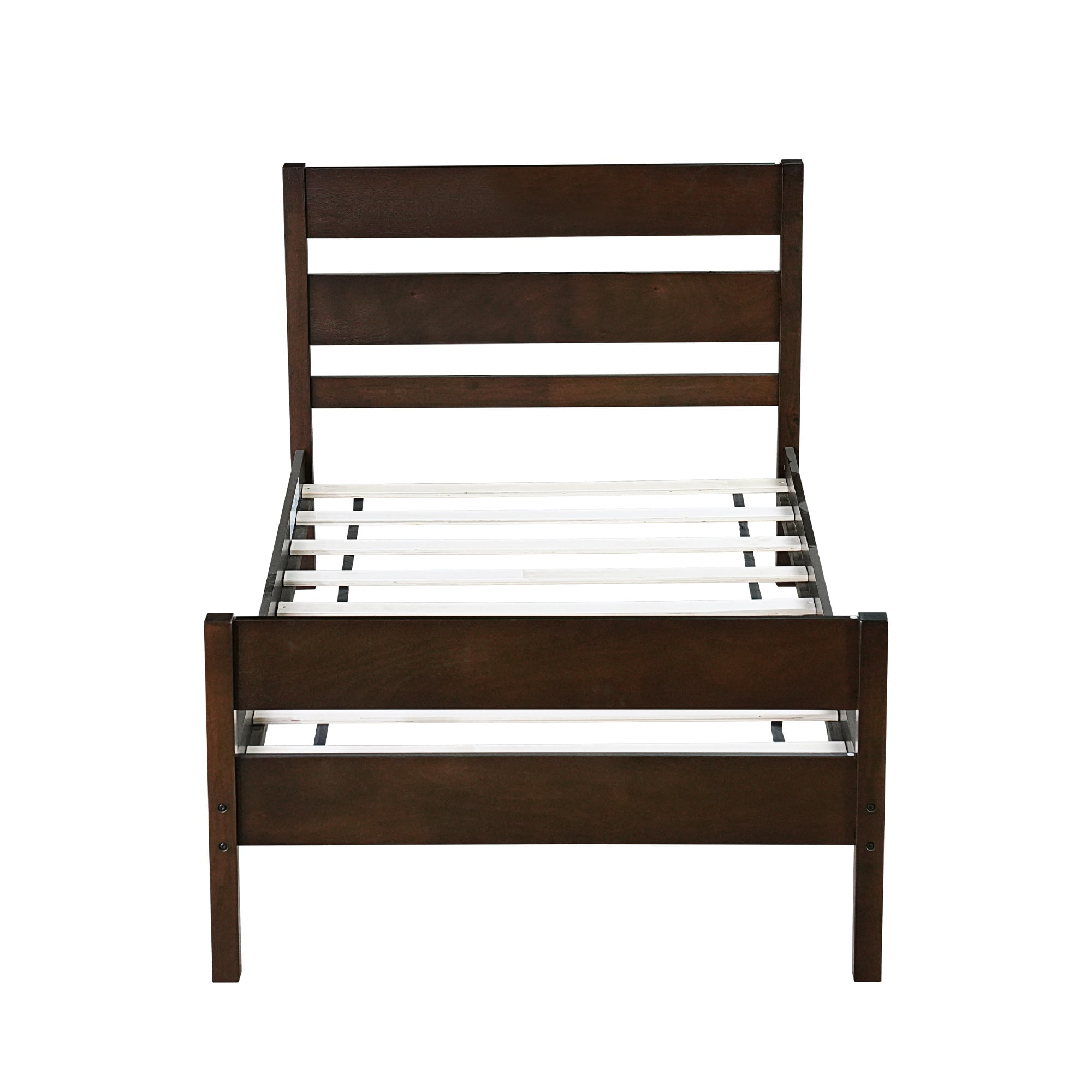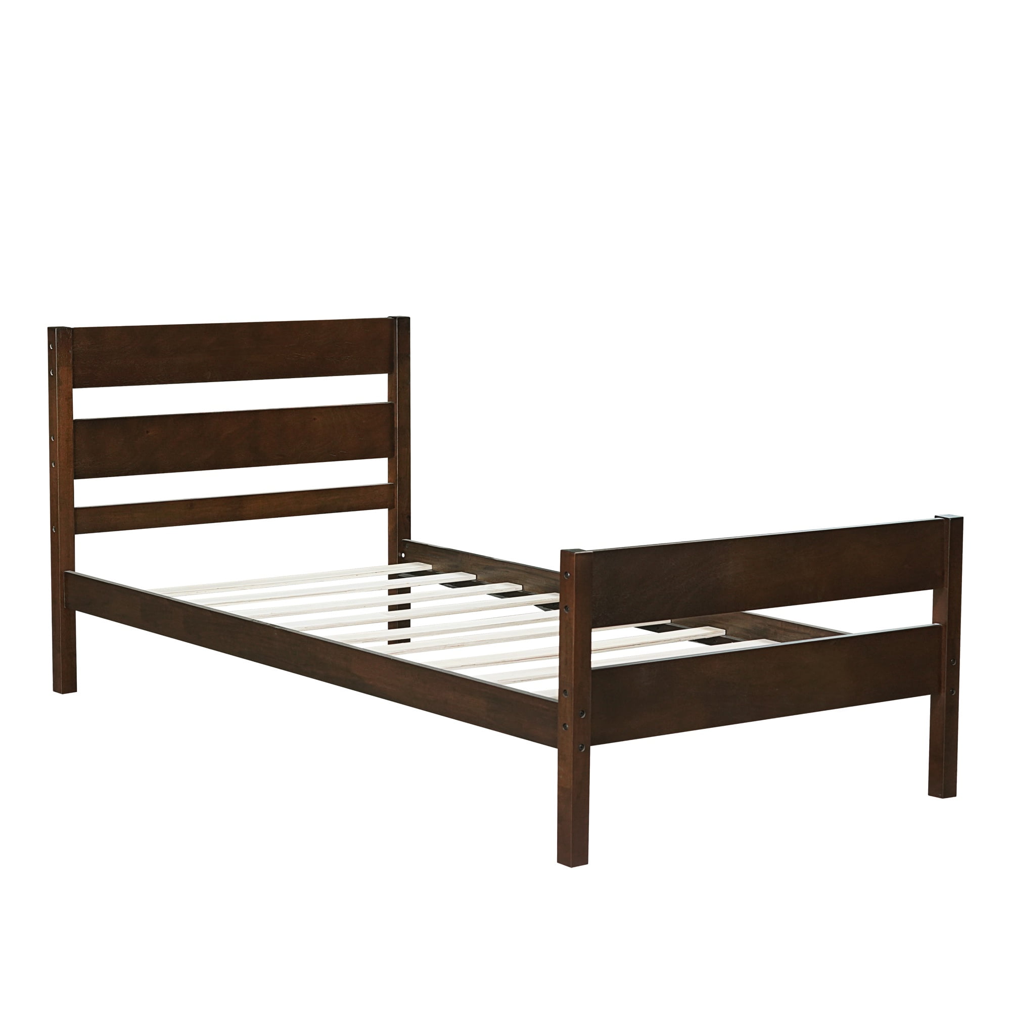 Twin Size Bed Frame – Sturdy, Spacious & Stylish PORKISS Twin Size Platform Bed, Wood Bed Frame with Headboard for Kids Teens. Brighten up your child’s bedroom with our charming wooden twin bed frame. Designed to blend durability with playful aesthetics, this bed frame is an excellent addition to any kid’s or teen’s room, providing comfort and style. Description: Product Type: Bed with Headboard and footboards Size: Twin Color: Espresso Material (main): Rubber Wood, MDF; Slats: Plywood Number of Slats: 10 pcs Spring Box: No need Assembly Required: Yes Manual and Hardware: Yes Technical Details: Overall Product Dimension: 78.3” x 41.5” x 35.4” Overall Product Weight: 50.7 lbs Bed Weight Capacity: 250 lbs Suggested Mattress Thickness: 6 inches or less Package Includes: 1 x Bed Frame Warm Tips: Manual measurement has been used, there may be some reasonable error. All the pictures of the bed frame are taken by actual samples, slight chromatic aberration may occur due to lighting or display. Before assembling, please kindly read the instructions for the bed frame.