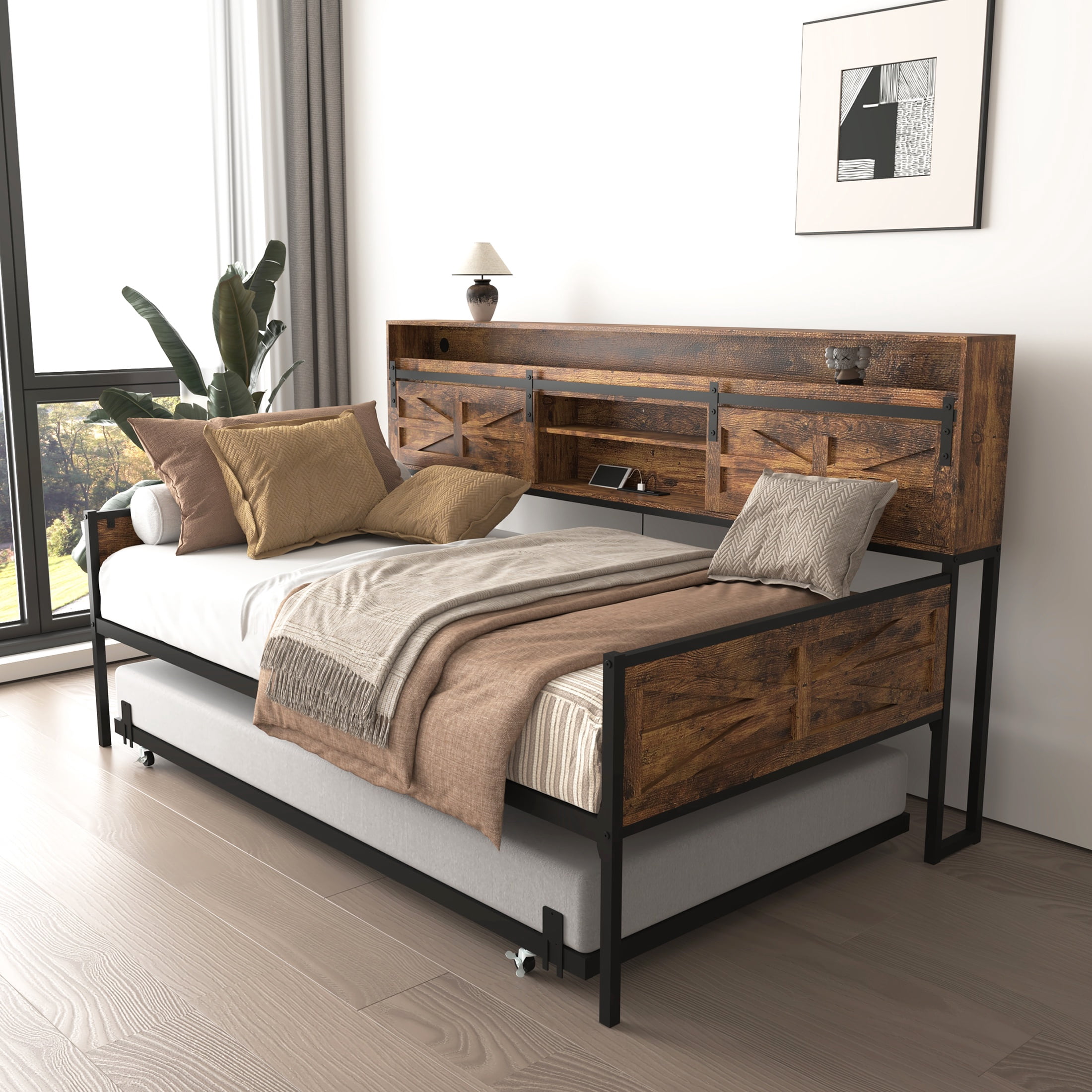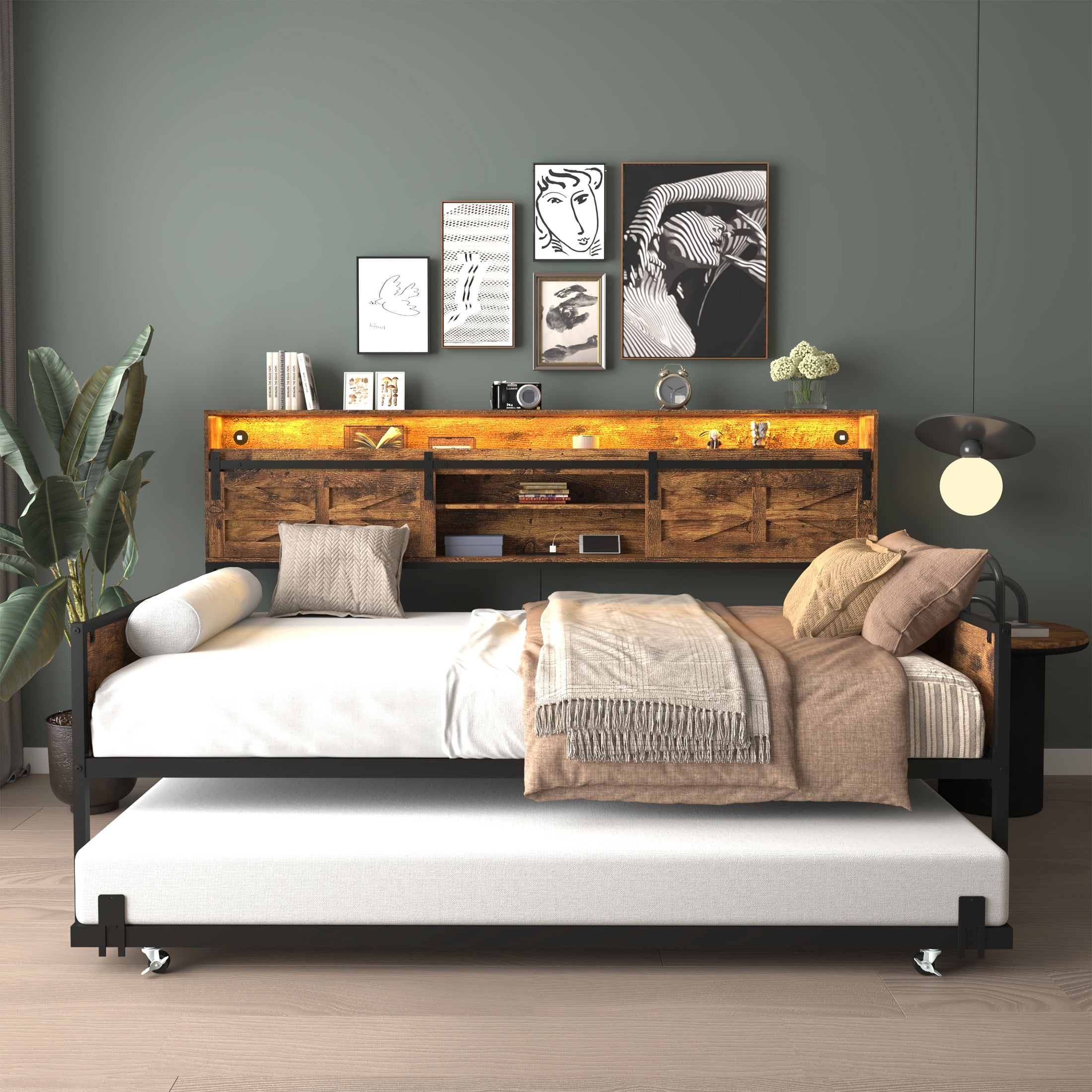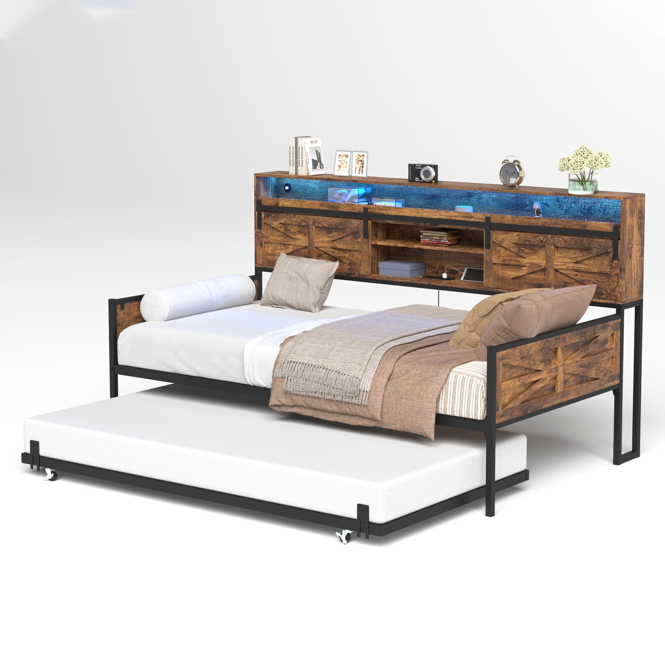 PORKISS LED Twin Daybed with Trundle, Metal Frame, Storage Headboard & Charging Station, Twin Size Bed Frame, No Box Spring Needed, Black+Brown