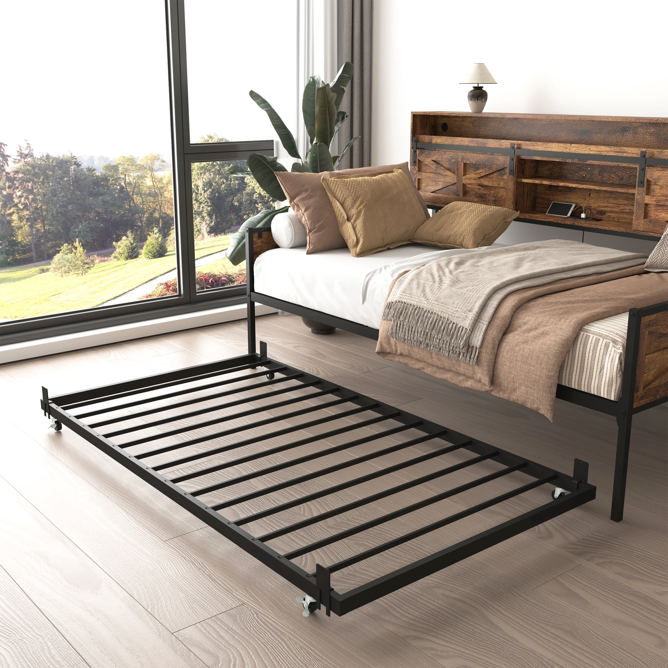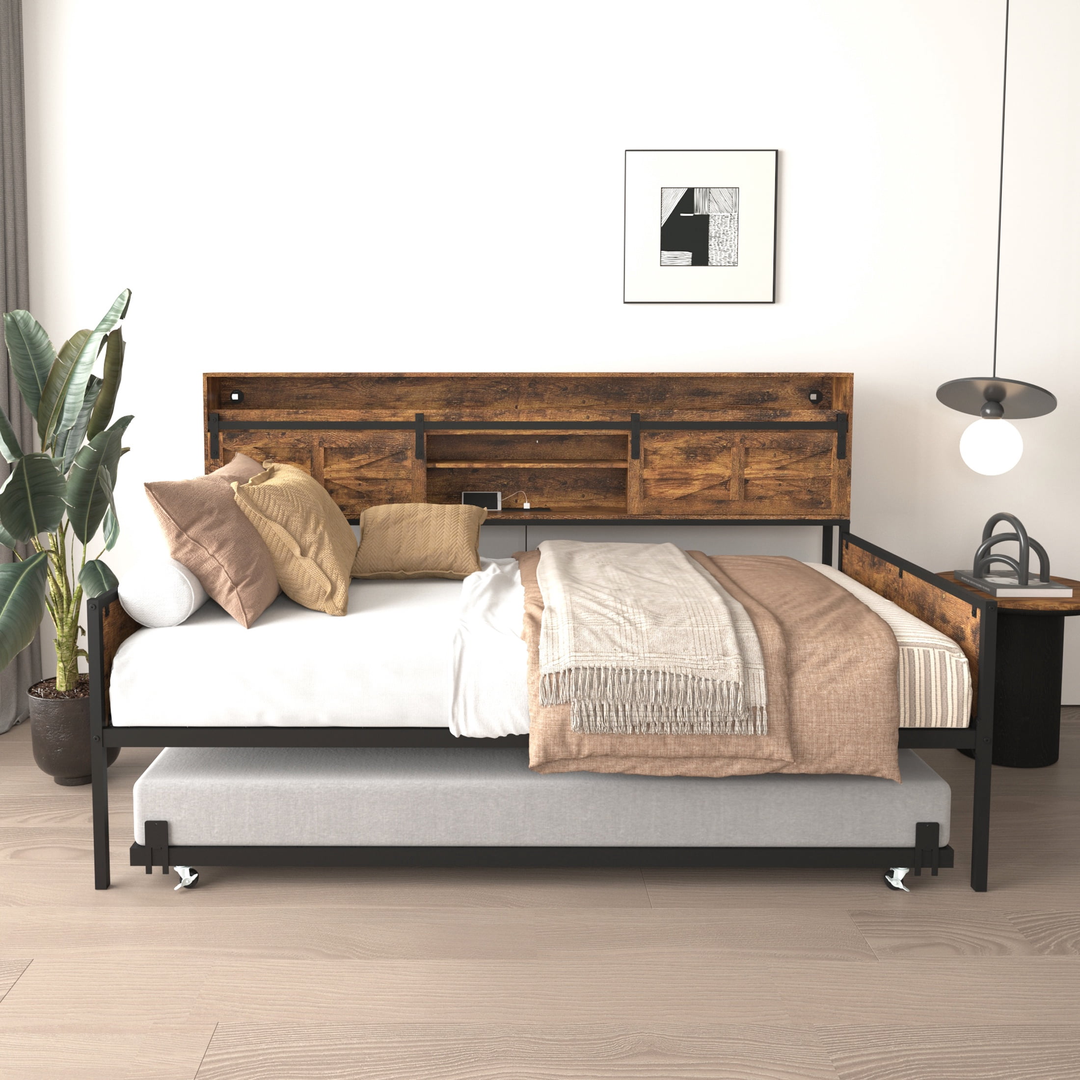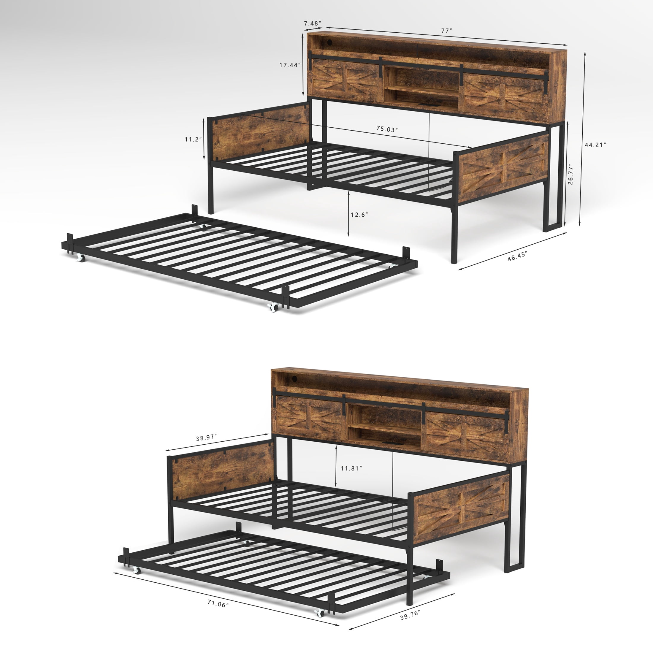 PORKISS LED Twin Daybed with Trundle, Metal Frame, Storage Headboard & Charging Station, Twin Size Bed Frame, No Box Spring Needed, Black+Brown