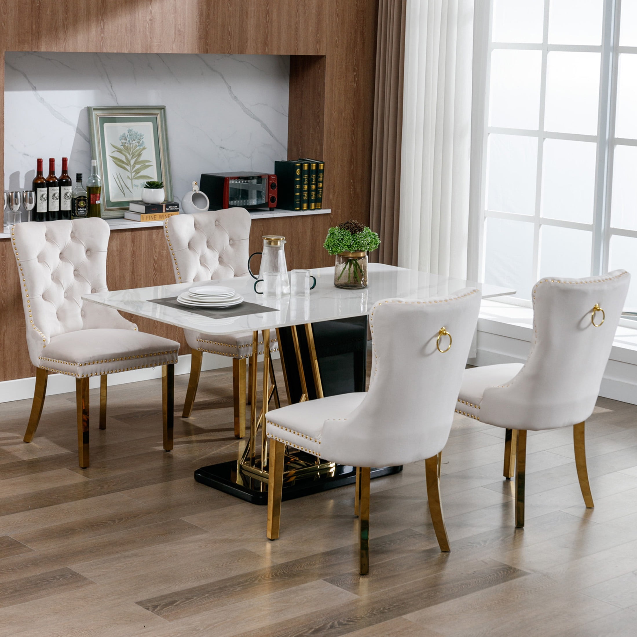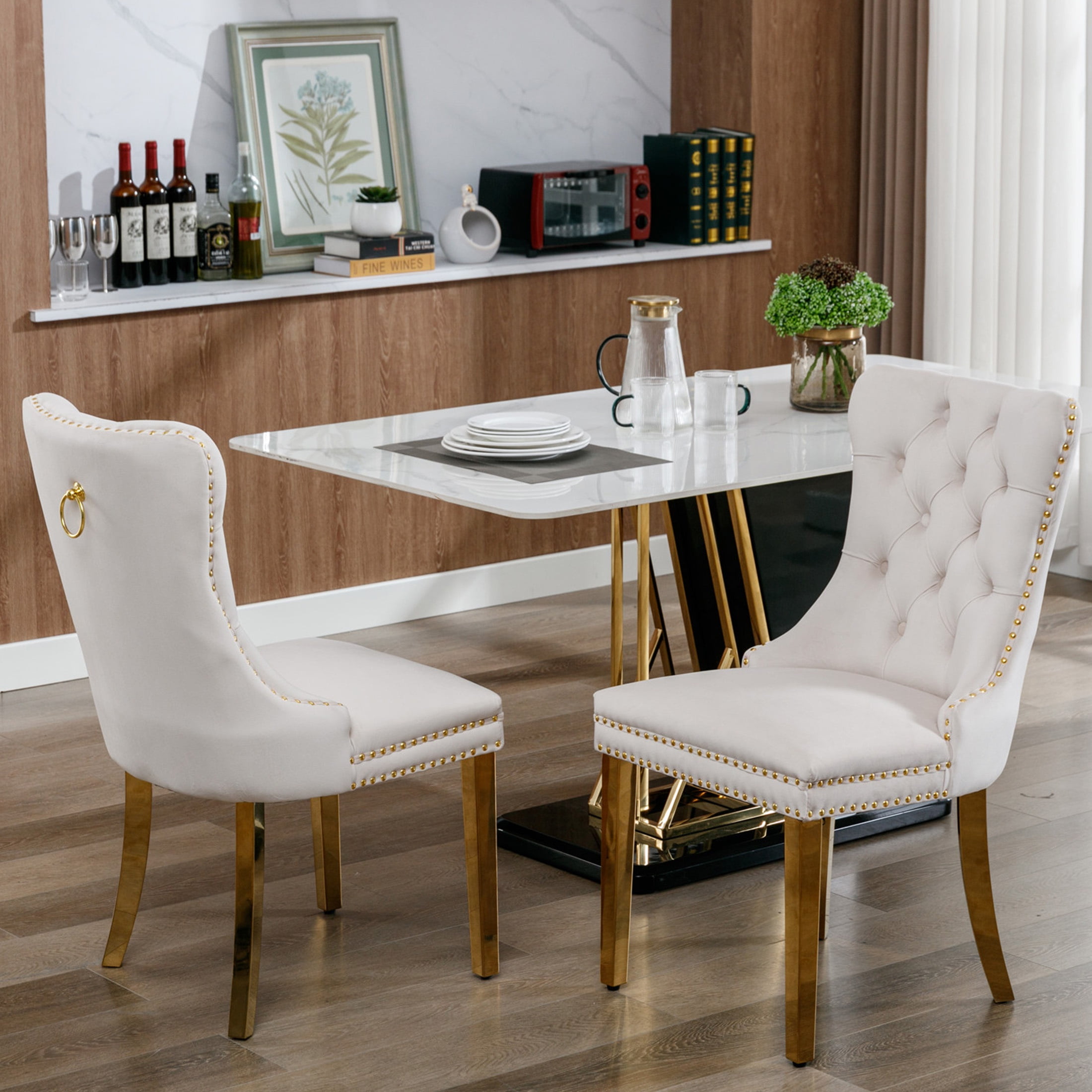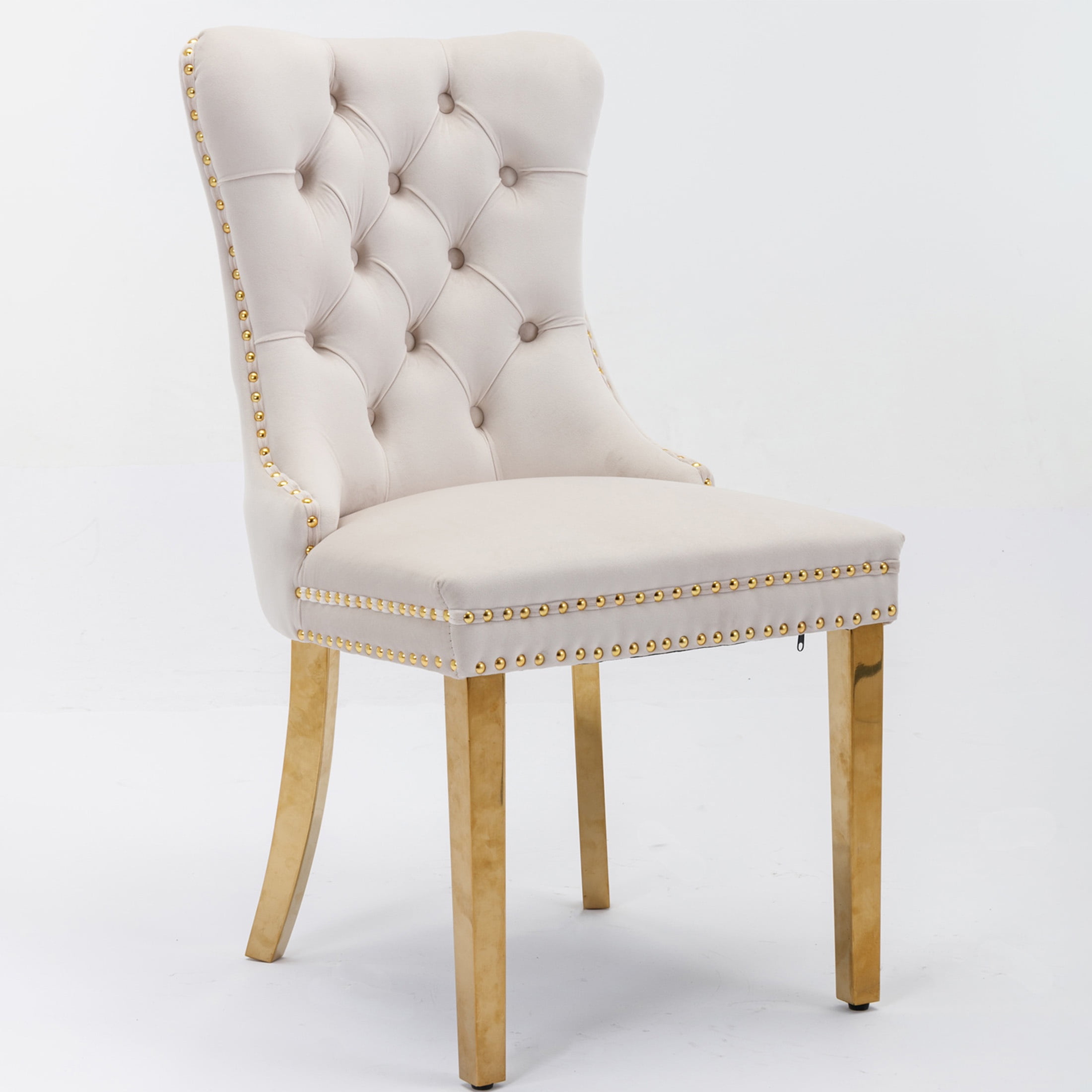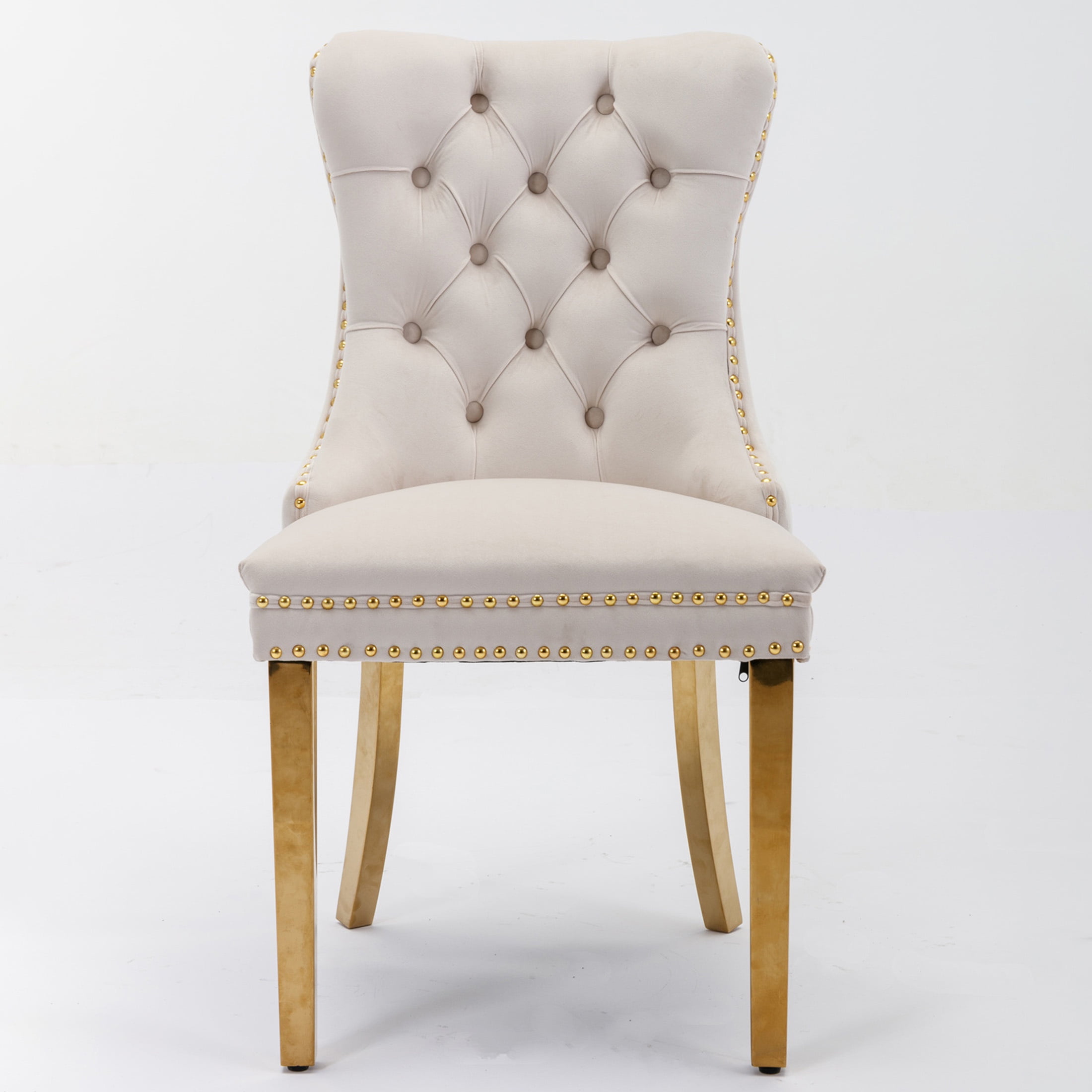 PORKISS Upholstered Dining Chairs, Modern Velvet Dining Room Chairs Set of 2 with Golden Stainless Steel Plating Legs, Tufted Solid Wood Kitchen Chairs with Nailhead Trim and Back Ring, Beige