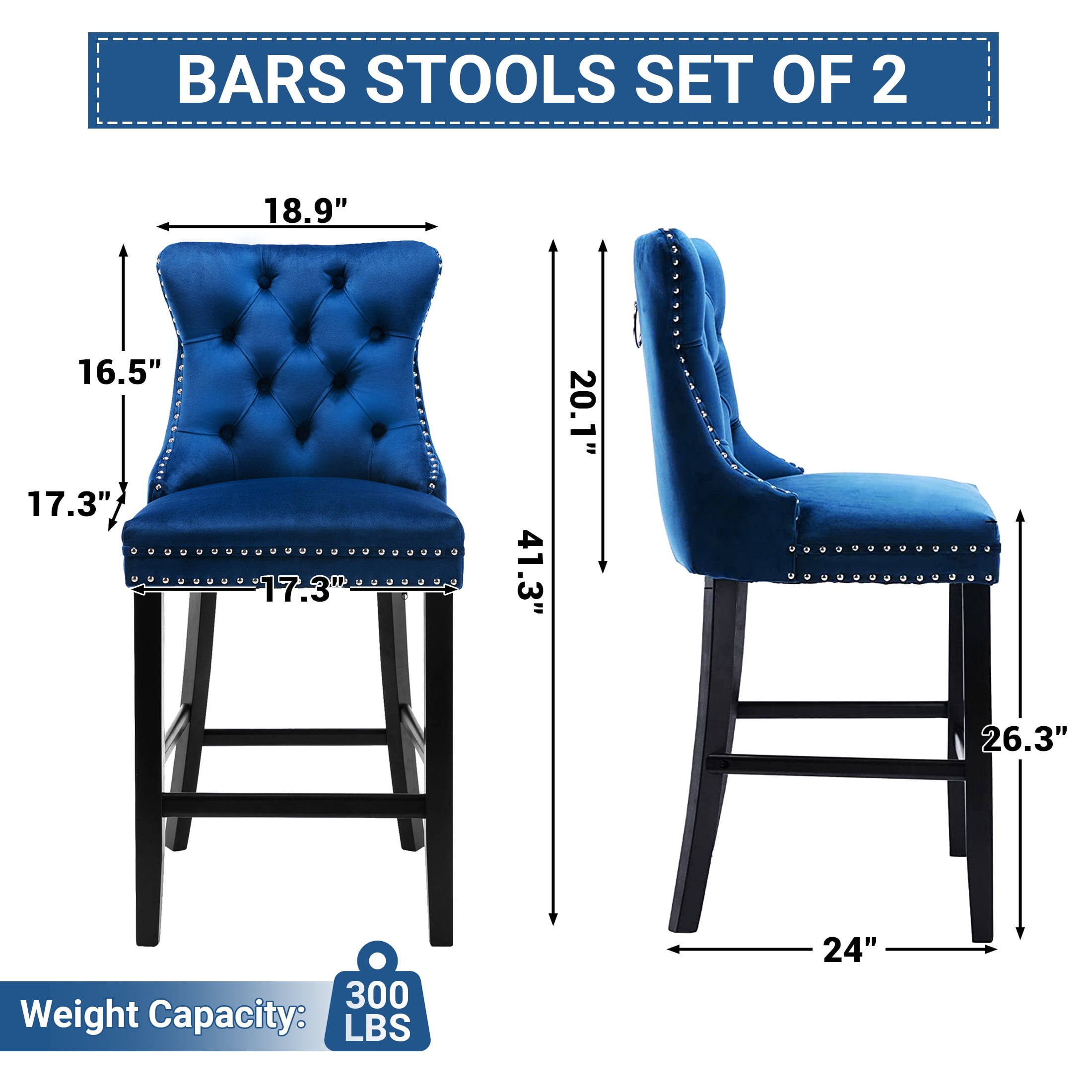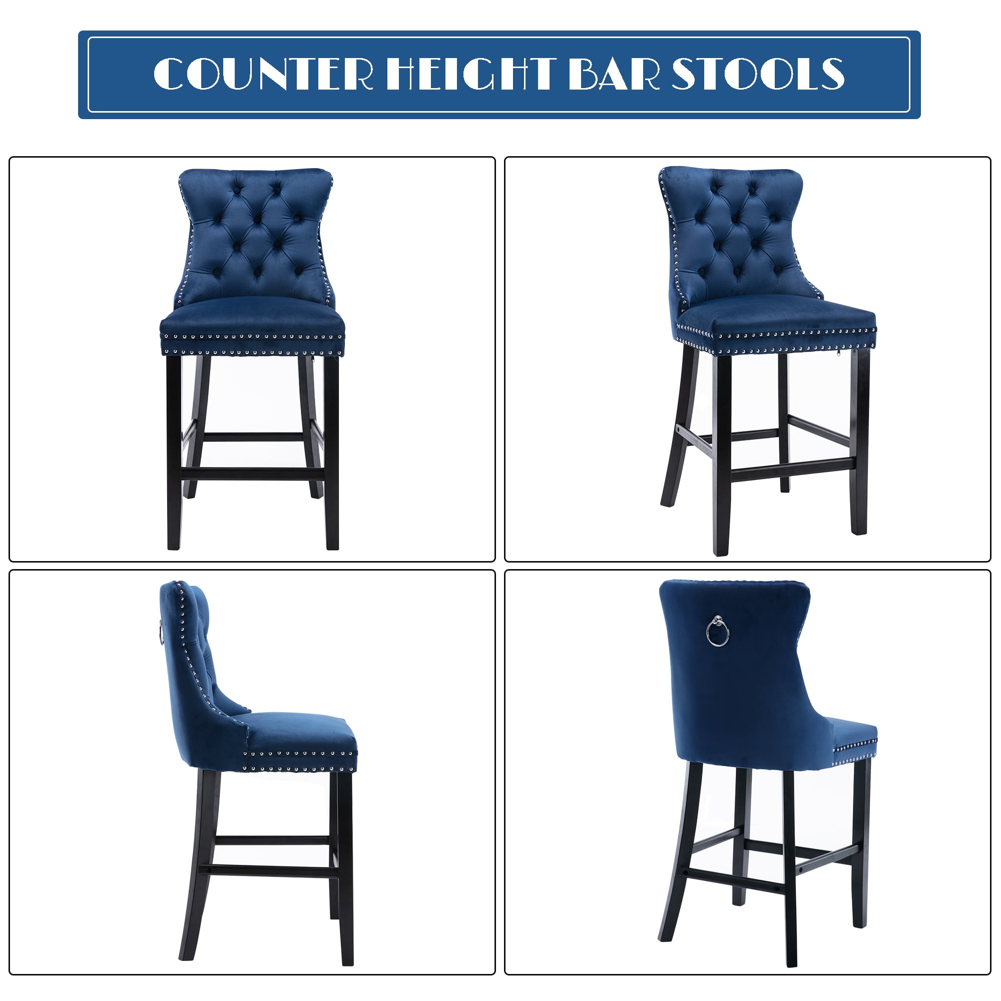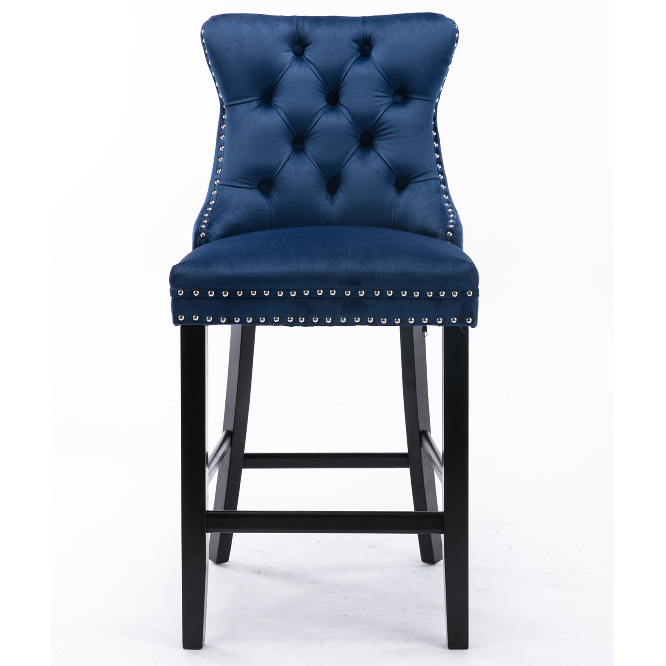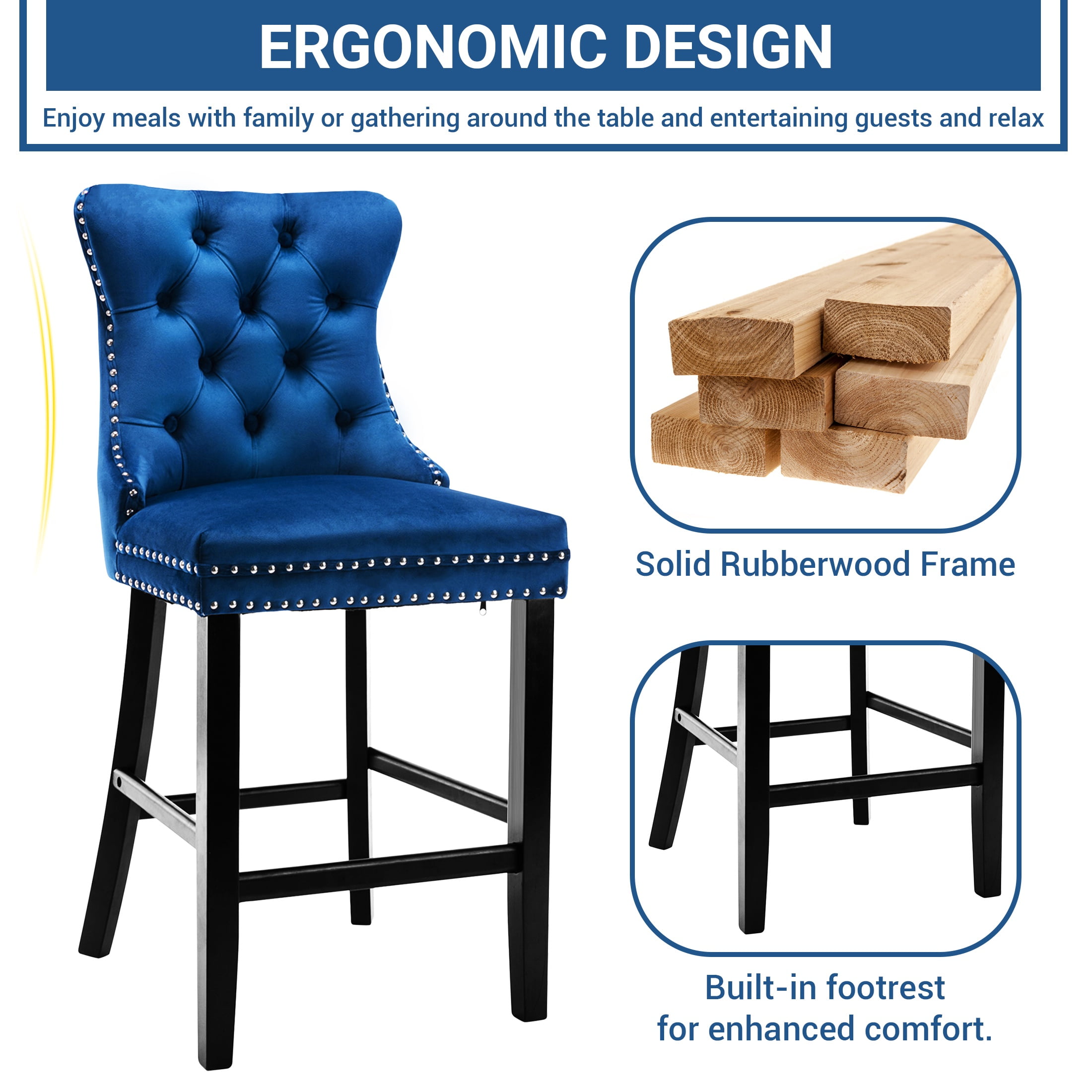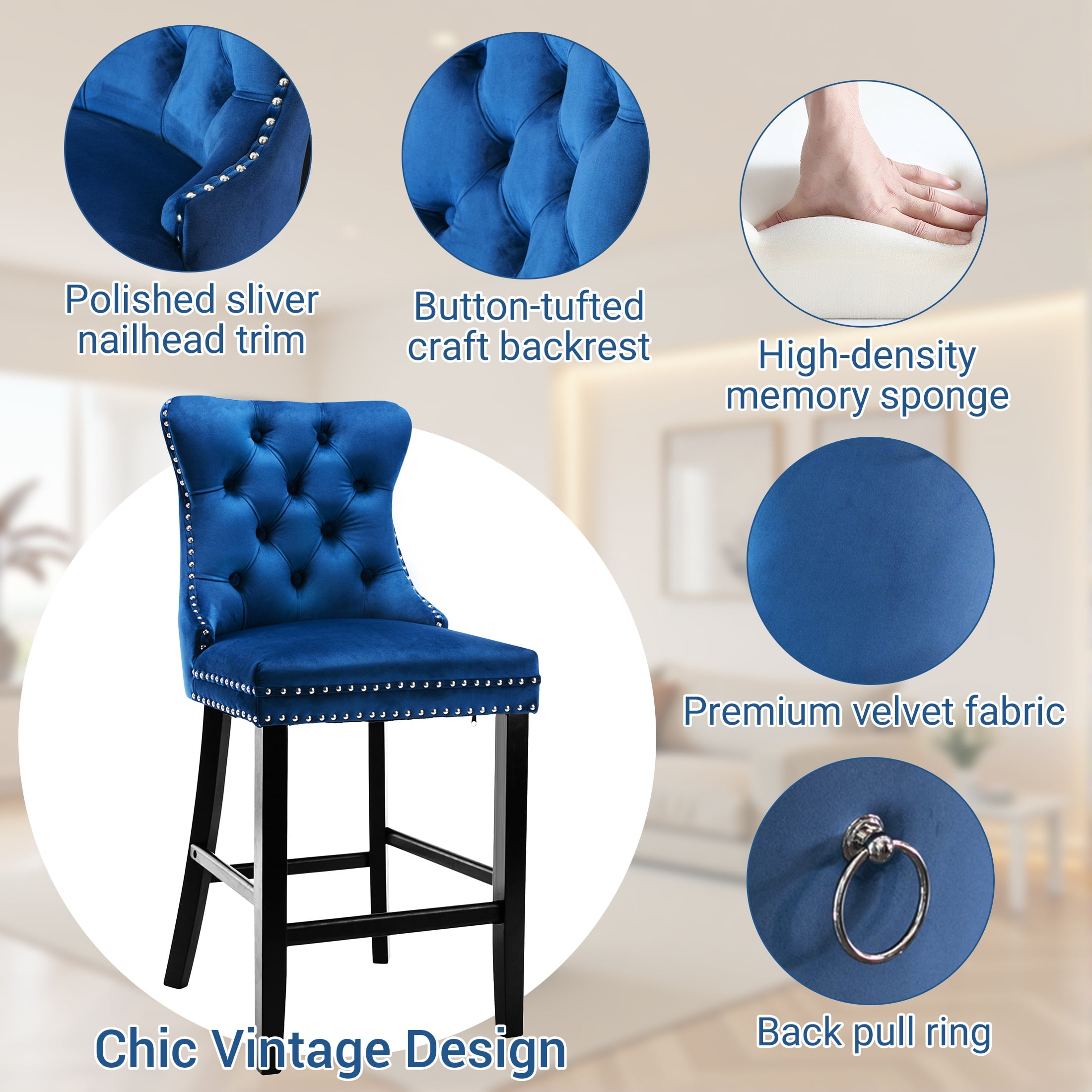 Paproos Upholstered Bar Stools Set of 2, Velvet Barstools with Wood Legs and Tufted, Modern Leisure Counter Height Bar Chairs with Chrome Nailhead Trim for Home Pub and Kitchen Island, Blue