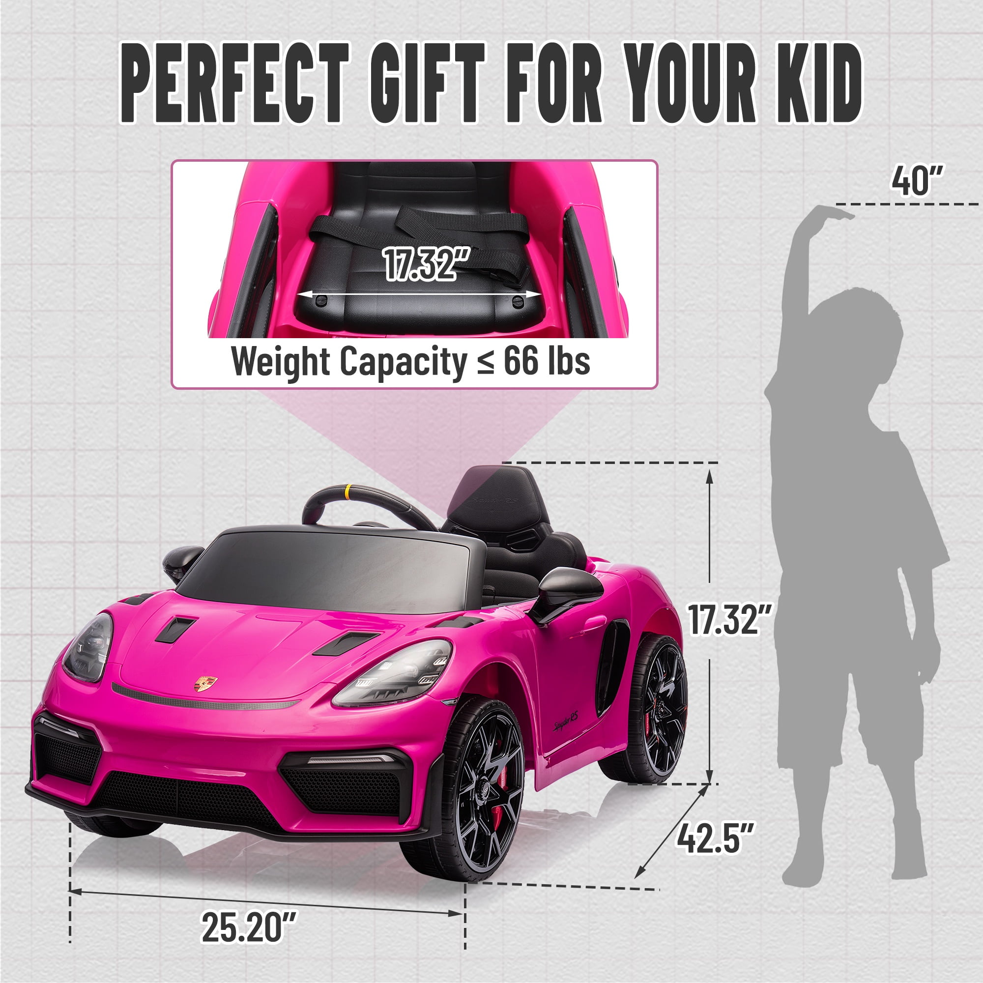 Officially licensed Porsche 718 Spyder ride on cars series. This toy car features the Porsche 718’s cool logo and sporty sports car lines. It comes with a steering wheel, accelerator pedal, rearview mirror, windshield and simulated wipers, which will give your child a realistic driving experience. This electric car offers 2 control modes. Parents can use the included remote control to ensure their child’s driving safety, and children can drive independently through the accelerator and steering wheel to ensure a flexible and safe driving experience. This Porsche ride on cars is equipped with a super-powerful 12V7AH battery and dual 35W super motors, with a maximum speed of 4.97MPH, providing hours of exciting experience. To protect kid’s driving safety, this electric car is equipped with a 4-wheel spring suspension system, adjustable seat belts, slow start, locking double doors, and LED headlights and taillights, allowing children to drive on a variety of roads day or night. The toy cars adds a Bluetooth music system, car speakers, MP3 players and speakers to enhance entertainment, allowing children to enjoy their favorite music and stories while cruising. For easy transportation, this car includes a built-in handle and rear auxiliary tires, making it easy to move indoors, in the yard or at the community park. In short, this ride on cars is suitable for children aged 3-6, which can enhance imagination and hand-foot coordination, making it a perfect gift for birthdays, newborns, Christmas and New Year. Product Specifications: – Product Name: Product Electric Car – Product Dimensions: 42.5″(L) x 25.2″(W) x 17.3″(H) – Weight: 30.86(LBS) – Packaging Dimensions: 43.3″(L) X 22.24″(W) X 29.5″(H) – Packaging Weight: 40.79(LBS) – Seat Dimensions: 14.17″(L) X 7.87″(W) X 12.2(H) – Product Material: PP; Metal, PVC – Recommended Age: 3-6 Year Old – Seats: 1 Kid – Maximum Weight: 66 lbs Battery Specifications: – Battery: 12V 7AH – Motor: 2 x #550 – Speed: 3-8KM/H – Charging time: 8-12H – Usage time: 45 minutes Package includes: – 1 x Ride on cars – 1 x Parent remote control – 1 x Instruction manual – 1 x Charger Note: 1. Please check the size of the product in detail before purchasing. 2. If you have any questions, please feel free to contact our professional customer service team. We will provide you with a solution within 24 hours. Customer service email: [[email protected]]