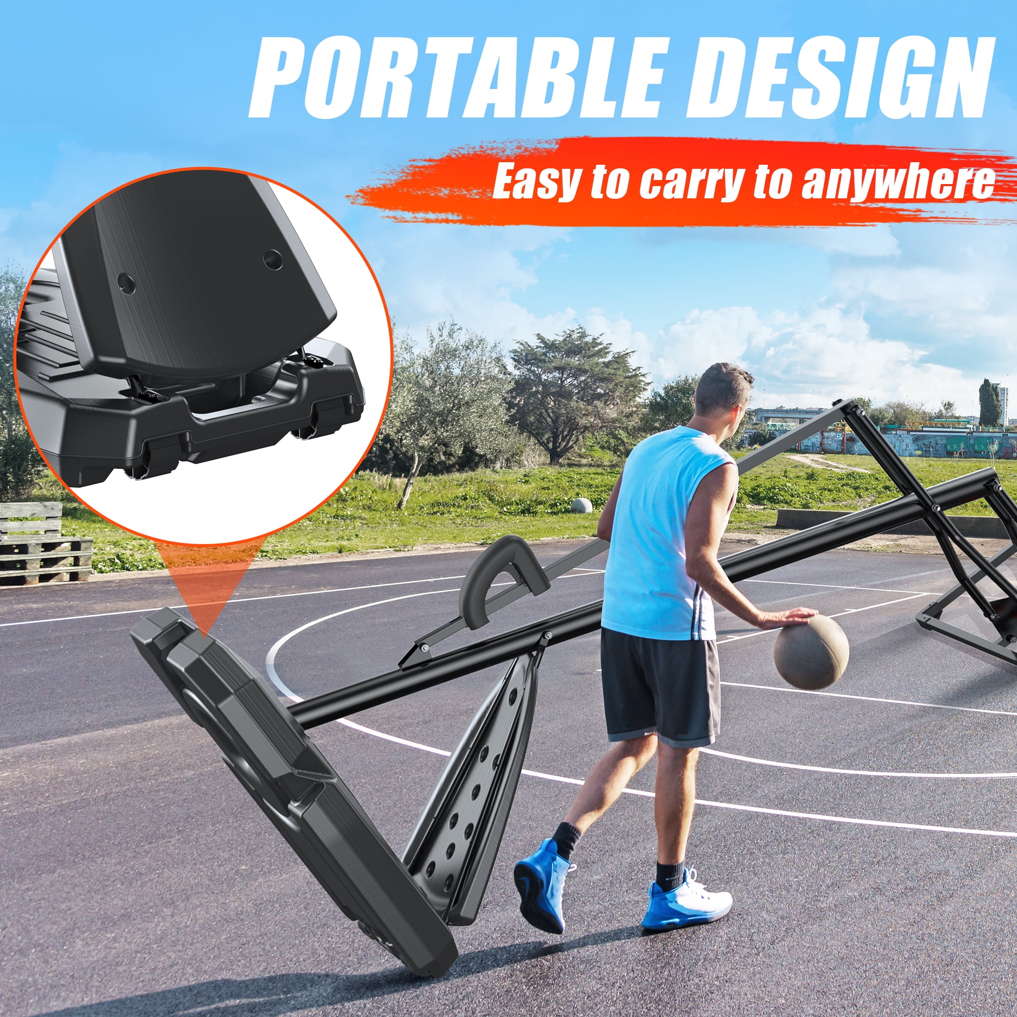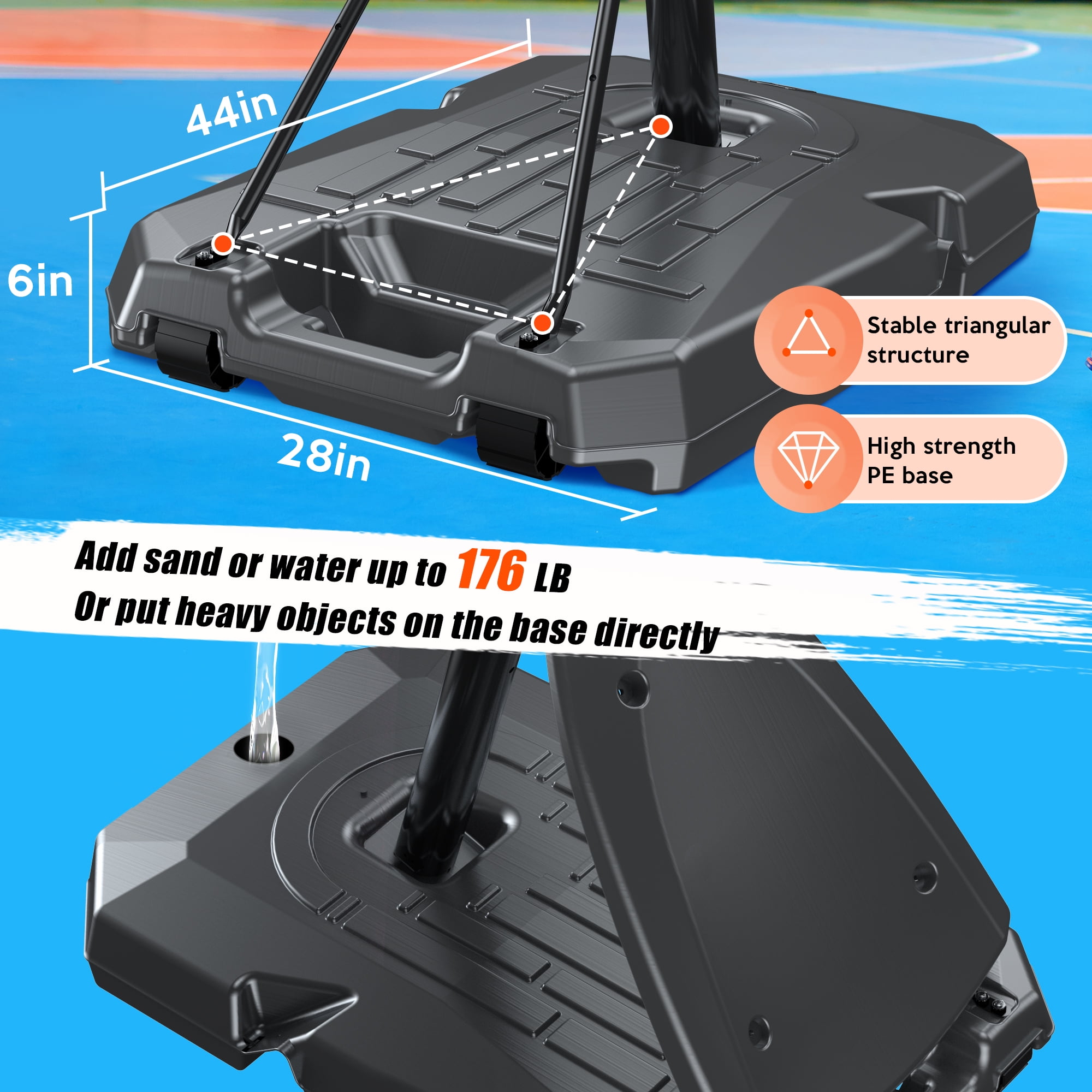 44″ High-Strength Transparent PC Shatterproof Backboard:Experience durability and reliability with our 44″ high-strength transparent PC shatterproof backboard. Made Of Resistant Materials, Fits All-Weather Conditions:Crafted from resilient materials, our basketball system is designed to withstand all weather conditions, ensuring longevity and performance in any environment. Solid Dual-Spring Damping Mechanism Mounted To The Backboard:Enjoy consistent rebounds and reduced vibration thanks to our solid dual-spring damping mechanism, securely mounted to the backboard. The Dual Bracket & 2.8″ thick Pole Create The Most Stable Support:Benefit from ultimate stability with our dual bracket design and robust 2.8″ thick pole, providing unparalleled support for intense gameplay. Lifting Structure With Lever Principle:Effortlessly adjust the height of your basketball hoop with our innovative lifting structure, utilizing the lever principle for smooth and convenient adjustments. Basketball Rebounder For Practicing Passing And Catching Skills:Enhance your basketball skills with our built-in basketball rebounder, perfect for practicing passing and catching skills to take your game to the next level.
