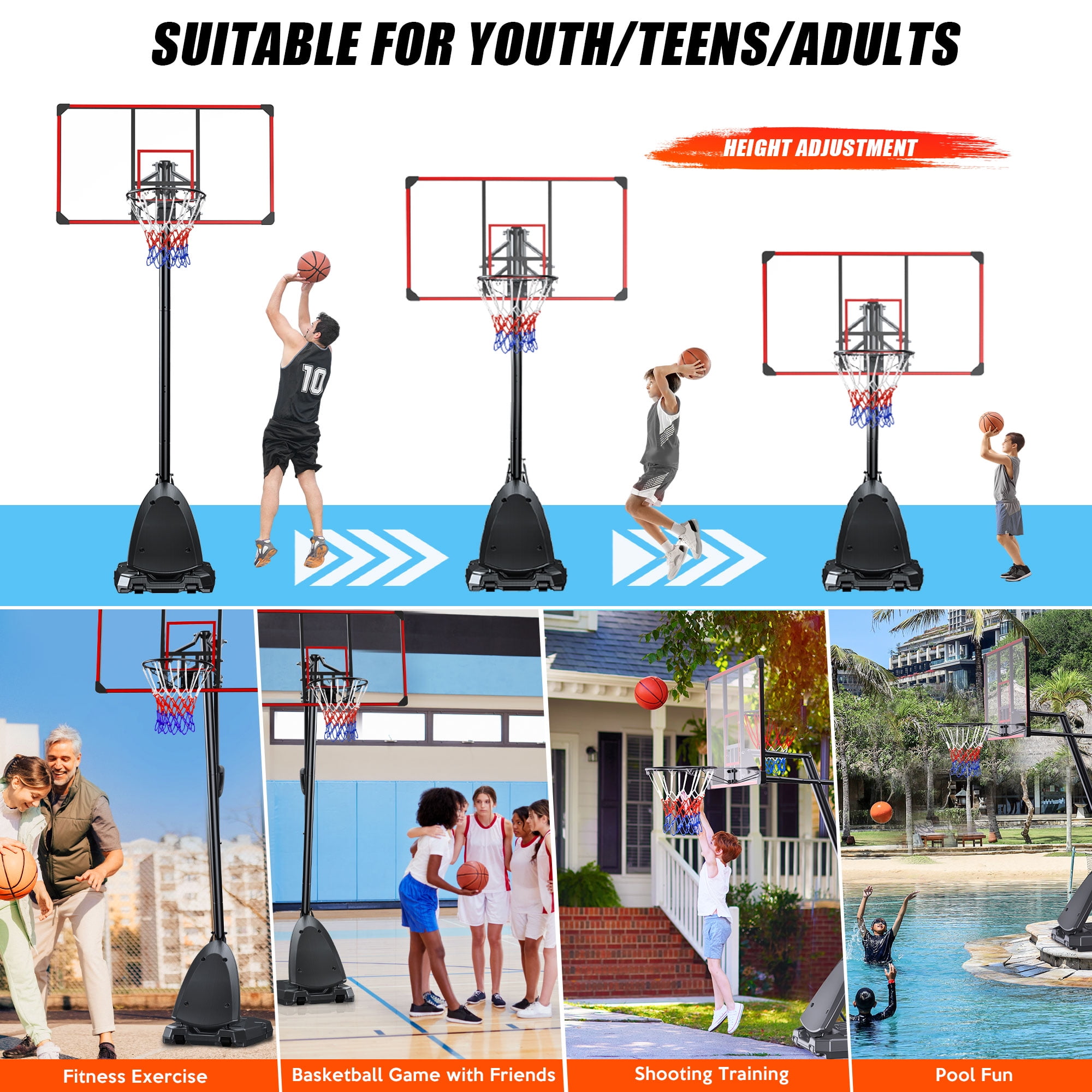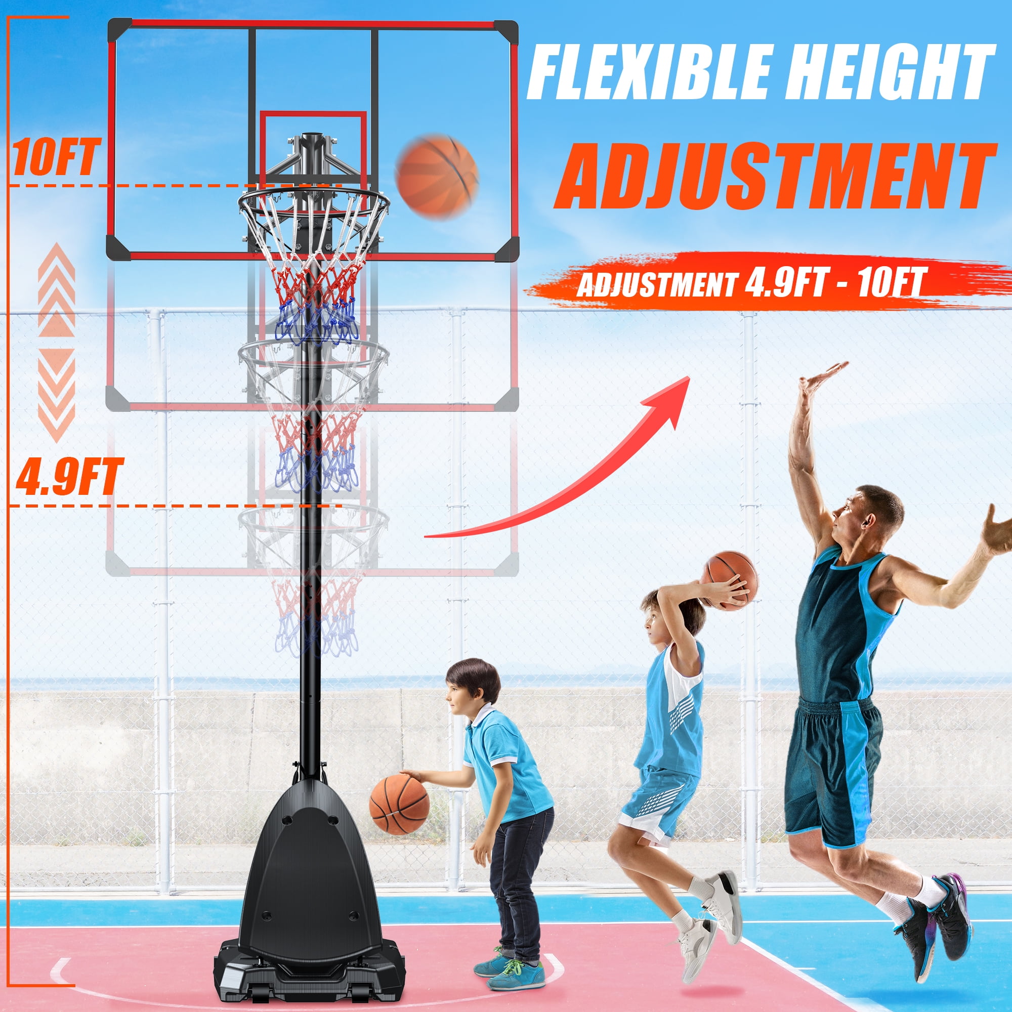 Portable Basketball Hoop for Indoor & Outdoor Use,44″ Shatterproof Backboard, Adjustable Height 4.9ft to 10ft for Kids, Teens, Adults