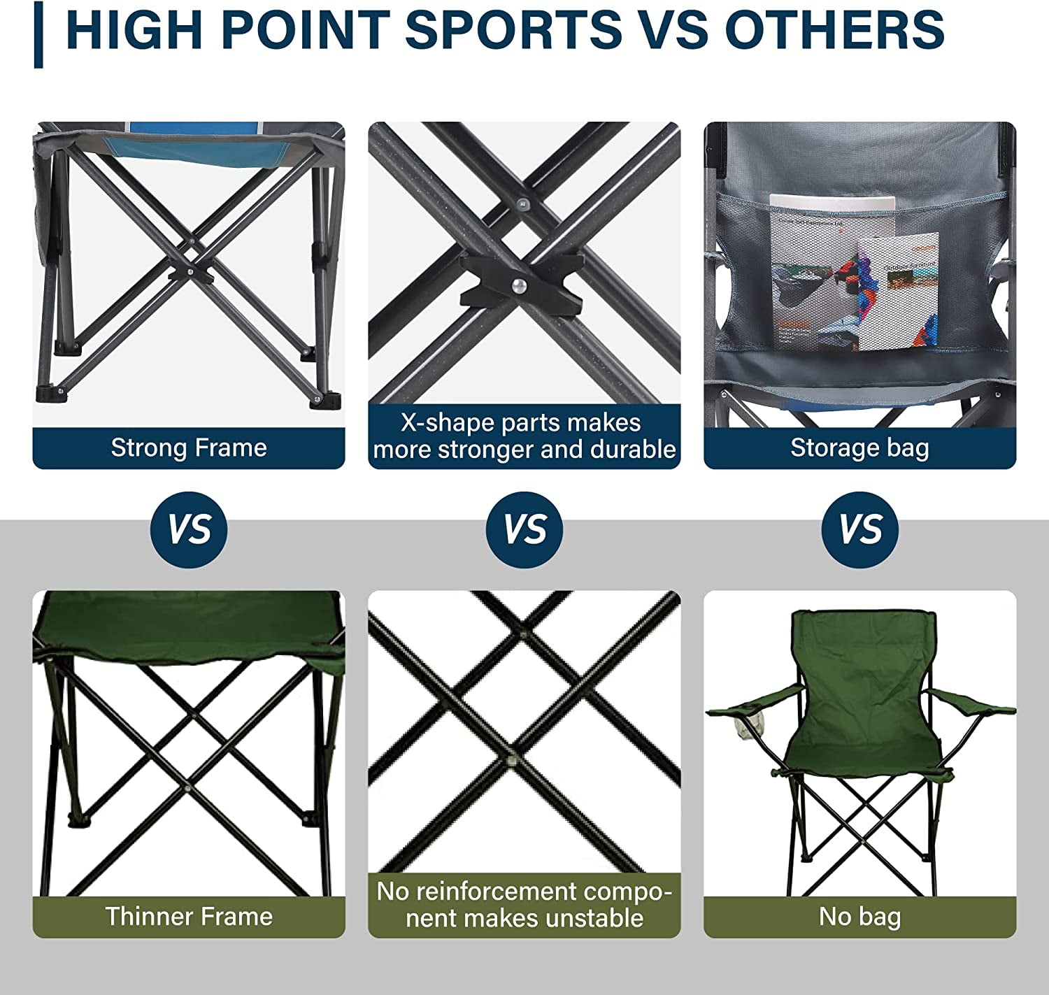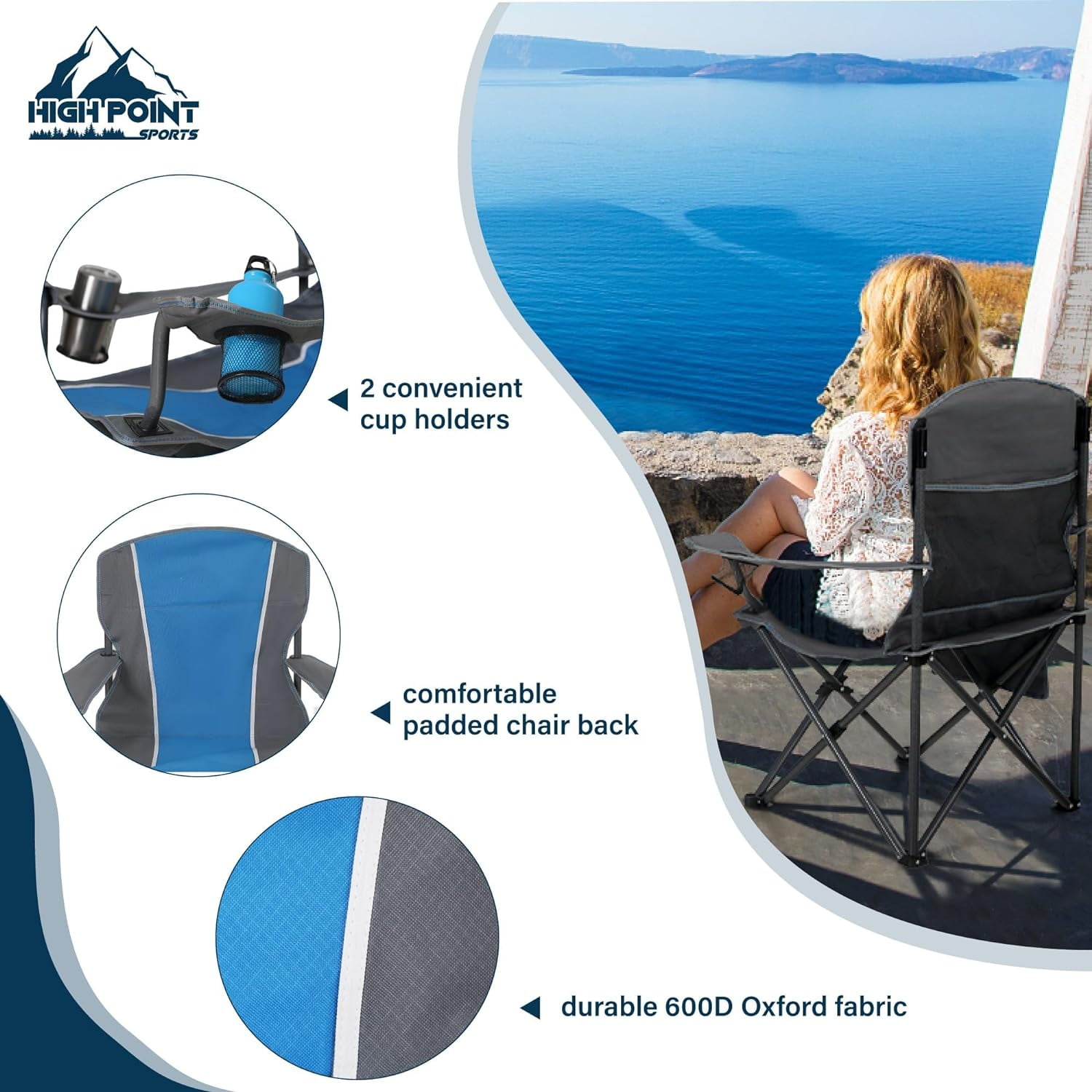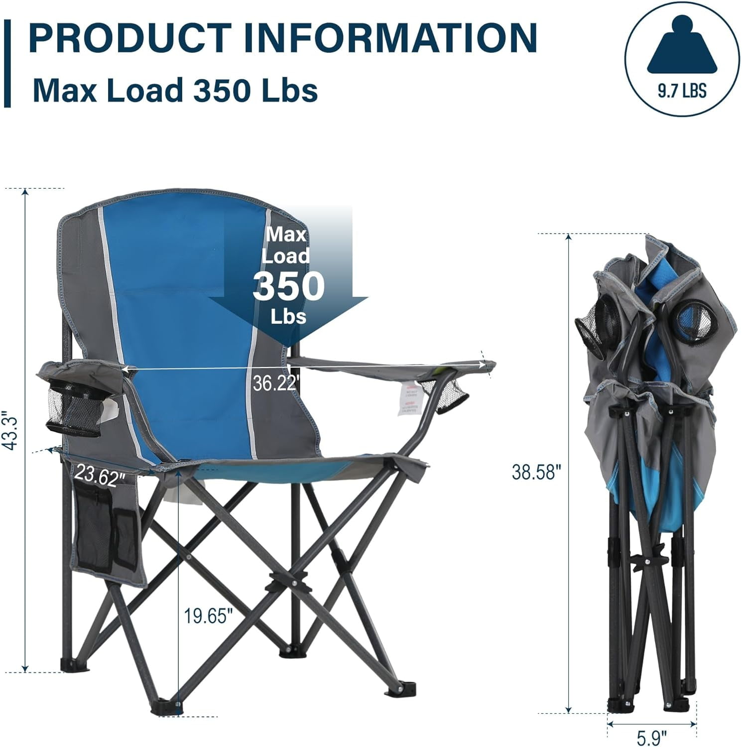 Dimensions: this camp chair size is 36.2″ x 23.6″ x 43.3″, Back height is 23.6″, offers luxurious comfort with its large seating area and lumbar support system. It folds down to just 5.9″ x 38.58″ Lightweight and Easy Storage: HIGH POINT SPORTS folding camping chair can be carried around without stress, weights 9.7 pounds. Our outdoor chairs can be folded in seconds, which also makes it easy to carry or place in the trunk of your car. The carrying bag is FREE! Extra Storage Space: The foldable chair equipped with a cup holder for drinks and storage bag for magazines, phone, and other personal items that can be placed beside the seat. These practical designs make outdoor activities more comfortable and convenient. Multiple Useage: You can take this portable camping chair anywhere you venture, and it is suitable for hiking, camping, traveling, beach, fishing, picnics, concerts or other outdoor activities. And ensure that you will have a long lasting chair to enjoy outdoor activities for whole year. Sturdy Material: The fold camping chair is designed with high-quality steel material and high-performance powder coating, which can provide the protection of the chair surface against rust, scratches, rain and UV damage. And 600D x 300D padded oxford fabric can support up to 350 lbs which suitbale for most of people.
