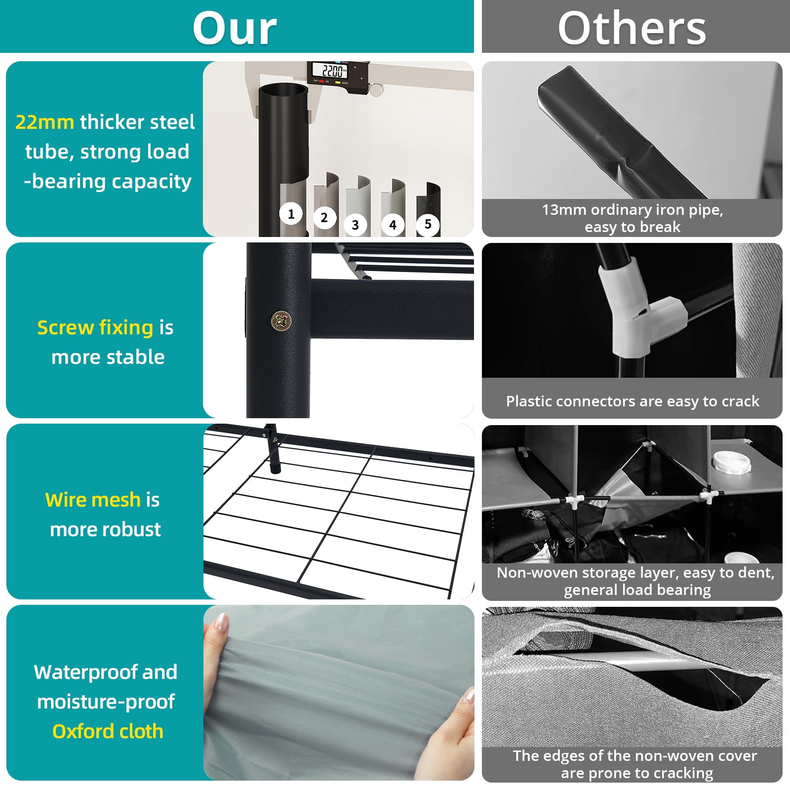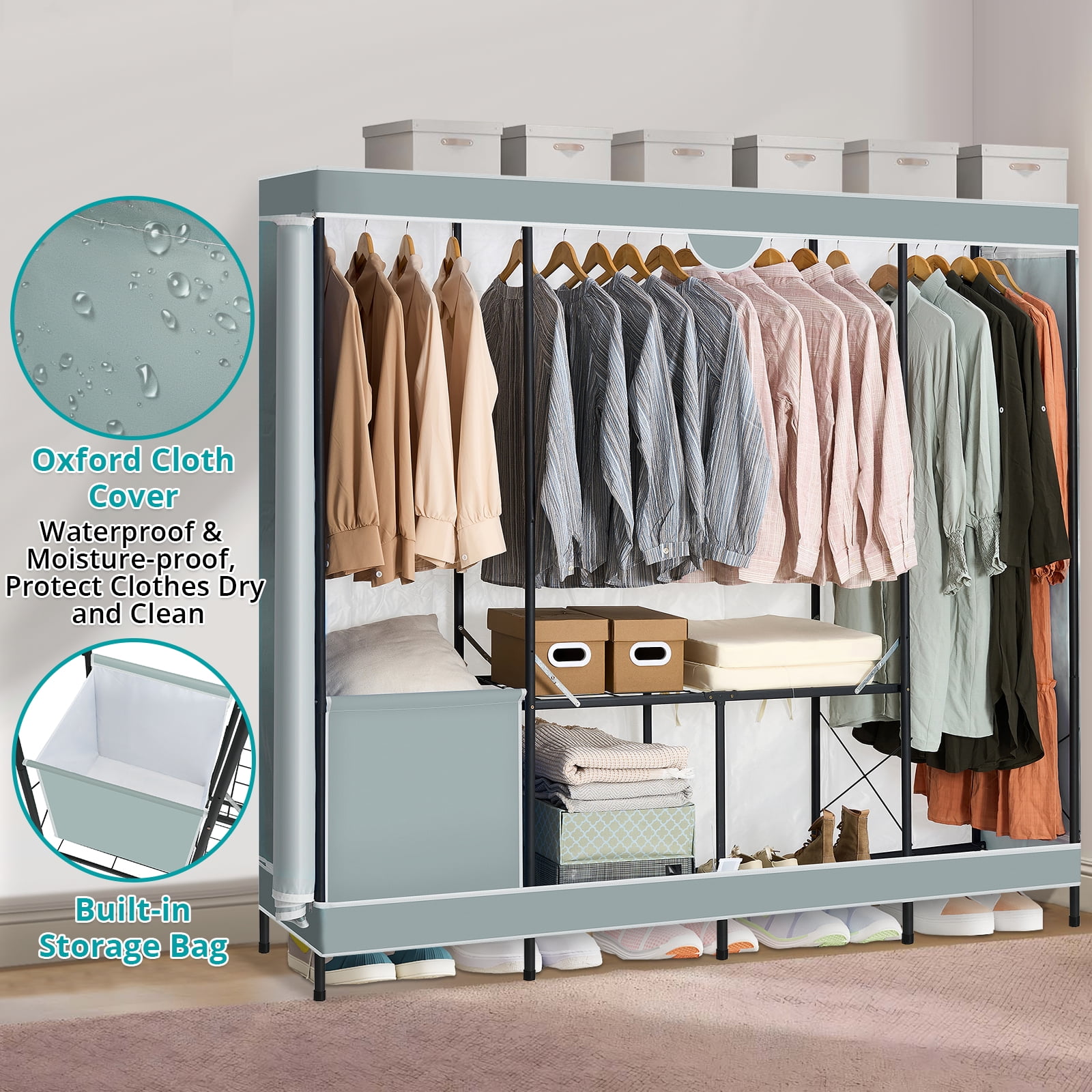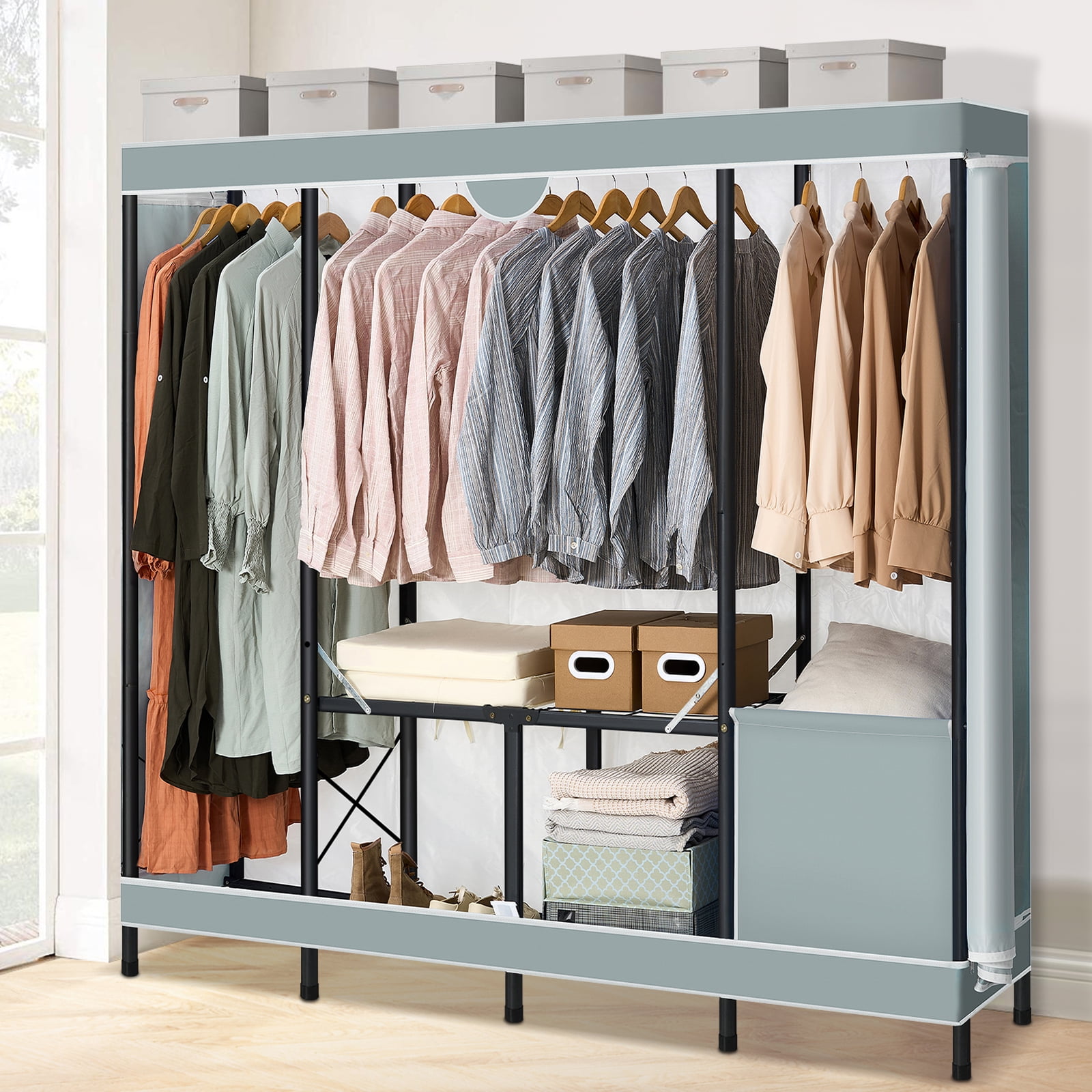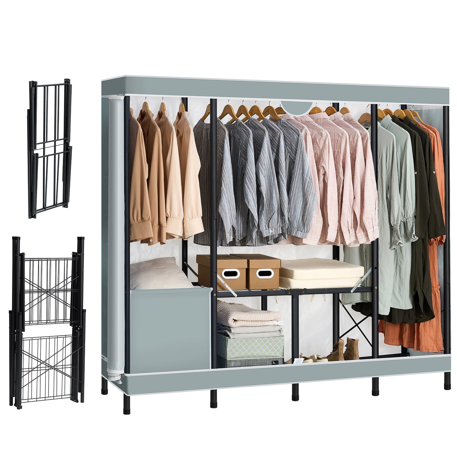 FEATURES EASY TO INSTALL: This closet rack has a one-piece frame, just combine the bottom and top frames together, no complicated installation steps and tools required, finished in 15 minutes. The folding function also saves space, when not in use, you can also fold the portable closet and put it in the corner. STORAGE BAG: This clothes rack comes with a detachable large-capacity storage bag, which is especially suitable for storing pillows, quilts, dolls, etc., or as a laundry basket. LARGE CAPACITY, STRONG LOAD: This garment rack is equipped with 3 hanging rods and 9 shelves (3 tiers), which can provide a lot of storage space for all kinds of clothes, coats, bedding, shoes, suitcases, storage boxes and so on. Each hanging rod can hold up to 44 pounds and each shelf can hold up to 33 pounds, reliable weight capacity. STURDY & LASTING: This heavy duty clothing rack is made of high quality metal, very sturdy and stable. Also, this portable closet hanger is treated with a waterproof coating that makes cleaning and maintenance a breeze, ensuring that the metal hanger will last for years to come. WITH DUST COVER: Oxford fabric dust cover is provided, which is more resistant than ordinary non-woven fabric and not easy to tear. Zipping up the cover protects your clothes from dust and moisture and keeps them fresh. Specifications Product Size: 74 “L x 18″ W x 67” H (189x 46x 169cm) Color: Gray, Beige, Blue Material: carbon steel, oxford cloth Age group: All Package Includes portable closet x1, storage bag x1, cover x1