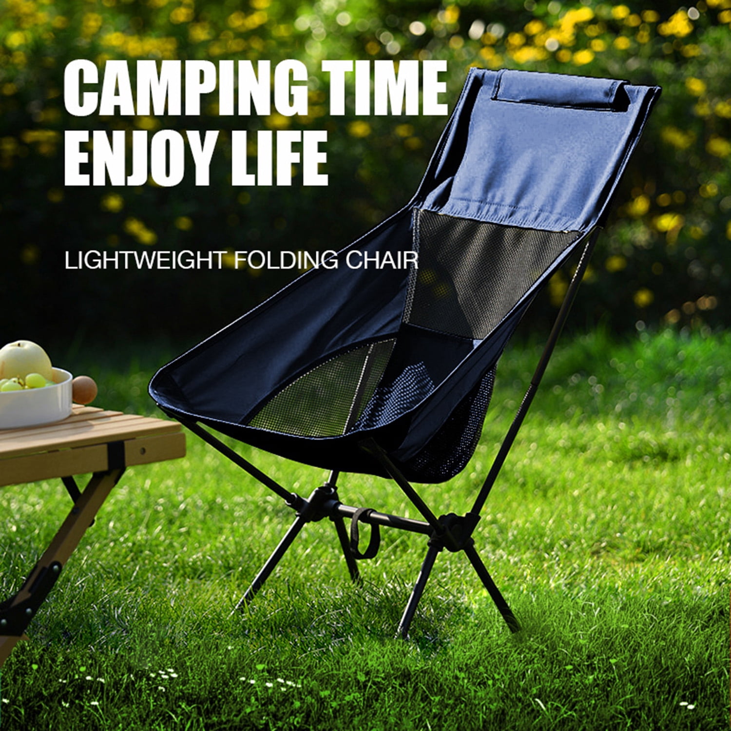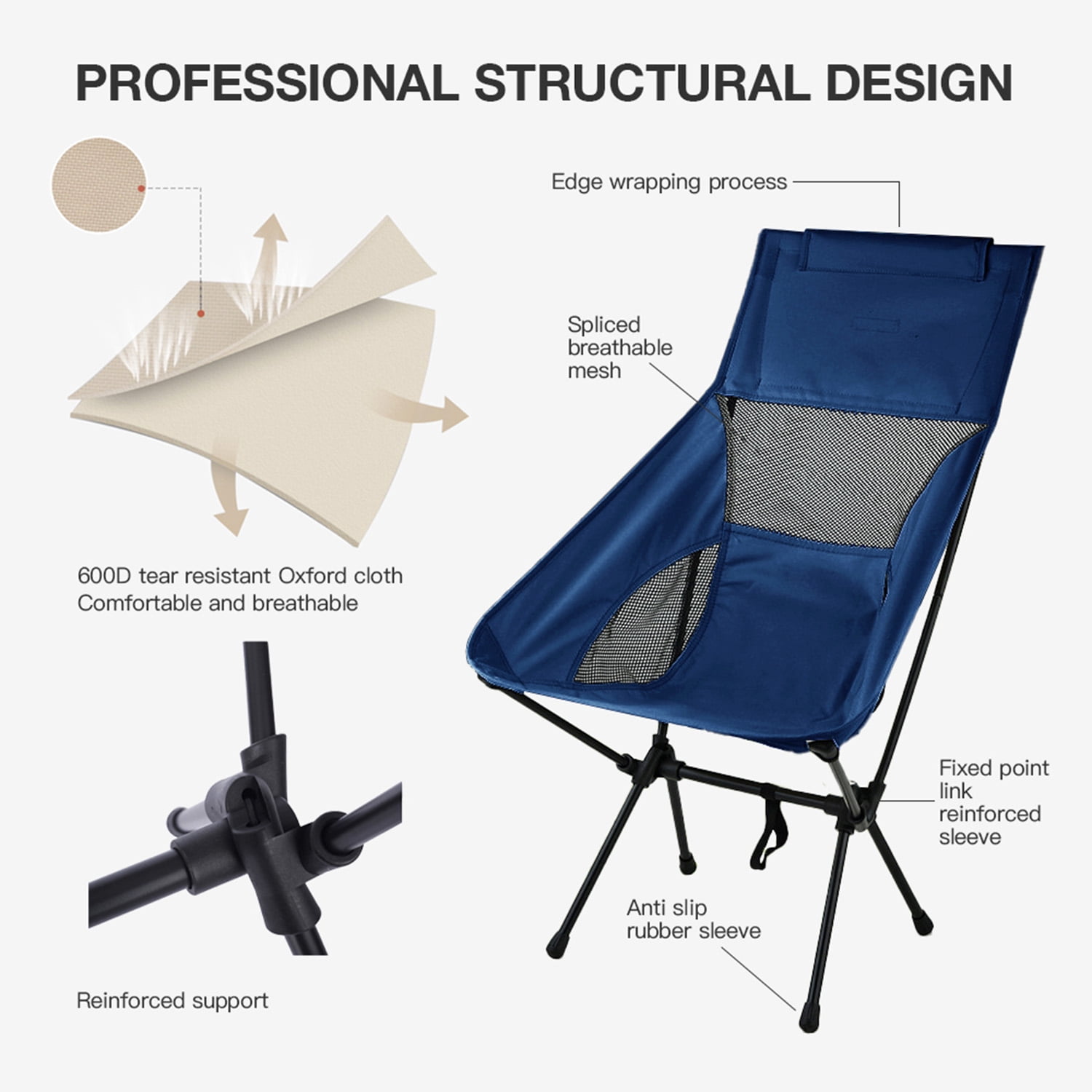 Bring the lightweight foldable chair and enjoy the nature Incredibly comfortable, robust and portable outdoor chair that can be assembled super quickly and easily Our innovative high back lounge chair is equipped with everything you need for maximum comfort and enjoyment. Portable equipment for outdoor activities This compact camping folding chair balances features, comfort and durability while remaining easy to carry. The mesh fabric is not sagging and it is much more durable and breathes much better than chairs with solid fabrics in warm weather. Product quality test & compression resistance test The aluminium frame has no deformation after testing, as it is equipped with a durable and wear-resistant triangular support design that corresponds to the mechanical principle. The weight capacity is up to 130 kg, which corresponds to the total weight of two adults Spherical foot cover The spherical foot cover can significantly increase the friction between the chair and the floor, make the chair more stable and protect the floor from damage. Portable carry bag Foldable structure with integrated design, easy to install and disassemble, convenient to pack and carry This folding chair is lightweight and compact and ideal for all outdoor activities such as travel, picnic, barbecue, festivals, beach, fishing, excursions or just in your own garden. If you want to prepare a night campfire or family reunion, this foldable chair beach chairs chair is very useful for guests or friends. High-backed camping chair Color: Dark Blue, Black Material: Oxford cloth and aluminium alloy. Weight load: approx. 130 kg. Folded Dimensions (Packed in carrying pouch):12cm x40cm x15cm Weight: 2kg. Suitable for: Camping, hiking, picnic, beach, fishing, etc.