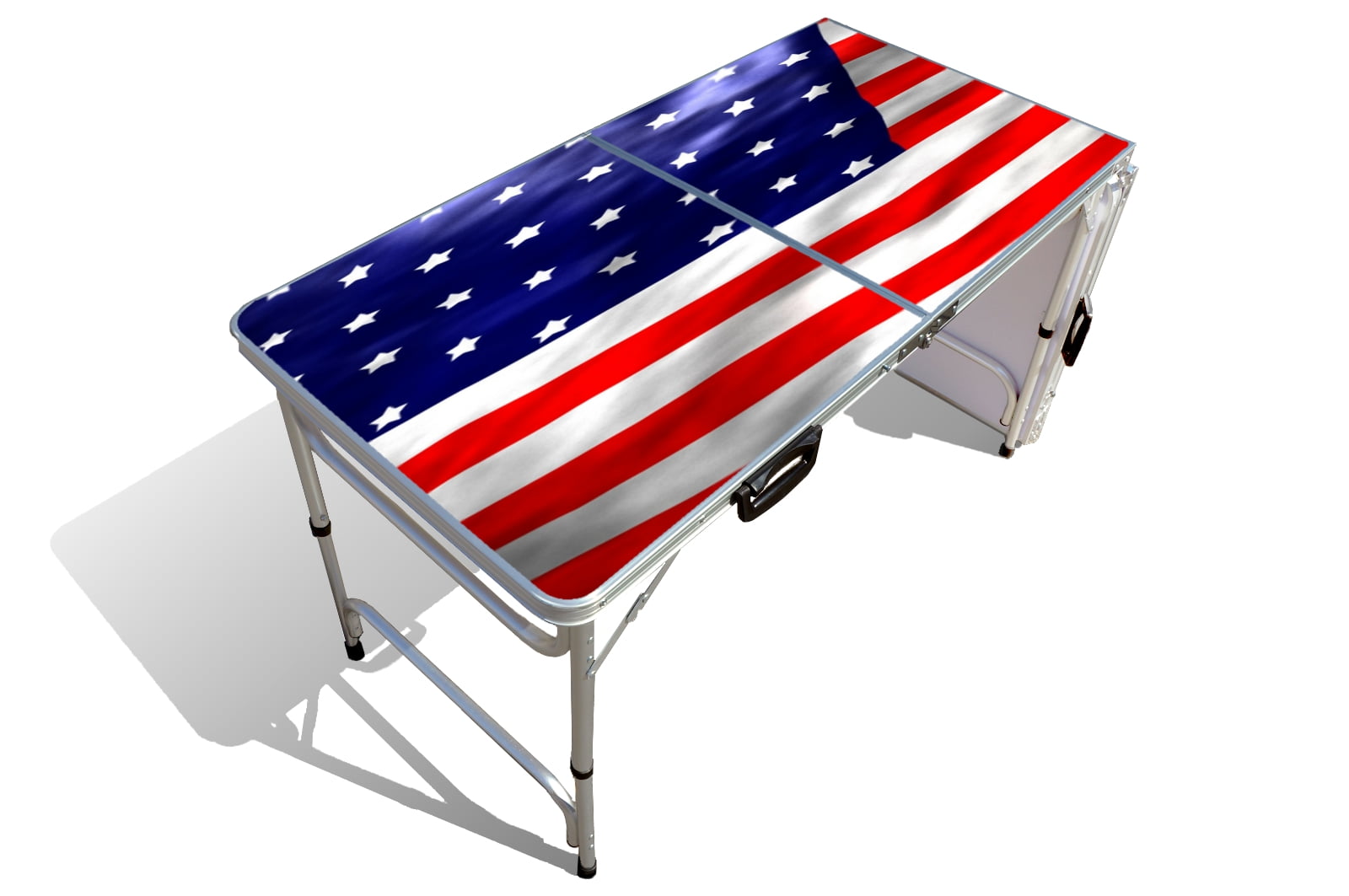 8 ft. or 4 ft. Folding Party Table w/ US Flag Graphic. Adjustable height for kids (22 inches) and adults (28 inches) This portable party table is perfect for birthday parties, tailgates, backyard bbq’s, family events, play dates, corporate promotions, tradeshows, etc. Quickly set up as an 8 foot table or 4 foot table. Extend the legs for an adult-sized table or leave legs retracted for a perfect kid-sized table. The Party Pong Party Table quickly and easily folds into a 2 ft. x 2 ft. compact carrying case, only 5.5 inches wide, with handles for easy portability and storage Aluminum Framing and MDF panels with melamine laminate makes this table Lightweight, Portable, Folding, Compact, Rigid, and Strong