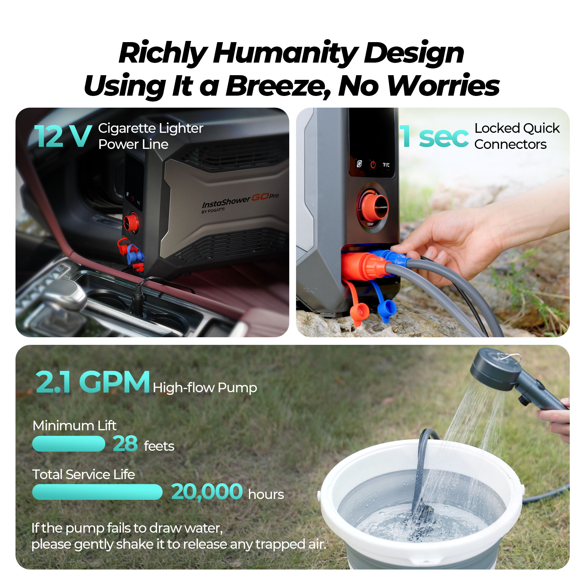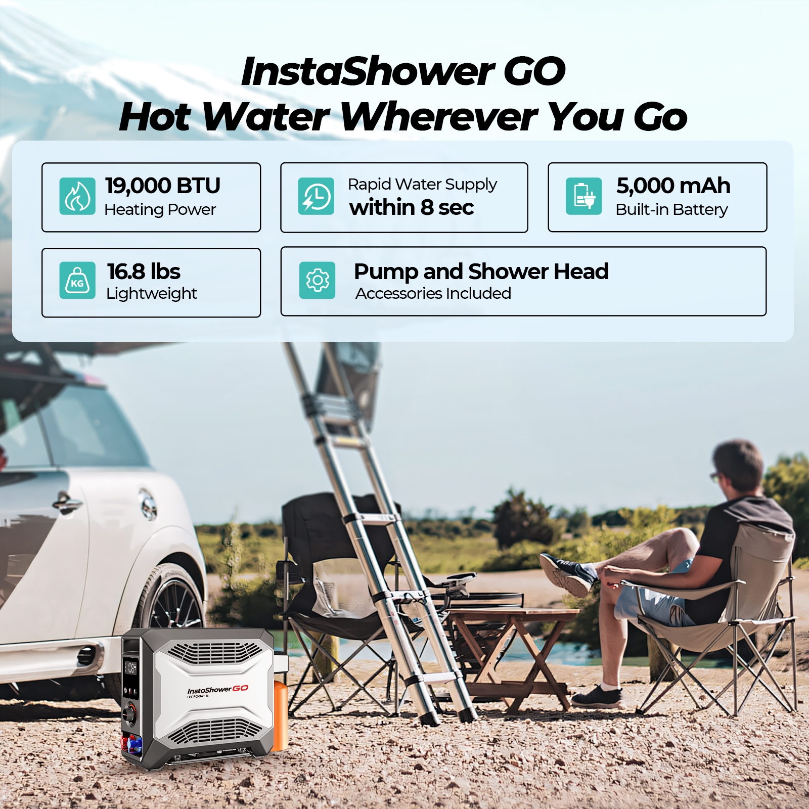 As an industry leader in RV and portable tankless water heating, Fogatti tankless camping water heater InstaShower Go revolutionizes convenience with its compact design, delivering instant hot water on-the-go for all your outdoor adventures, ensuring you never have to compromise on comfort.