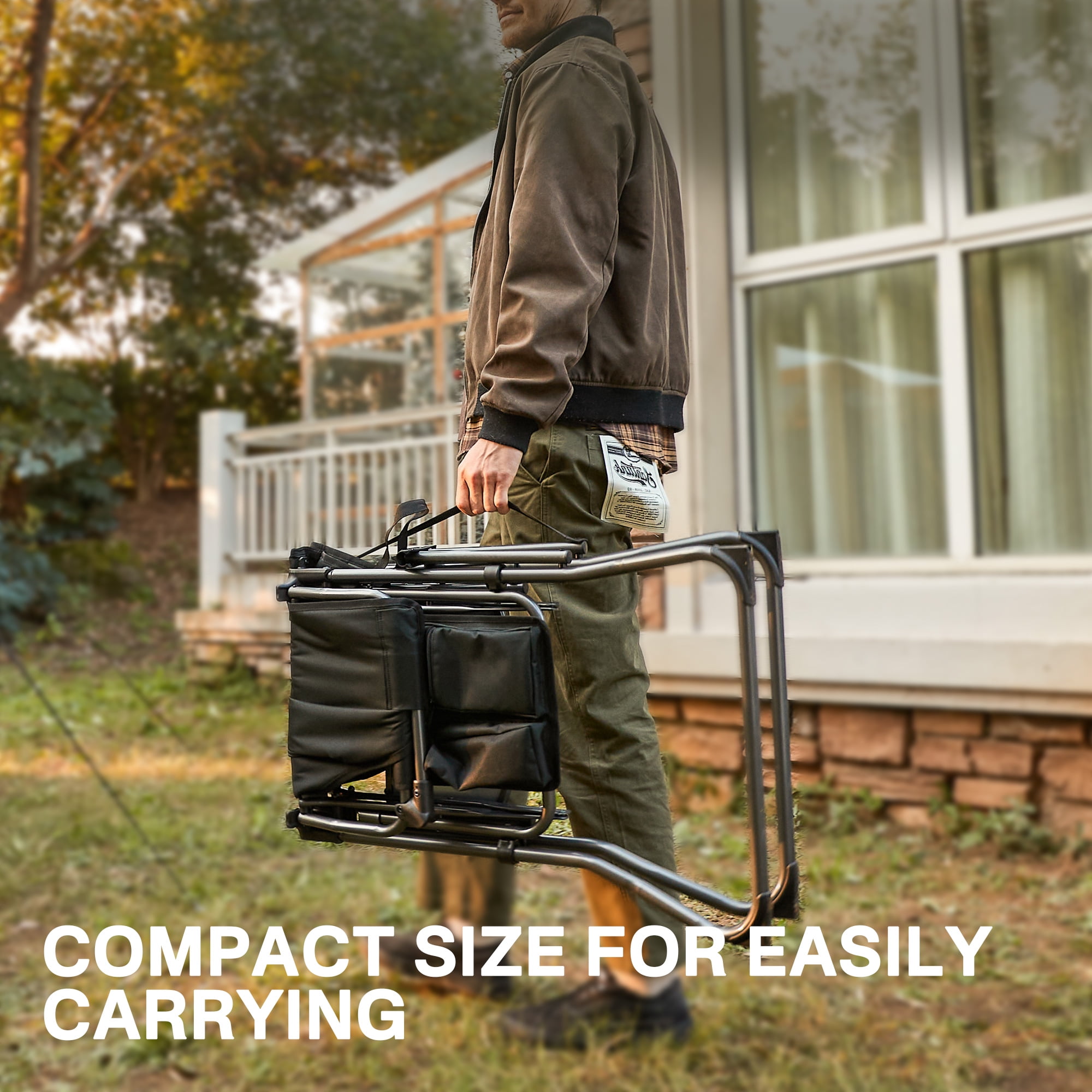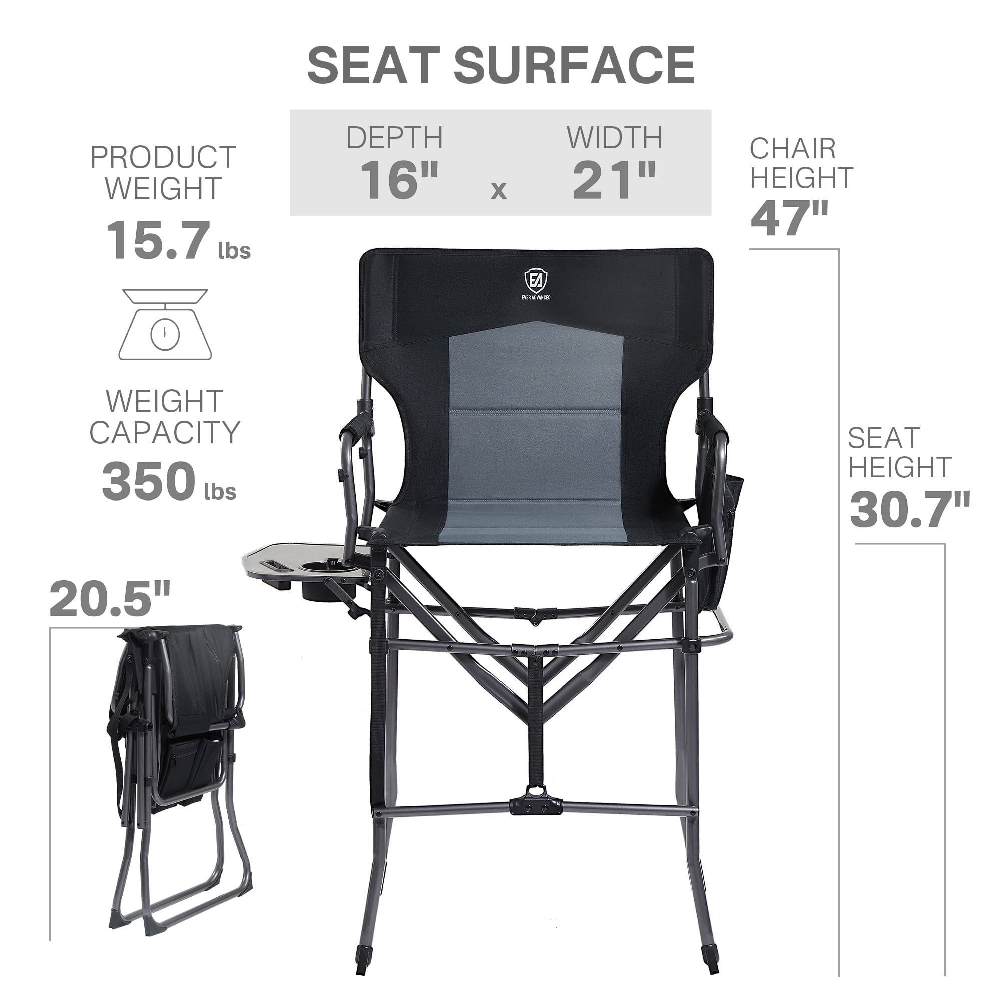 30.7″ SEAT HEIGHT: Enjoy a better view with 31″ high seats. It’s easy to seat in and out also. It will be great to use in craft shows, camping or watch children’s games and training! SIDE TABLE & POCKETS: The side table and cup holders can place your bottles and cups. The multifunctional side pocket can keep your phone and keys within reach. Makeup artists can also place makeup cases and brushes. The mesh pocket at the bottom provides additional storage space. COMPACT & PORTABLE: It’s designed with a folding size of 20.5″ x 5″ x 30.7″, which is more space saving and easier to carry than a regular director’s chair when folded. The handle design makes it easy to take to the desired location. SUPERIOR MATERIALS: Foam pad lining, handrail and foot tube let your hands and feet relax. The thickened metal pipes make this chair more stable and durable. It can bear a maximum weight of 350 pounds.