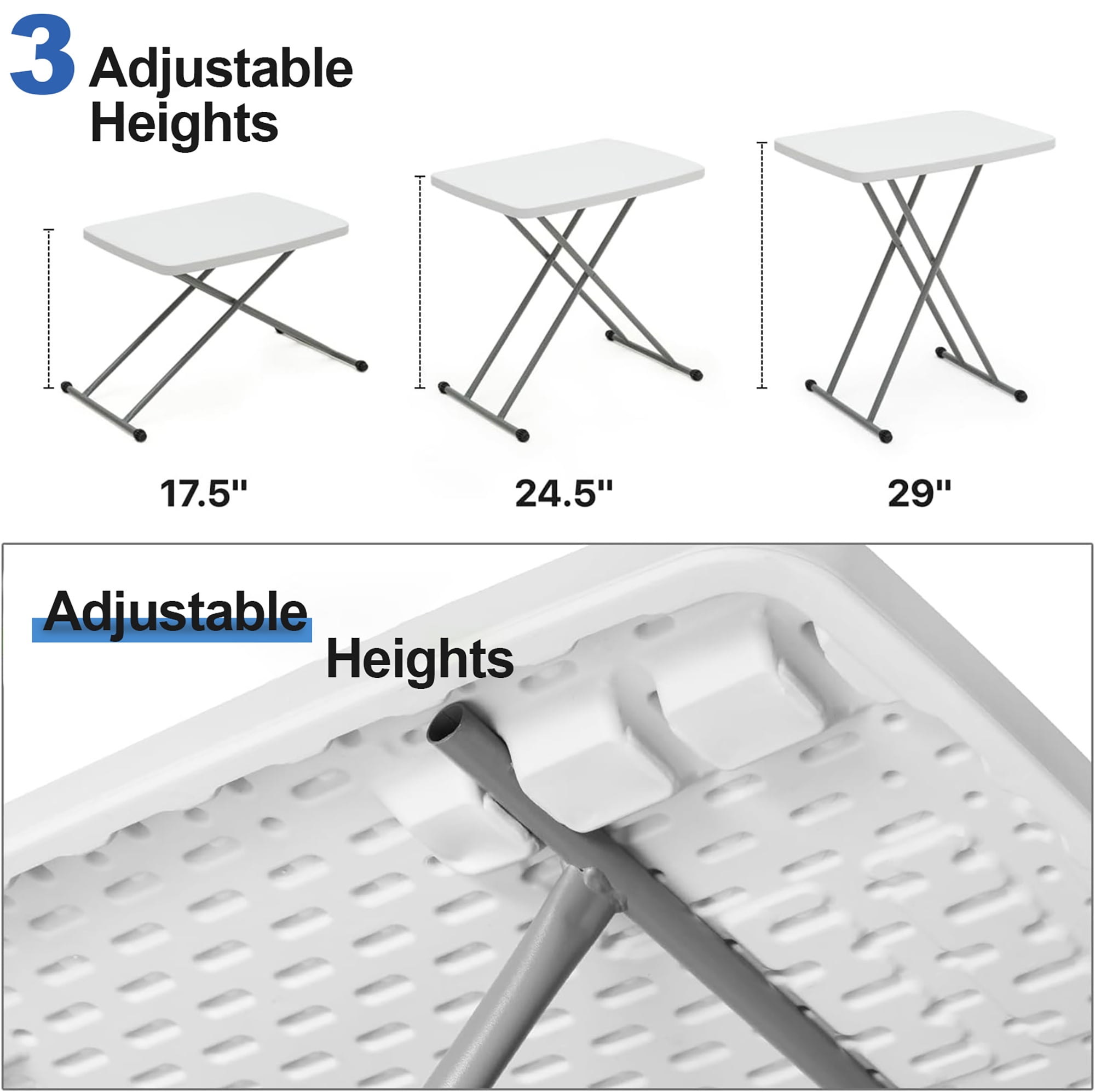 VERSATILE USAGE, ANYWHERE & ANYTIME – Perfect for parties, workspaces, or leisure. Crafted with heavy-duty polyethylene plastic and steel, offering durability and style. Ideal for both indoor and outdoor activities. ADJUSTABLE HEIGHT OPTIONS – Customize your experience with multiple height settings, catering to various needs. From 21″ to 28″, find the perfect fit for your TV dinner table or crafting station. EASY STORAGE & TRANSPORT – Effortlessly fold flat for compact storage, ensuring convenience when not in use. Take this lightweight, portable table anywhere, thanks to its collapsible design. DURABLE & EASY TO CLEAN – Built tougher than wood, this table resists splitting, chipping, and peeling. Stain-resistant surface allows for hassle-free cleaning, making it suitable for all occasions. SLEEK DESIGN, TIMELESS APPEAL – With minimalist aesthetics, this small folding table seamlessly blends into any space. Its compact size makes it ideal for small areas while providing multiple functionalities.